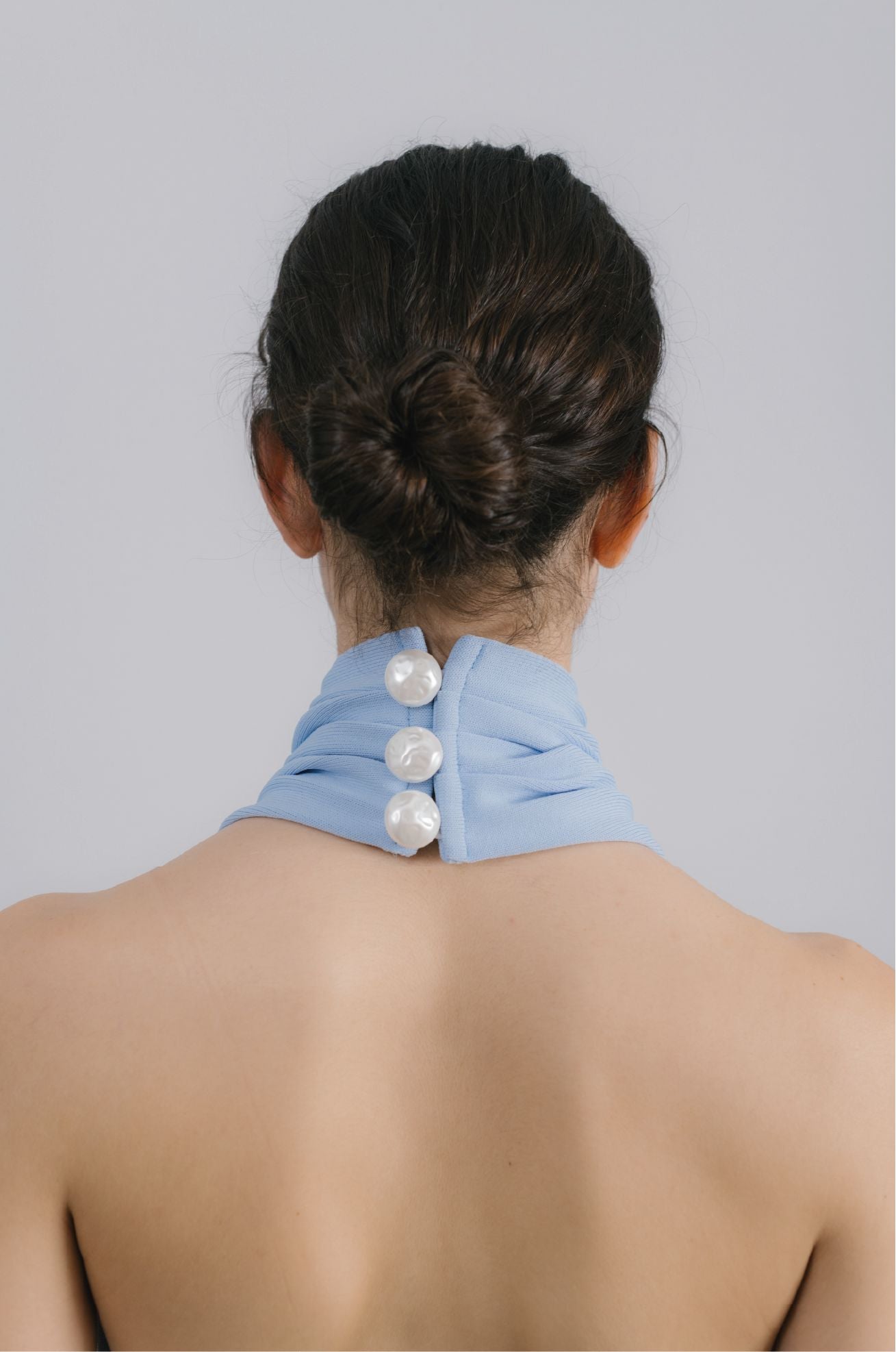 How to wear it? Cross the part right of the top to your left and do the same with the left part. Then button the three pearls on your neck and you will have this front-cross effect of the top.
