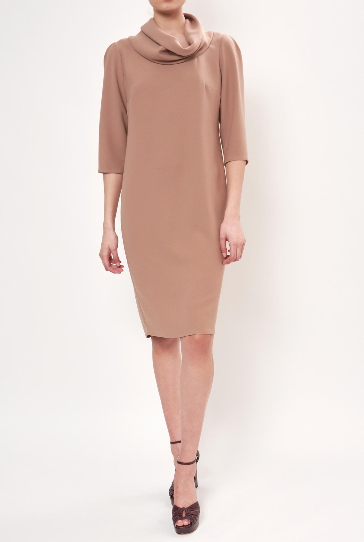 Vestido de crepe, media manga y largo midi. Cuello asimétrico Cremallera trasera invisible. Diseñado por Ulises Mérida.