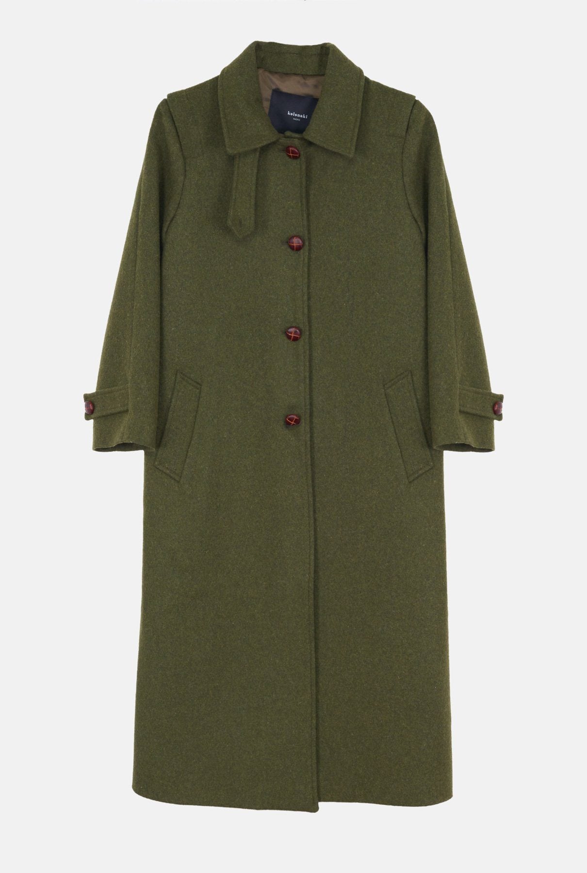 Abrigo largo loden de paño verde con forro de viscosa. Se pueden acoplar la capucha Landan y el abrigo Lilibet. Ambas prendas se venden por separado.