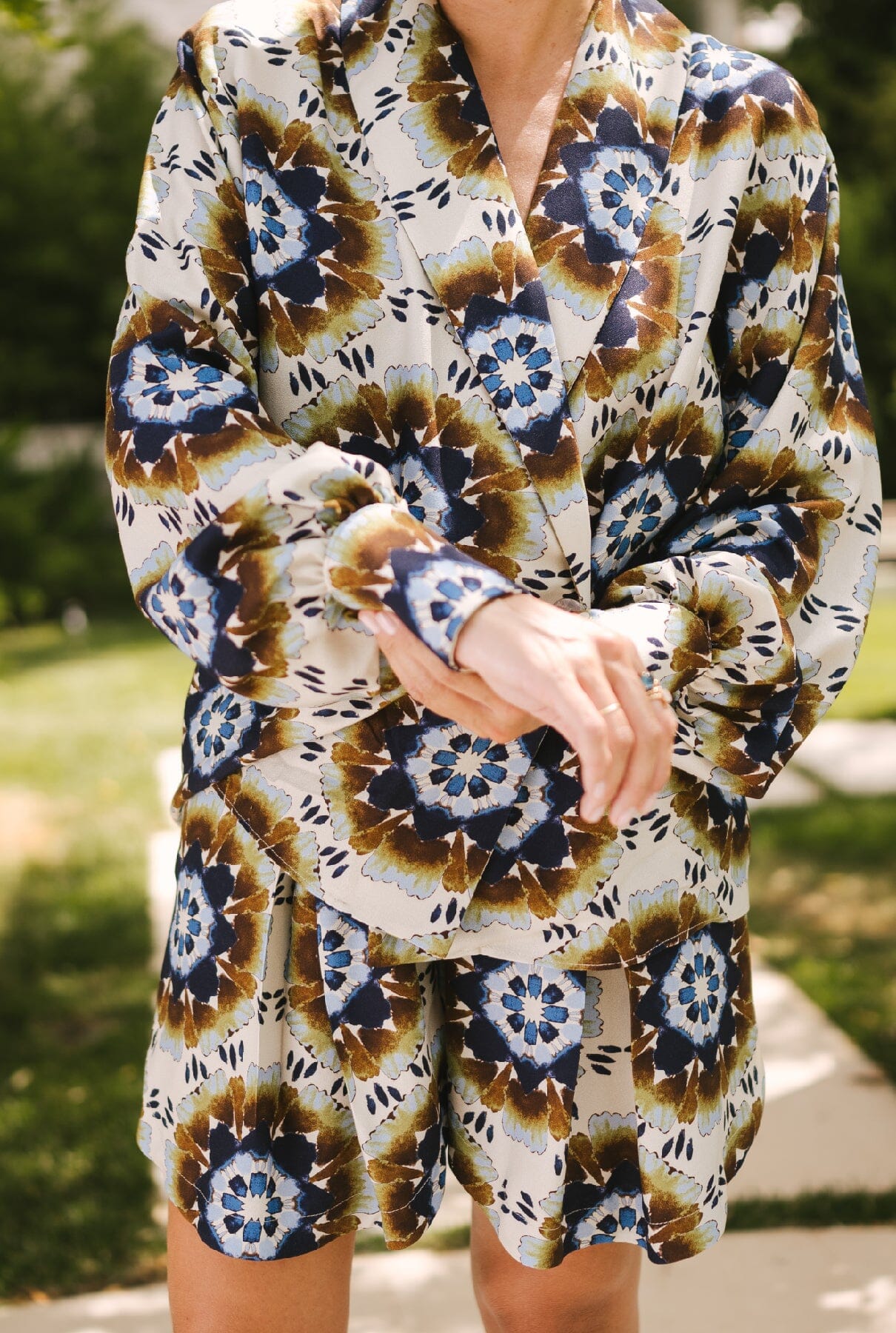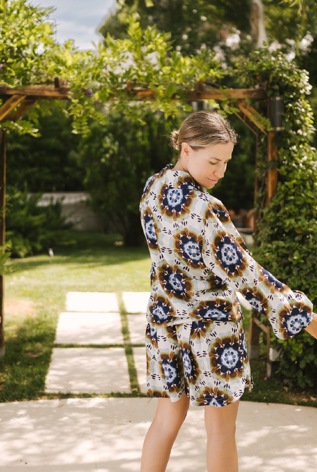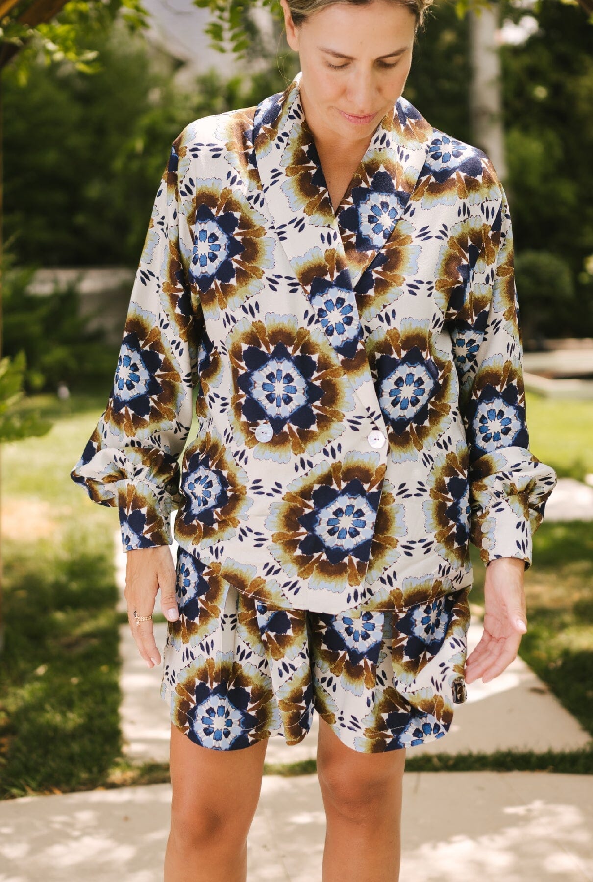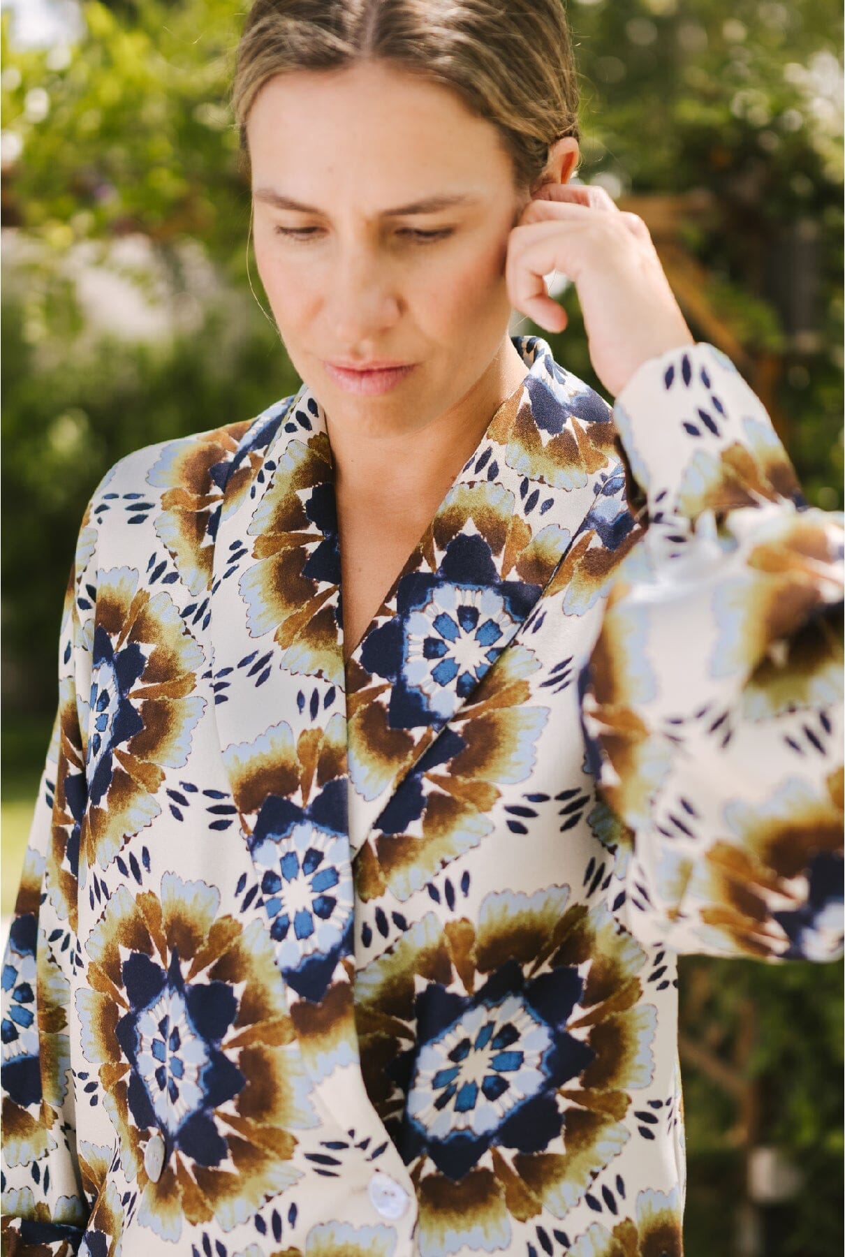 Camisa de la colección Reinvention by Mariola Leal, reutilizando tejidos sobrantes. Tiene manga larga abullonada, cuello smoking y hombreras. Se cierra con 2 botones grandes de nácar en la parte delantera y 2 pequeños en los puños. Para completar el look, se puede combinar con la bermuda mosaico Elisa.