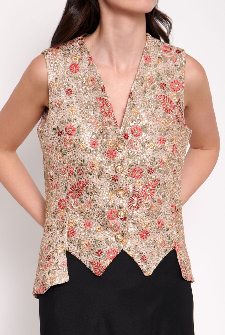 Diseño realizado en tela bordada con flores en hilo dorado. Escote en pico y cierre delantero con botones joya dorados. Detalle de bajo asimétrico y picos en la parte delantera. Forrado en raso.