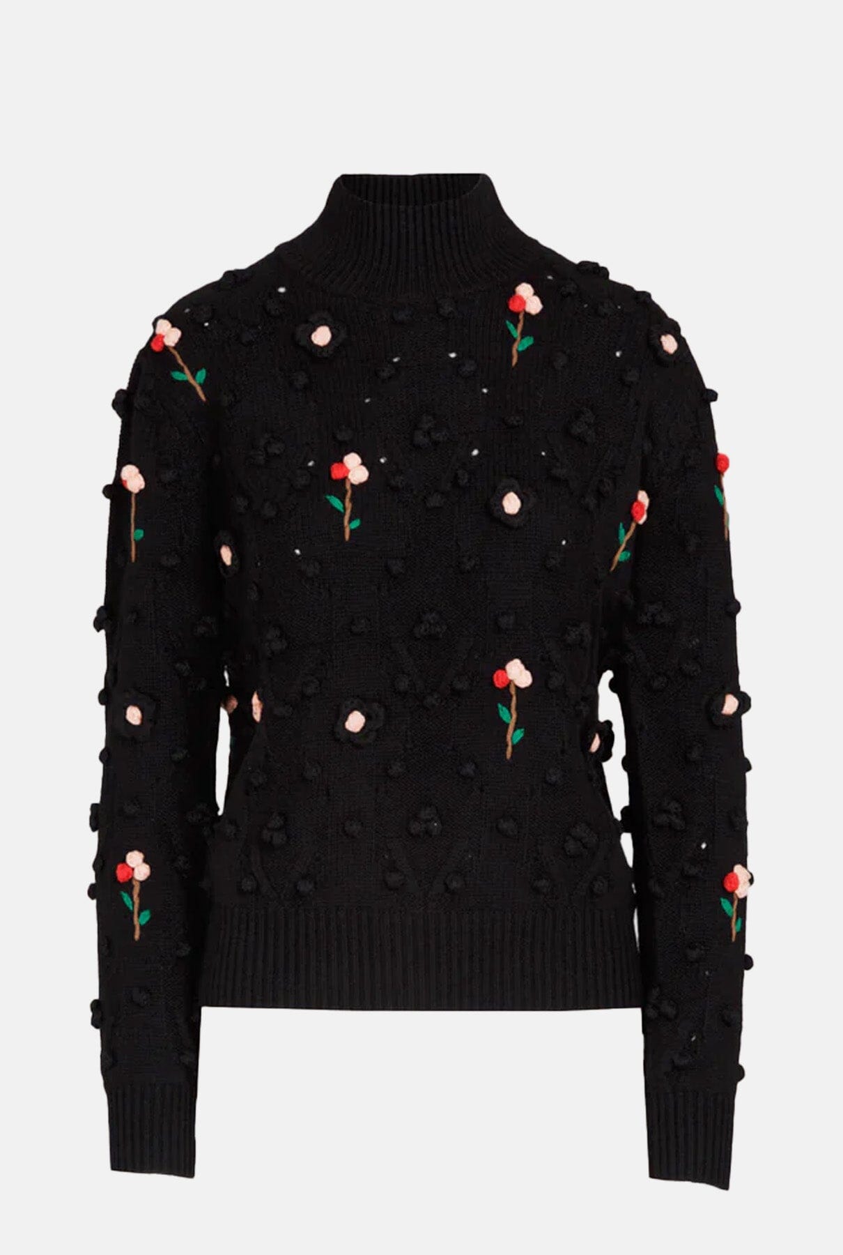 Este encantador jersey de punto negro presenta un elegante cuello alto que le aporta calidez y estilo. Adornado con delicadas flores en tonos rosa y adorables borlas blancas, le aporta un toque femenino y divertido a la prenda. Perfecto para los días más fríos, este jersey combina comodidad y un diseño llamativo que lo convierte en una opción ideal para cualquier ocasión.