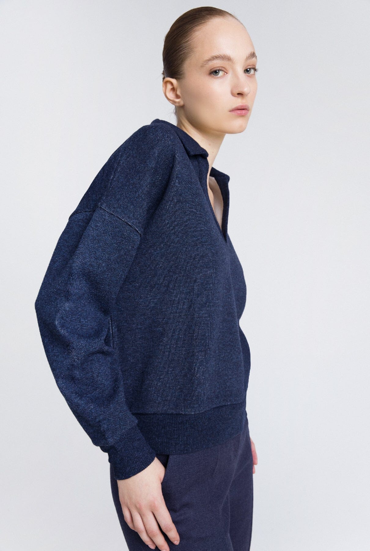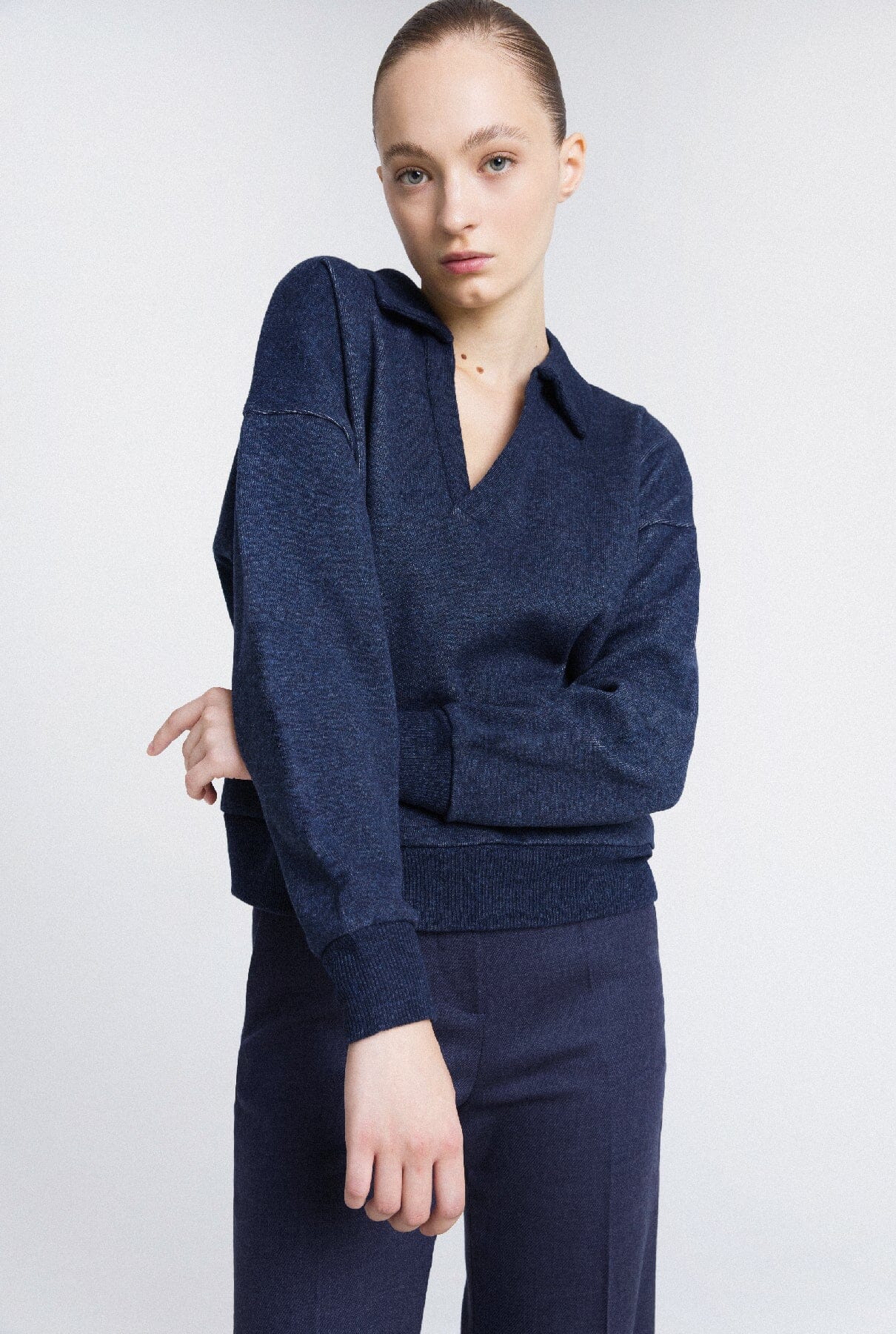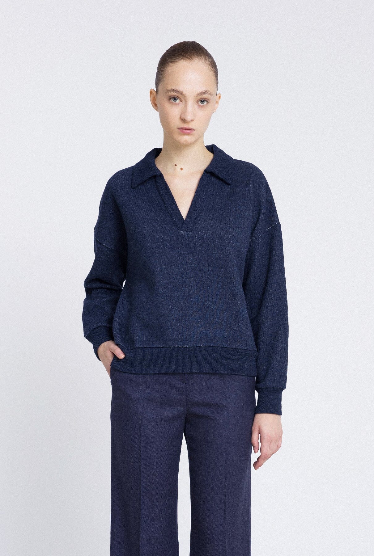 El jersey polo azul marino es un nuevo básico en la línea de punto de la marca. Su confección en lana, algodón y cachemir, junto con su diseño minimalista y atemporal, lo convierten en una pieza irreemplazable, capaz de adaptarse a cualquier look.