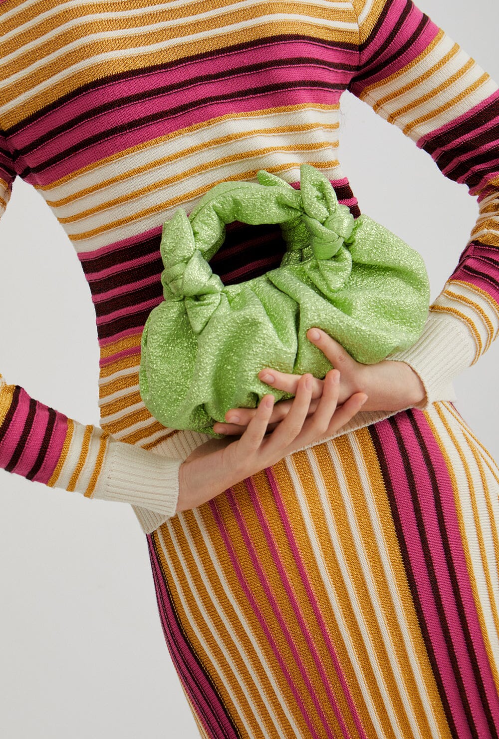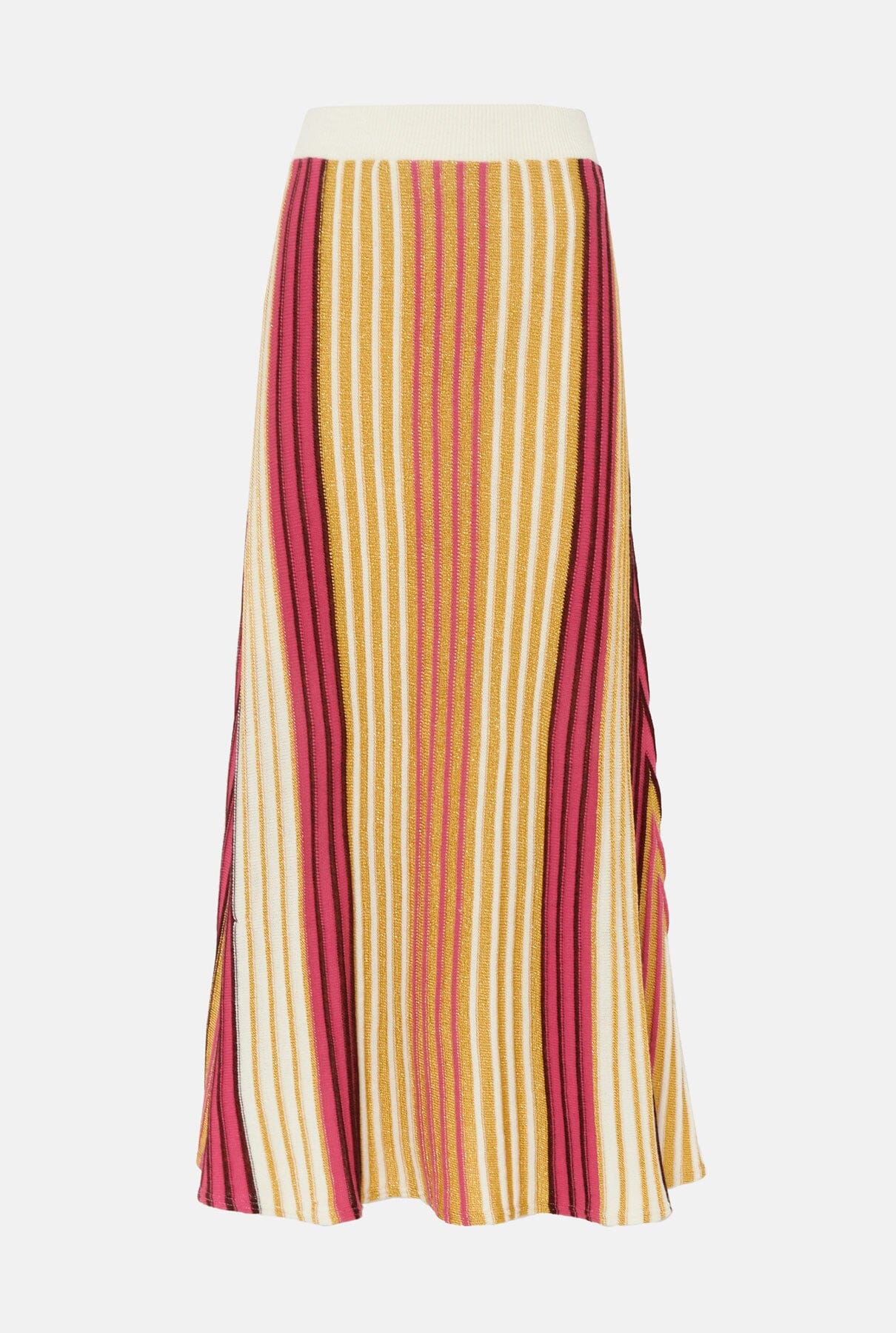 La falda Julia tiene una silueta amplia y acampanada que exhibe rayas de cheurón en tonos elegantes de oro, blanco y rosa. Confeccionado en España con tejido italiano de cashmere y lana merino de Zegna Baruffa.