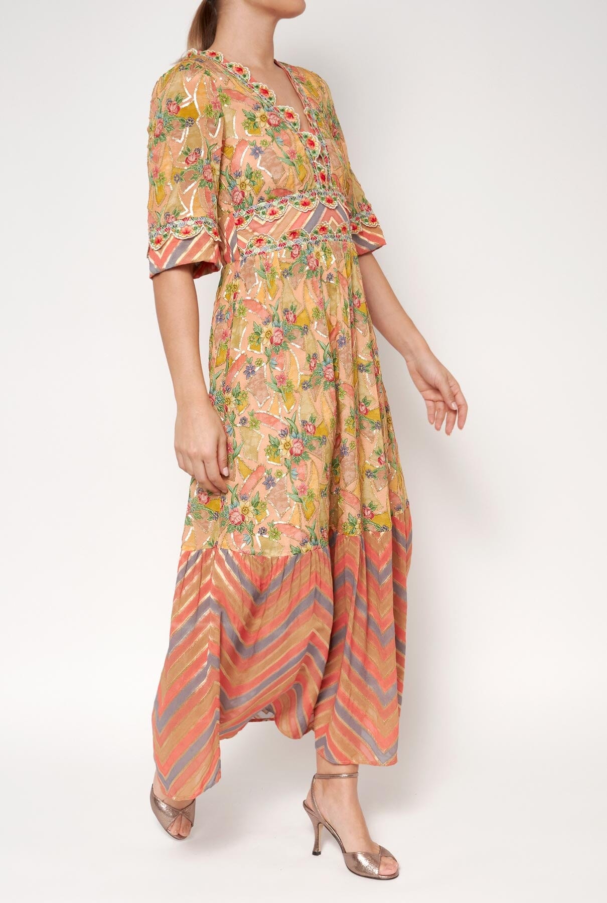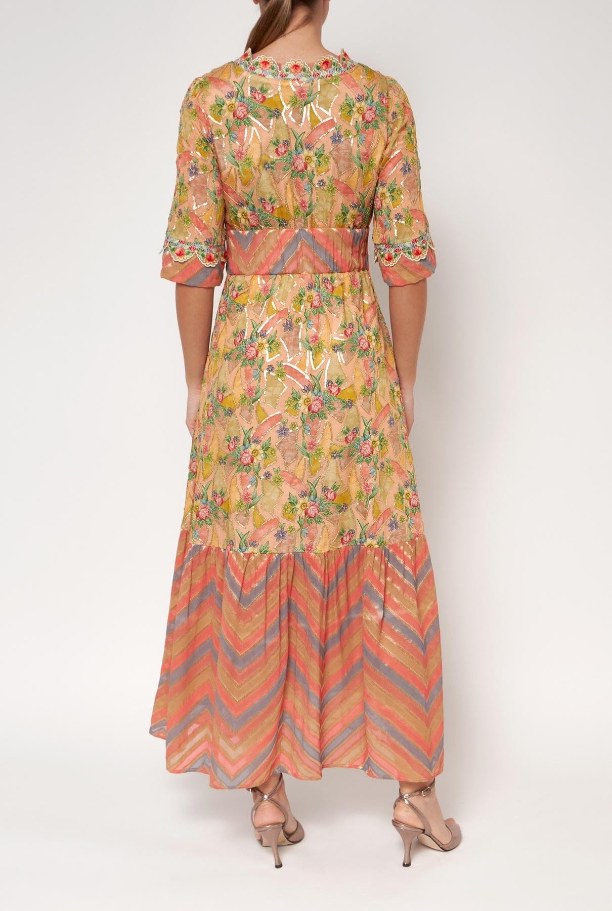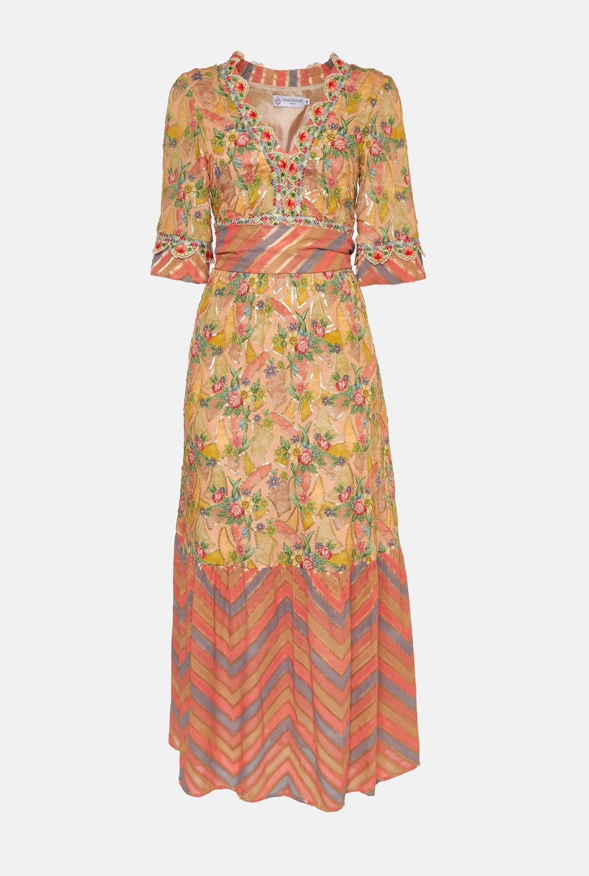 Romántico y femenino, el vestido largo “June” es una preciosa opción para una ocasión especial. Confeccionado en gasa vaporosa con mezcla de estampados. Escote en pico, manga al codo y corte en la cintura rematado con un delicado ribete de encaje con bordado floral. Bajo rematado con volante y cintura elástica. Forrado.