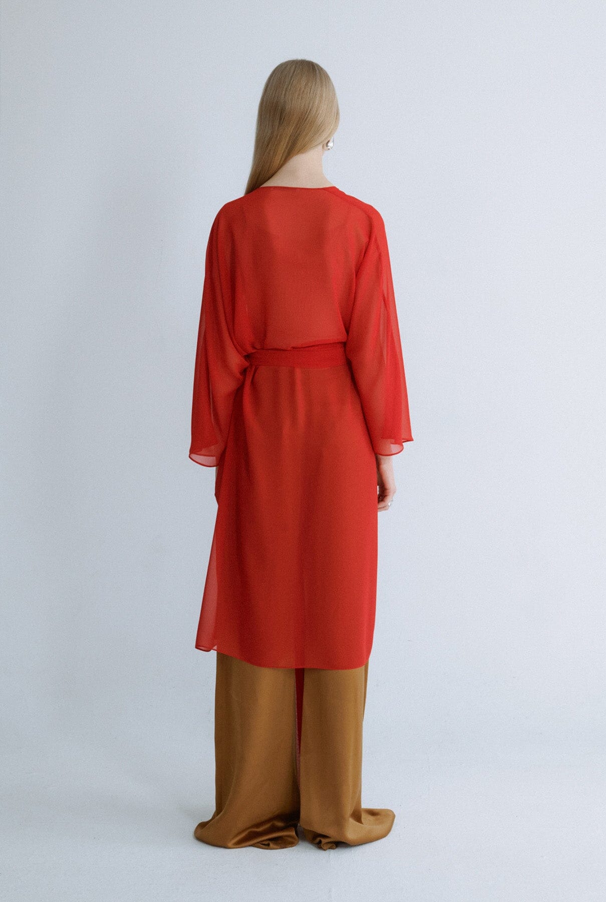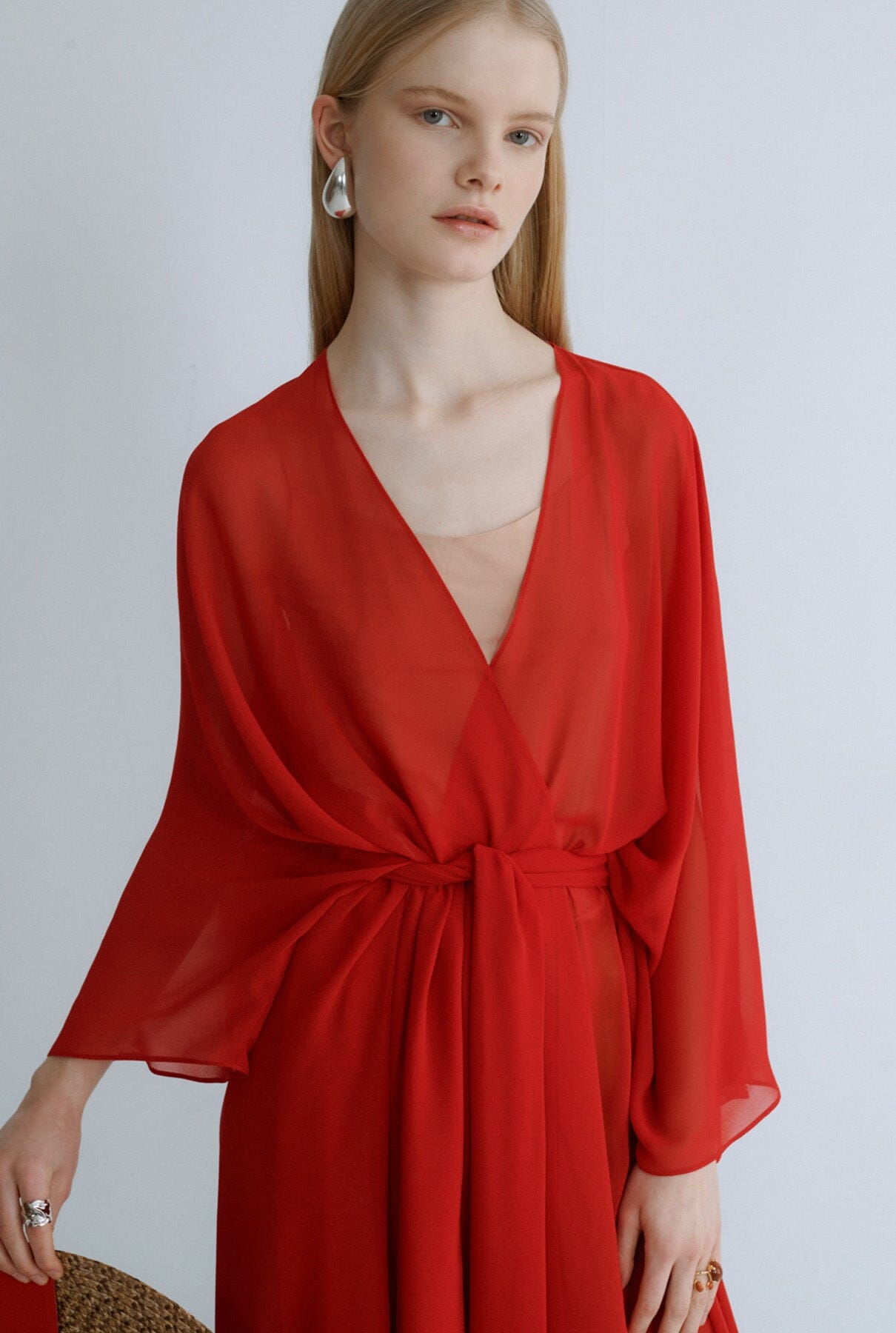 Quimono de georgette rojo de Miguel Marinero. Diseño versátil para llevar con un look casual o vestidos sofisticados. Se abrocha con cinturón con cordones.
