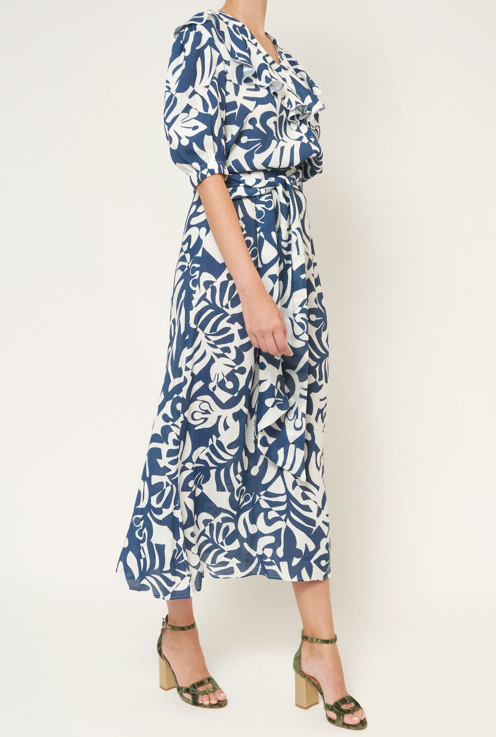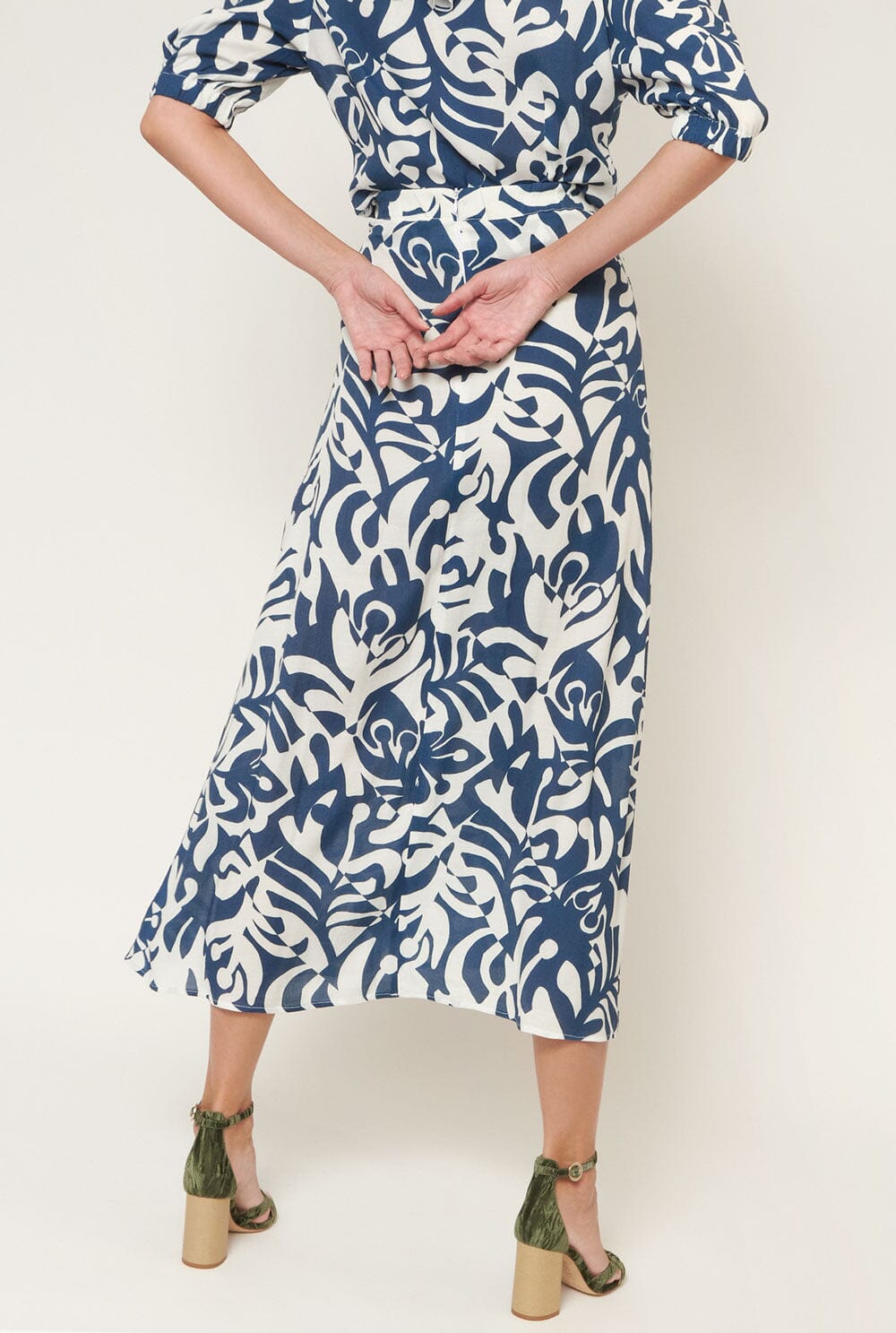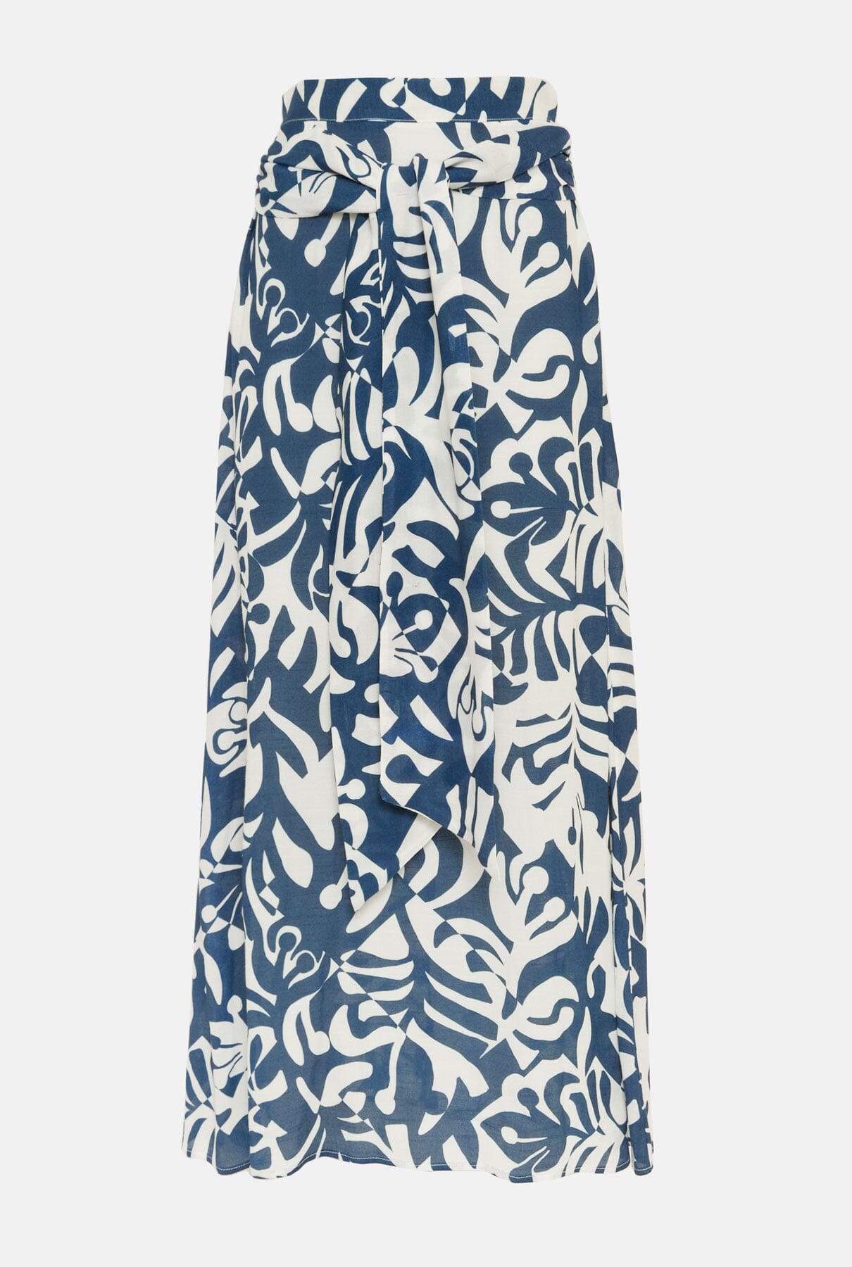 Falda midi estampada en azul y blanco roto. Cierre con cremallera en la espalda y cordones laterales para ajustar la cintura o simplemente de adorno. Lavar a 40 grados, no planchar, no secar en secadora, no limpiar en seco y no usar lejía.