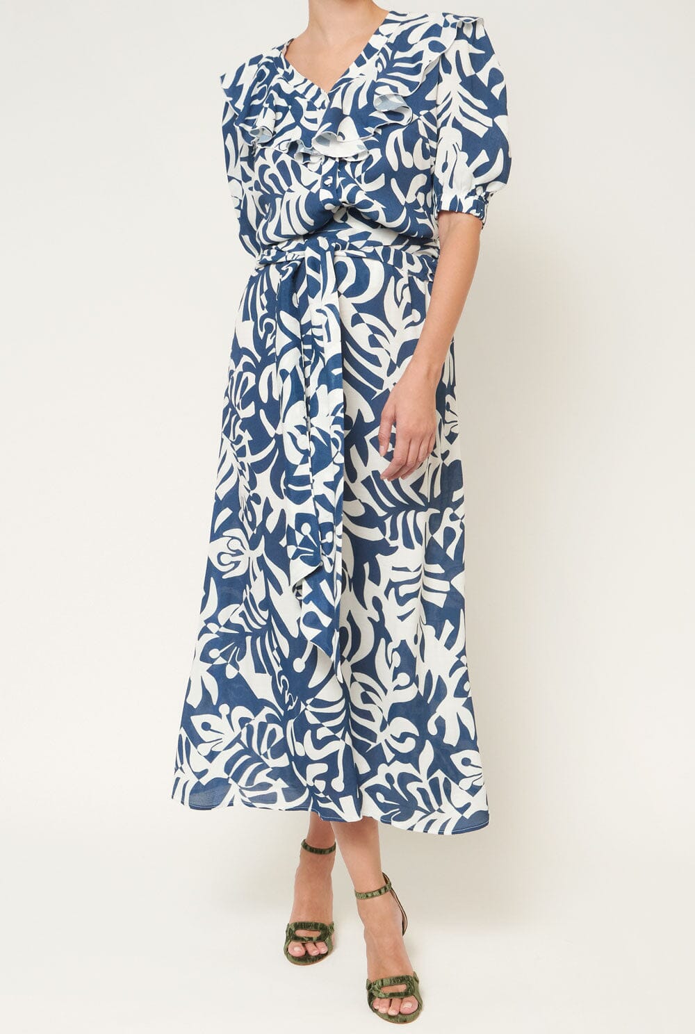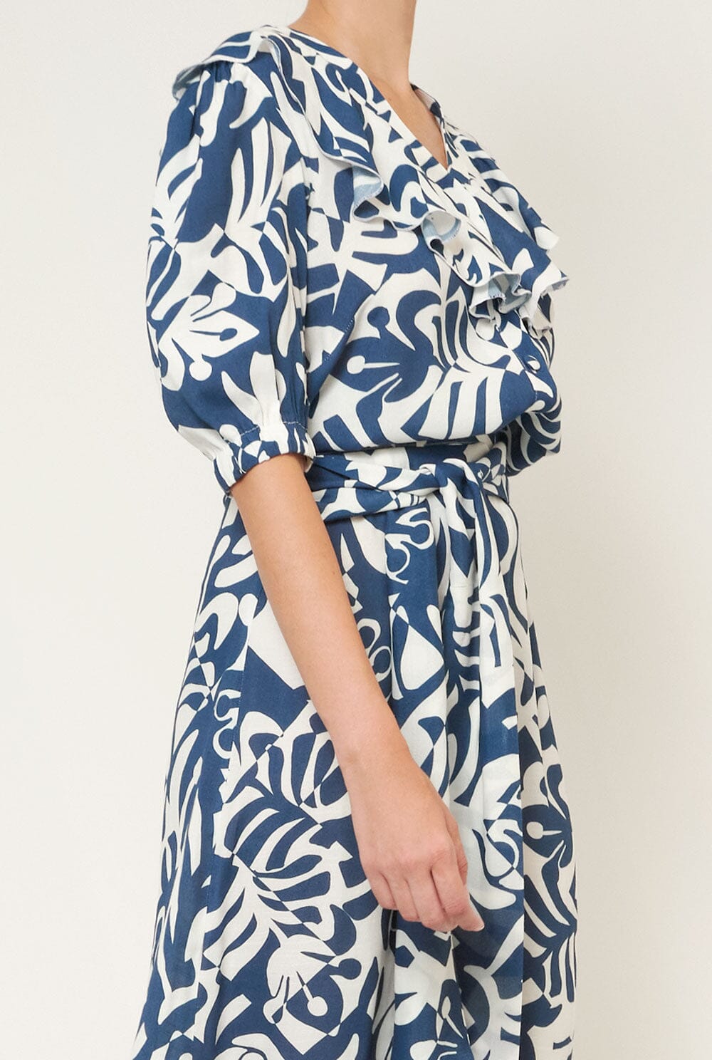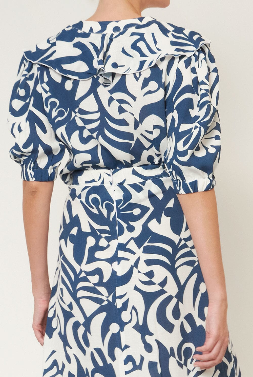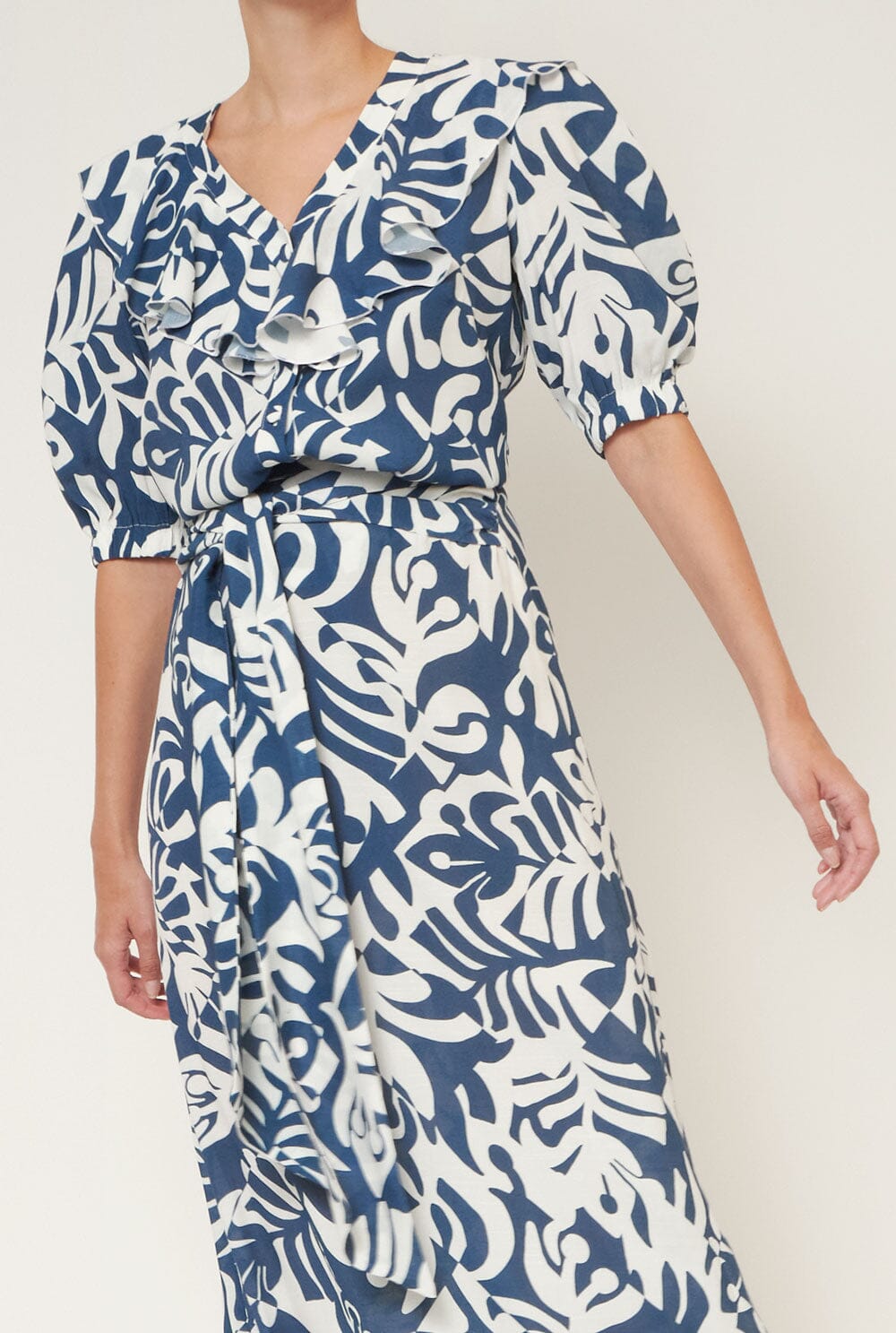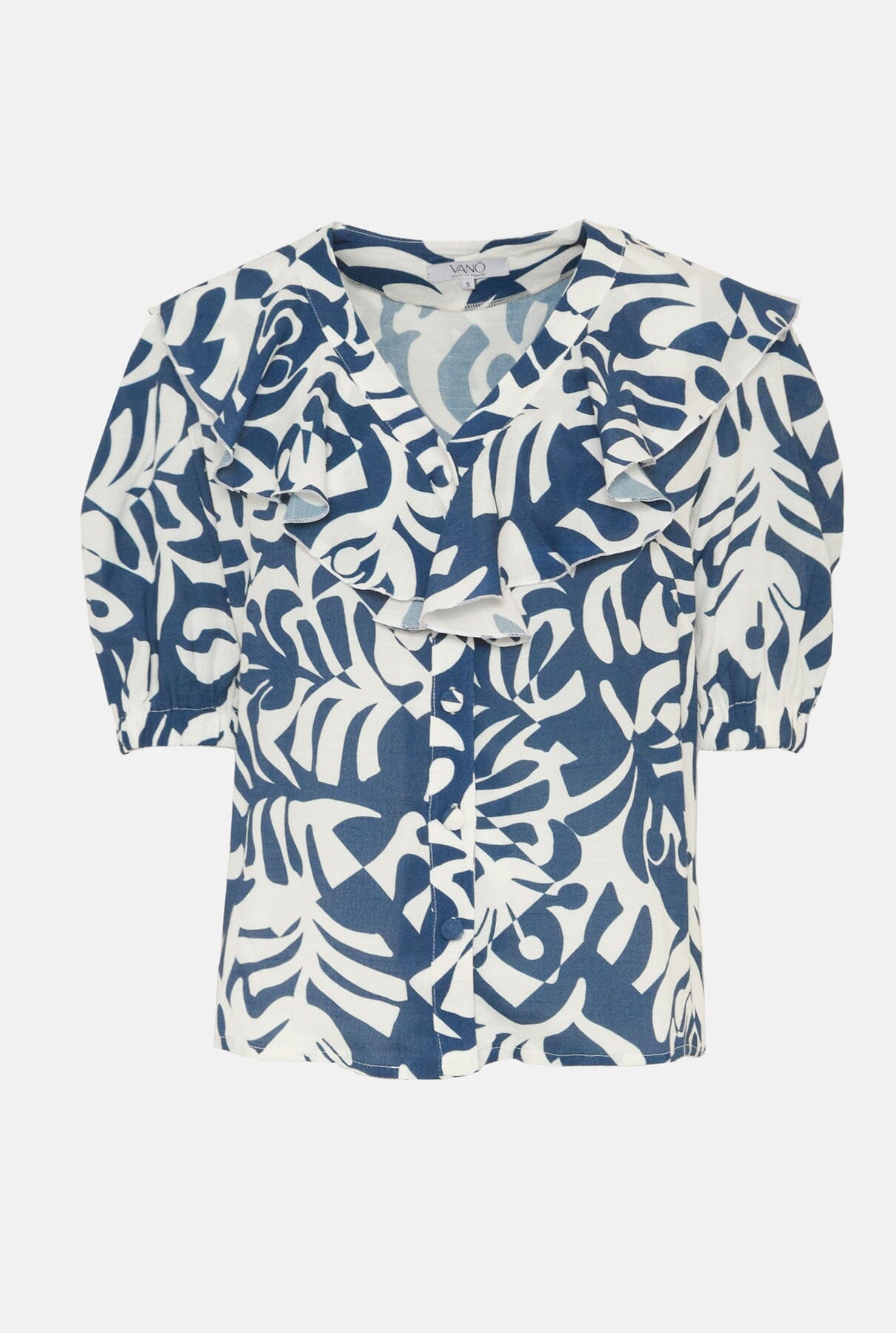 Blusa estampada en azul y blanco roto. Escote en pico, manga corta y cierre delantero con botones. Lavar a 40 grados, no planchar, no secar en secadora, no limpiar en seco y no usar lejía.