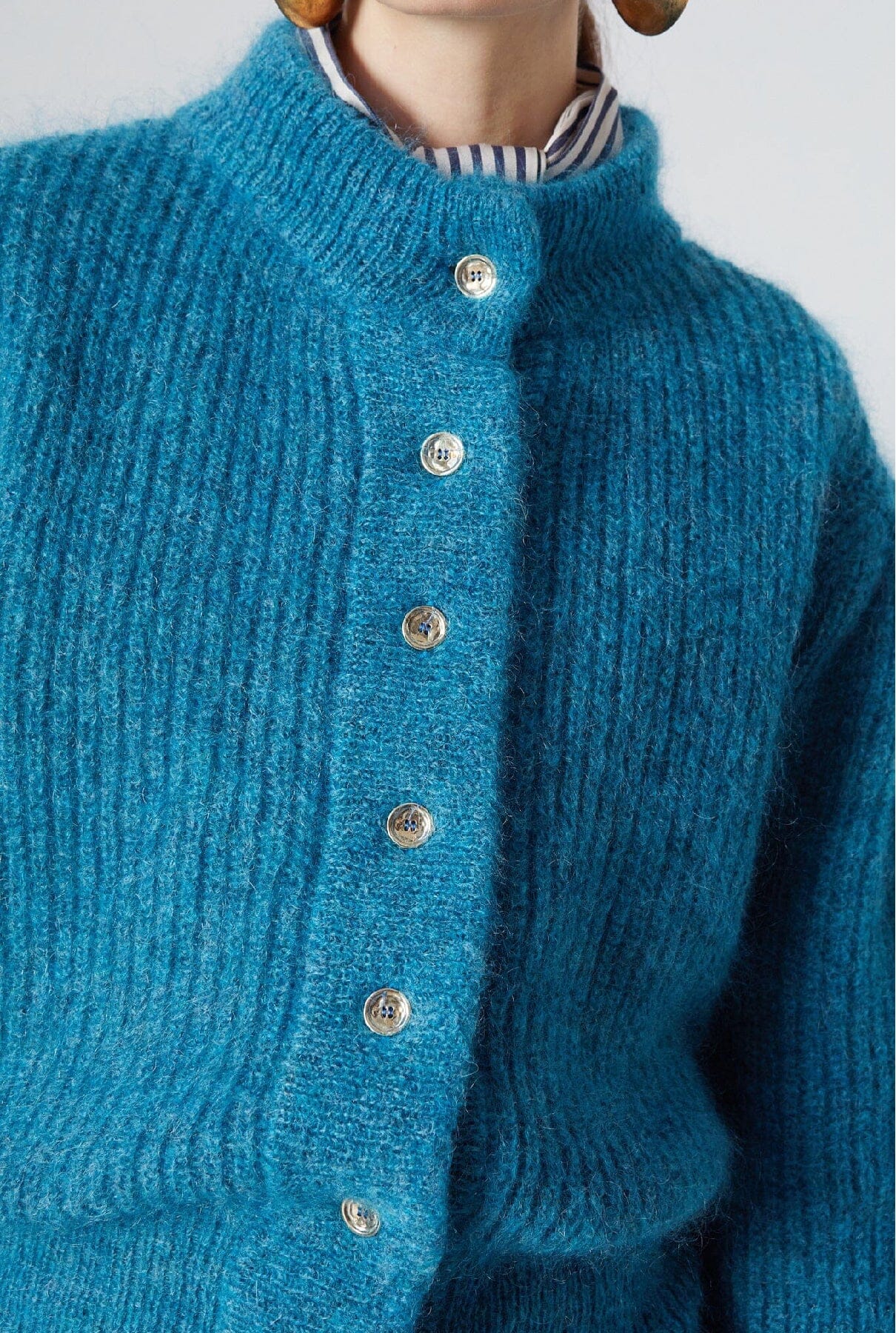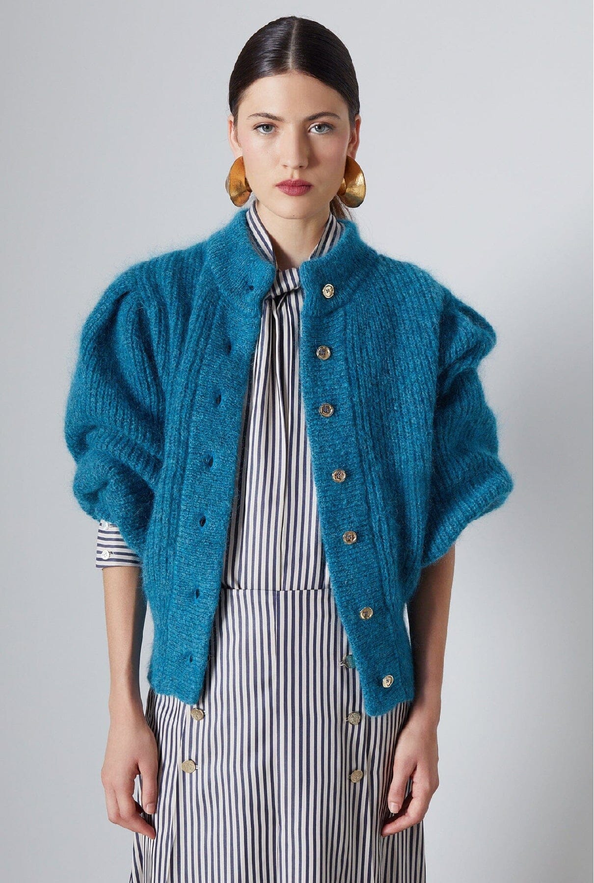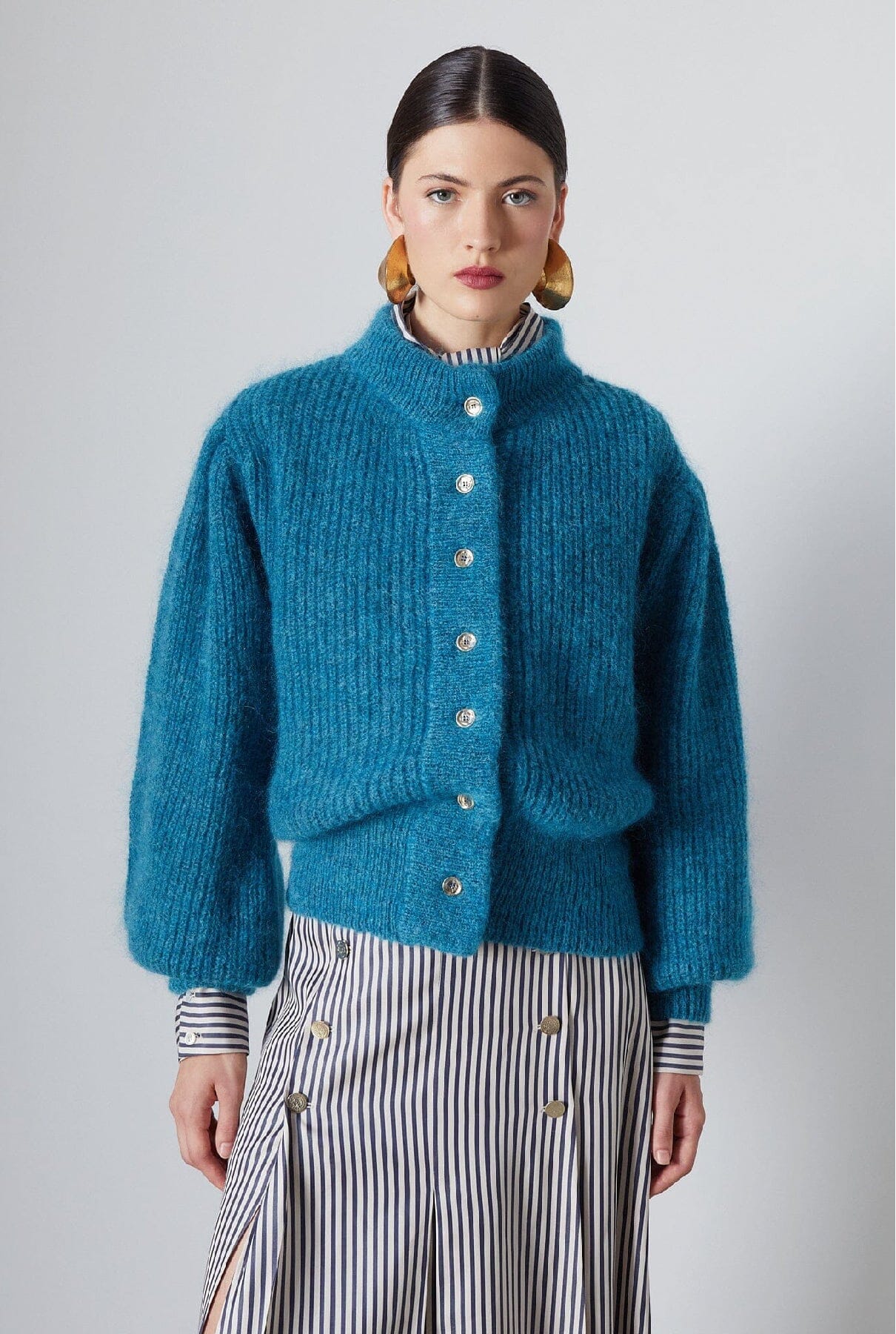 Una prenda de punto esencial para tu guardarropa esta temporada. Con mangas largas abullonadas y un llamativo par de botones dorados, este cárdigan verde azulado te mantendrá abrigada y cómoda durante toda la temporada.