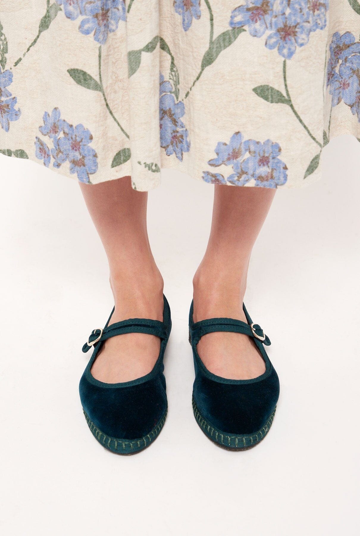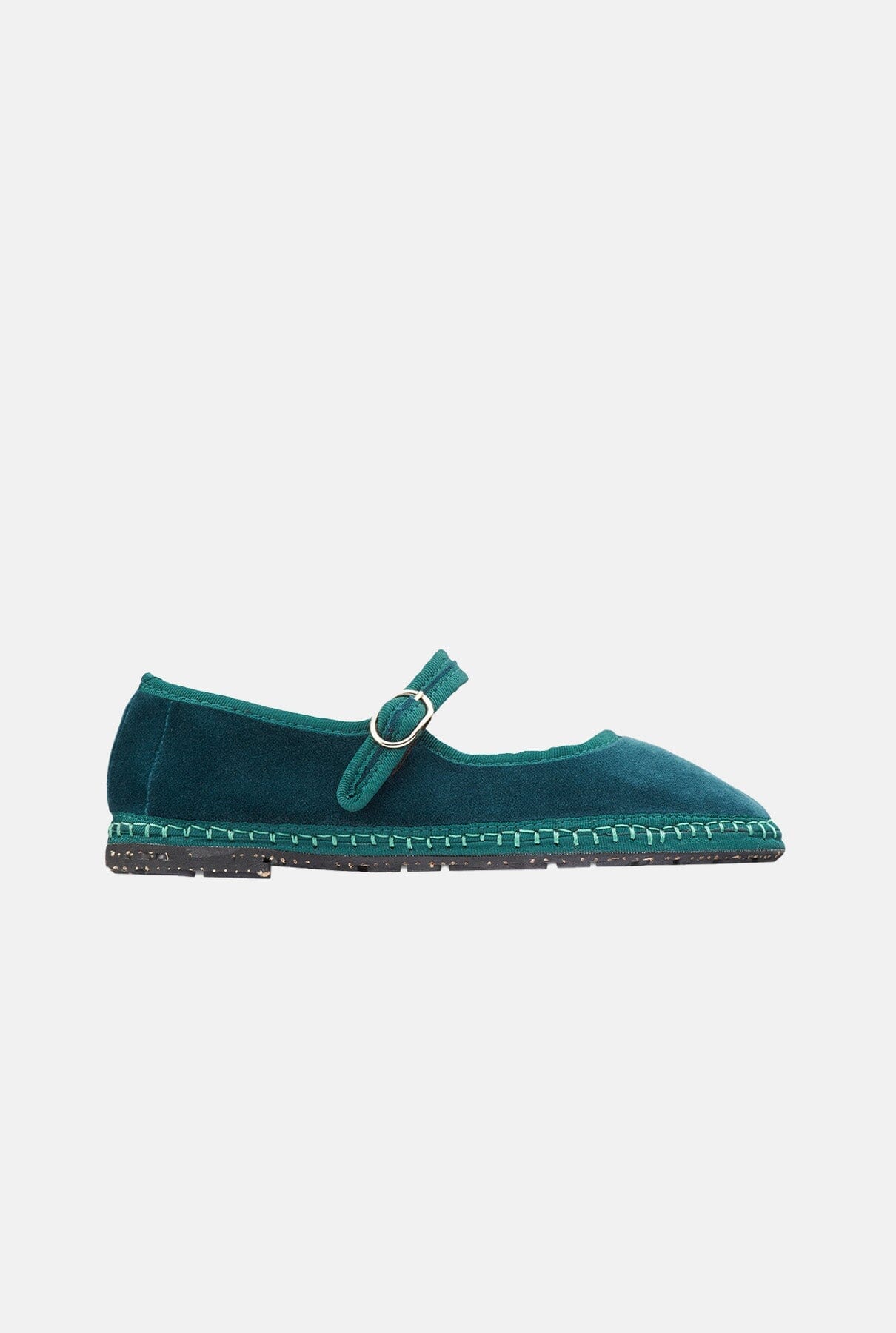 Mercedita de terciopelo en color verde petróleo con vivos verdes y cierre de hebilla. El exterior del zapato es 100% terciopelo de algodón, y el interior del zapato es 100% algodón ecológico con tratamiento antibacteriano. La suela está hecha de caucho procedente de neumáticos de bicicleta reciclados.
