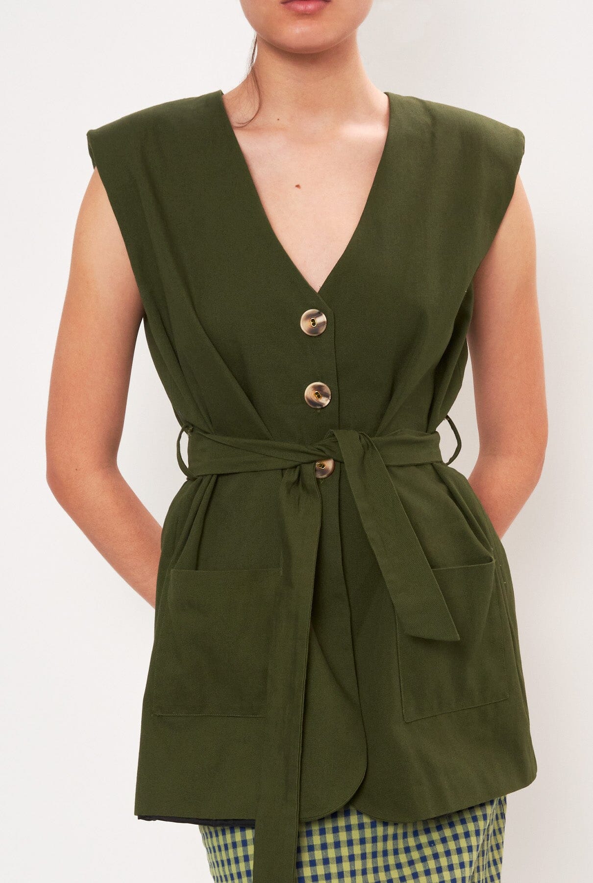 Chaleco largo en lona verde oliva. Preciosos botones en tonos beige y marrón y detalle dorado y cinturón para atar con lazada. Con bolsillos de plastrón y tabla ancha en el bajo de la cinturilla. Para un look completo te sugerimos combinarlo con el pantalón Coro marrones o las bermudas Elisa.