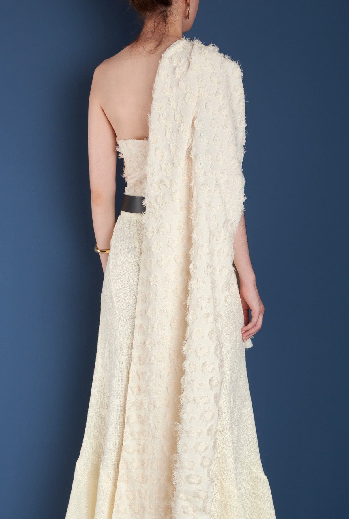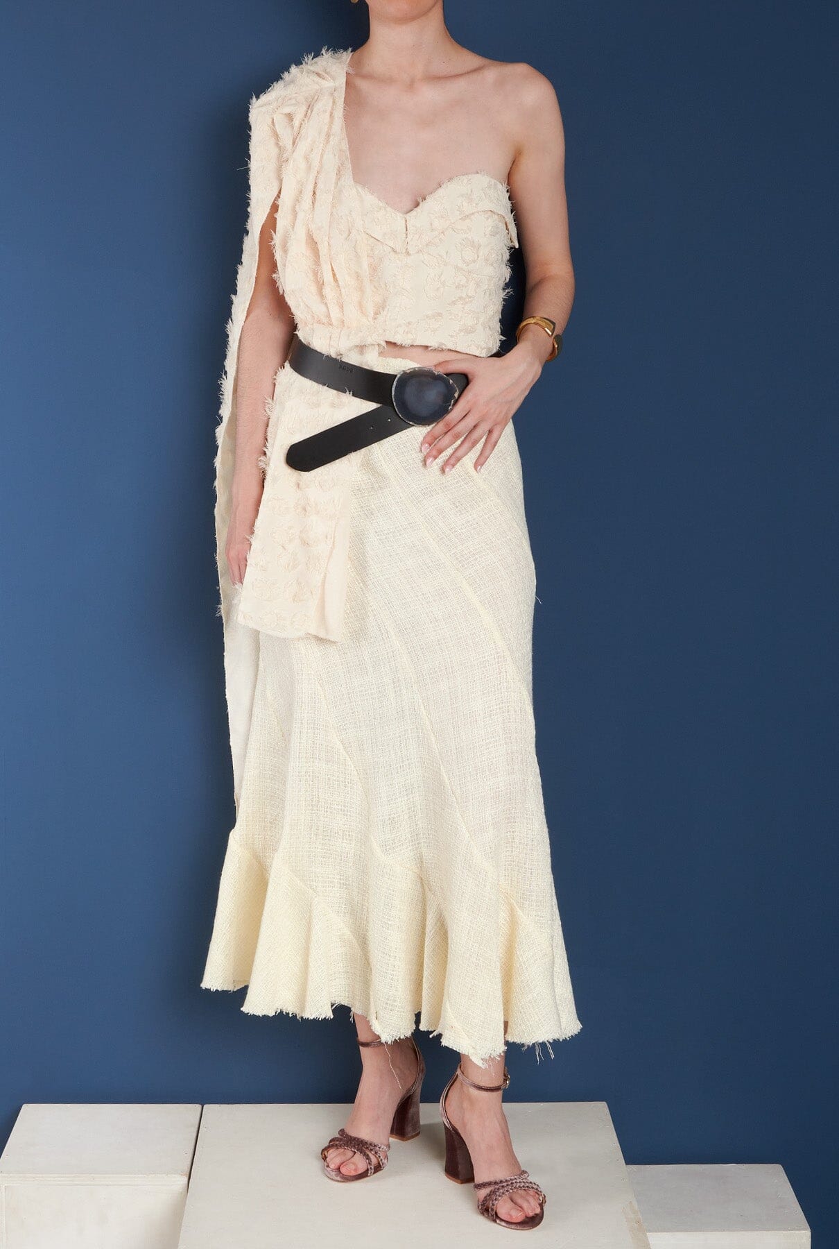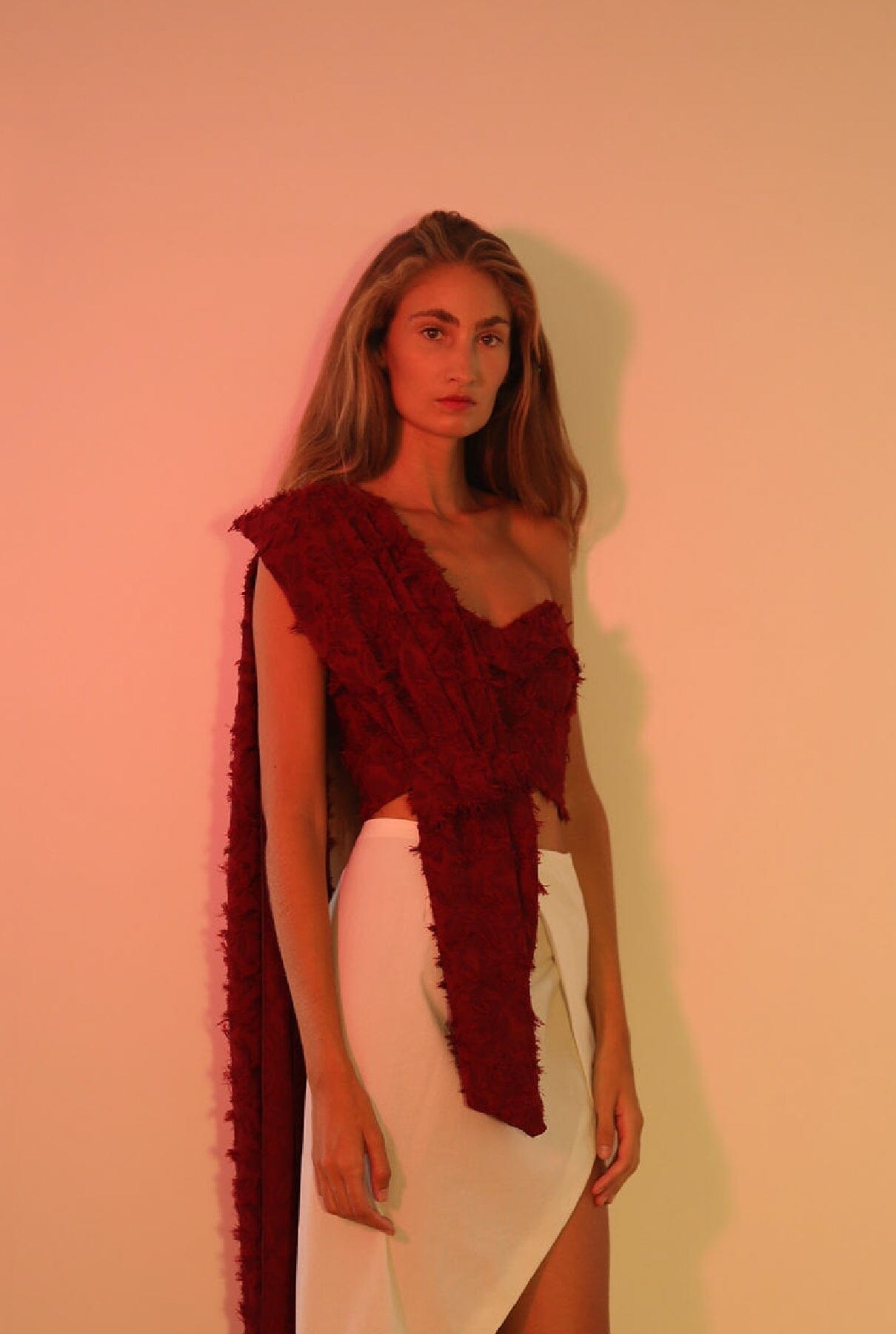 Crop top asimétrico con textura, sin mangas.
