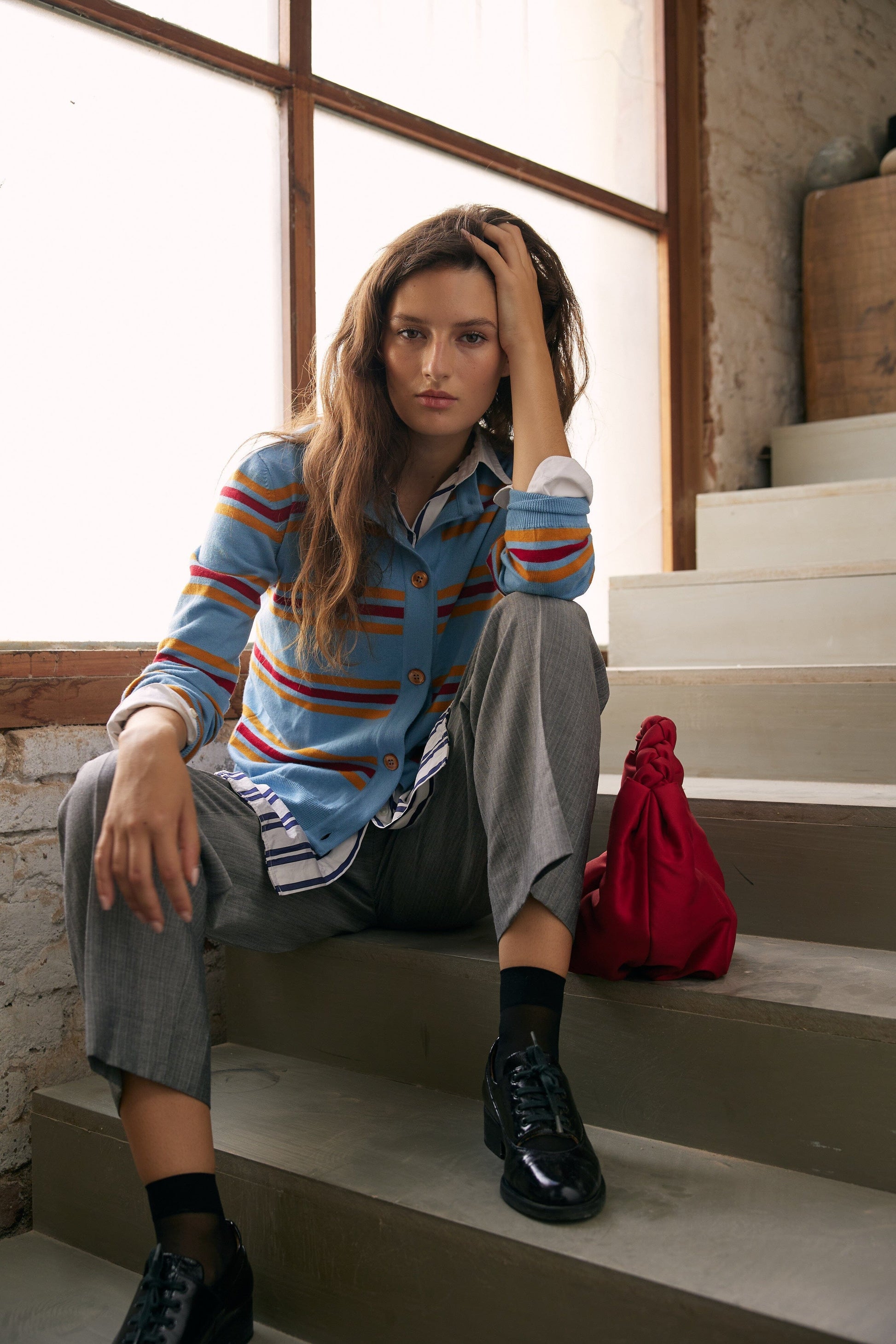 Este suéter de rayas de color verde oliva está elaborado con una mezcla de lana de alta calidad y cachemira. Este jersey está fabricado en España con la mejor lana italiana de Zegna Baruffa. Combínalo con jeans y mocasines o con un traje a medida.