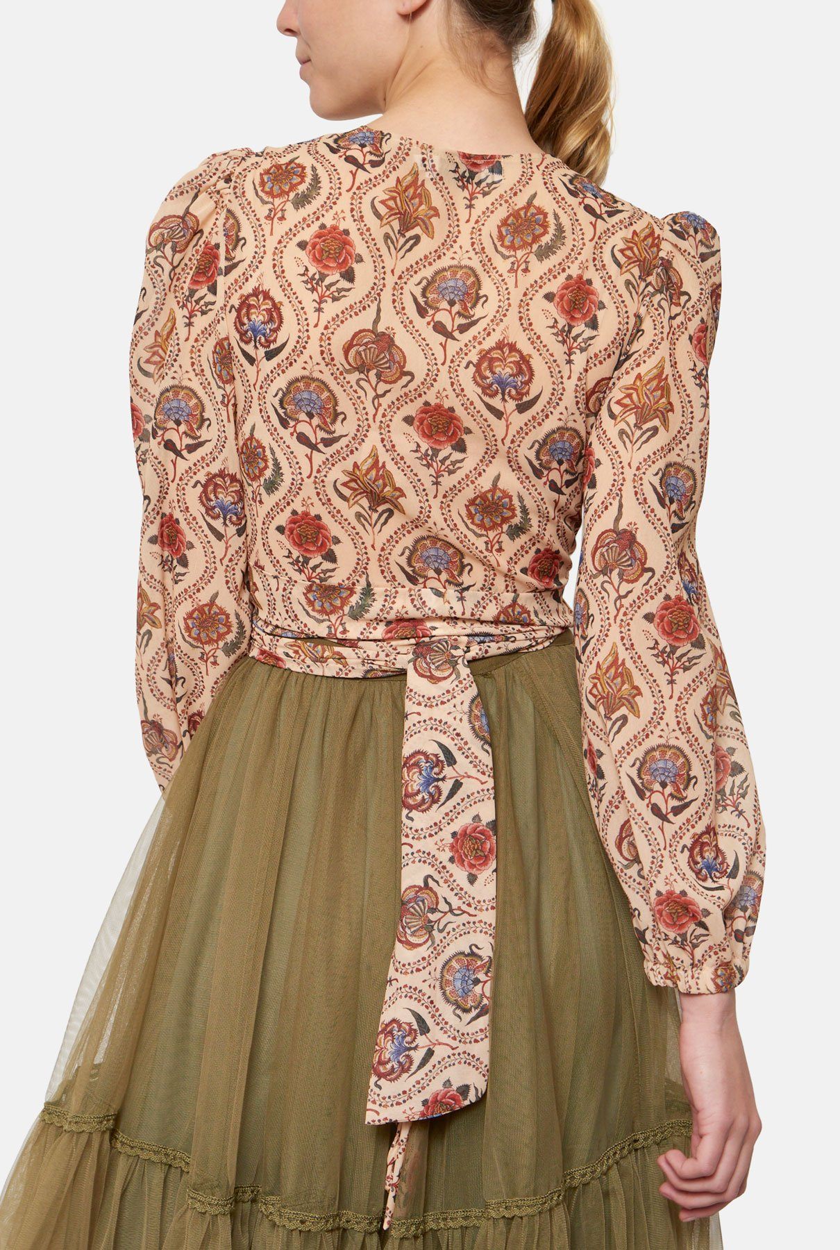 Top con escote en pico y manga abullonada que cae con elástico. Cierre con lazo delantero. Diseñado por Leyre Doueil