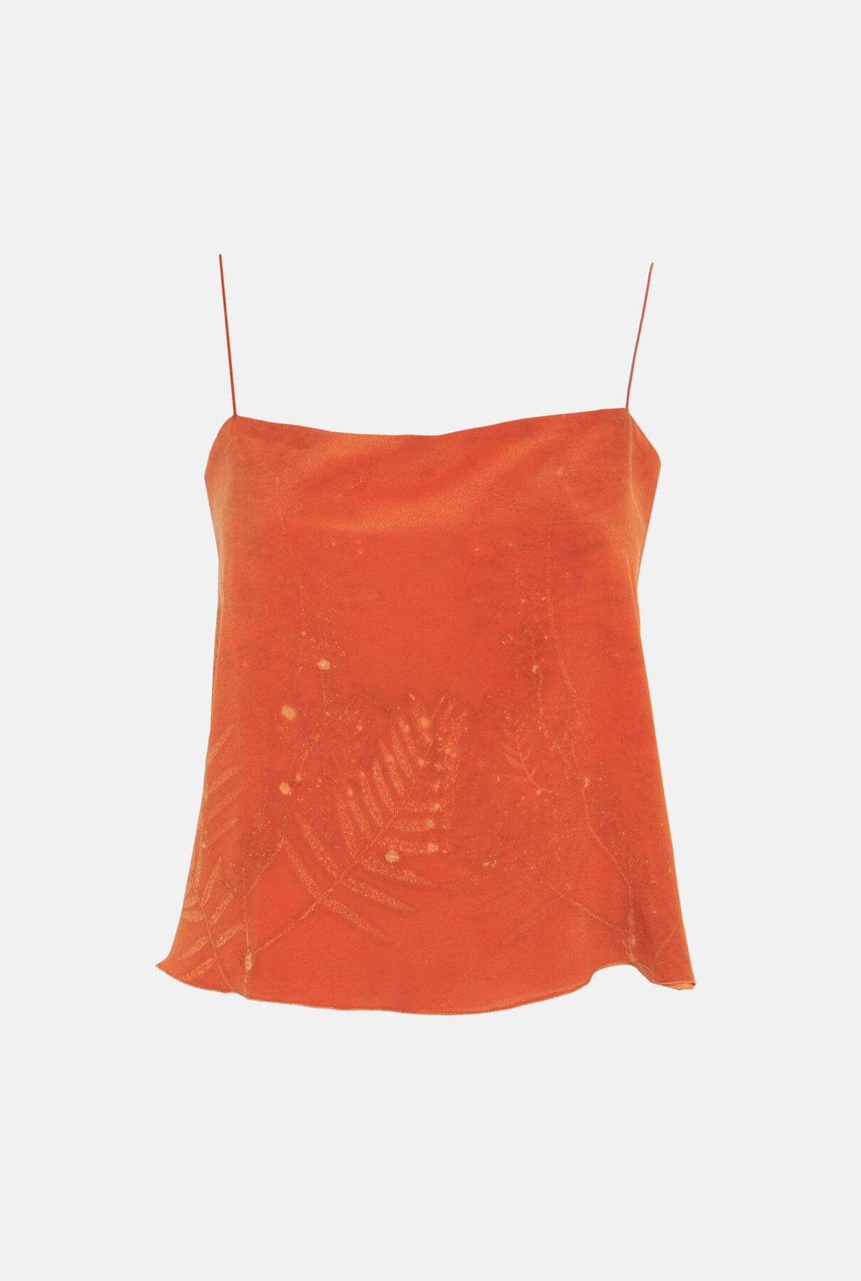 Top de crepé de seda con finos tirantes elásticos. Ecoprintado con hojas de falsa pimienta.