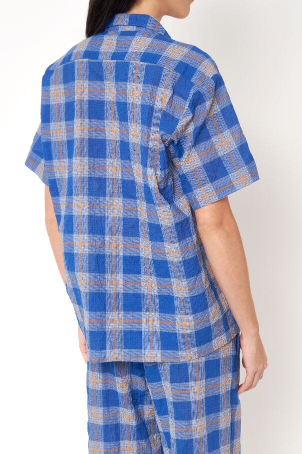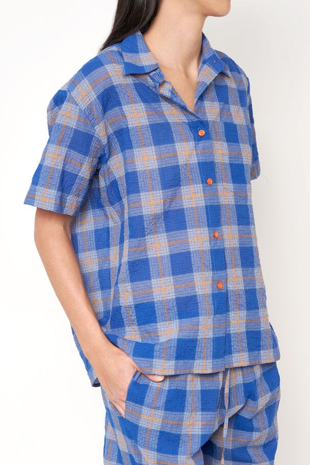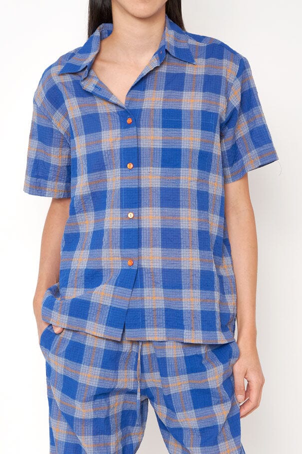 Camisa de manga corta en color azul con estampado de cuadros que incluye sombras amarillas. Combínala con nuestro Pantalón Madeira.