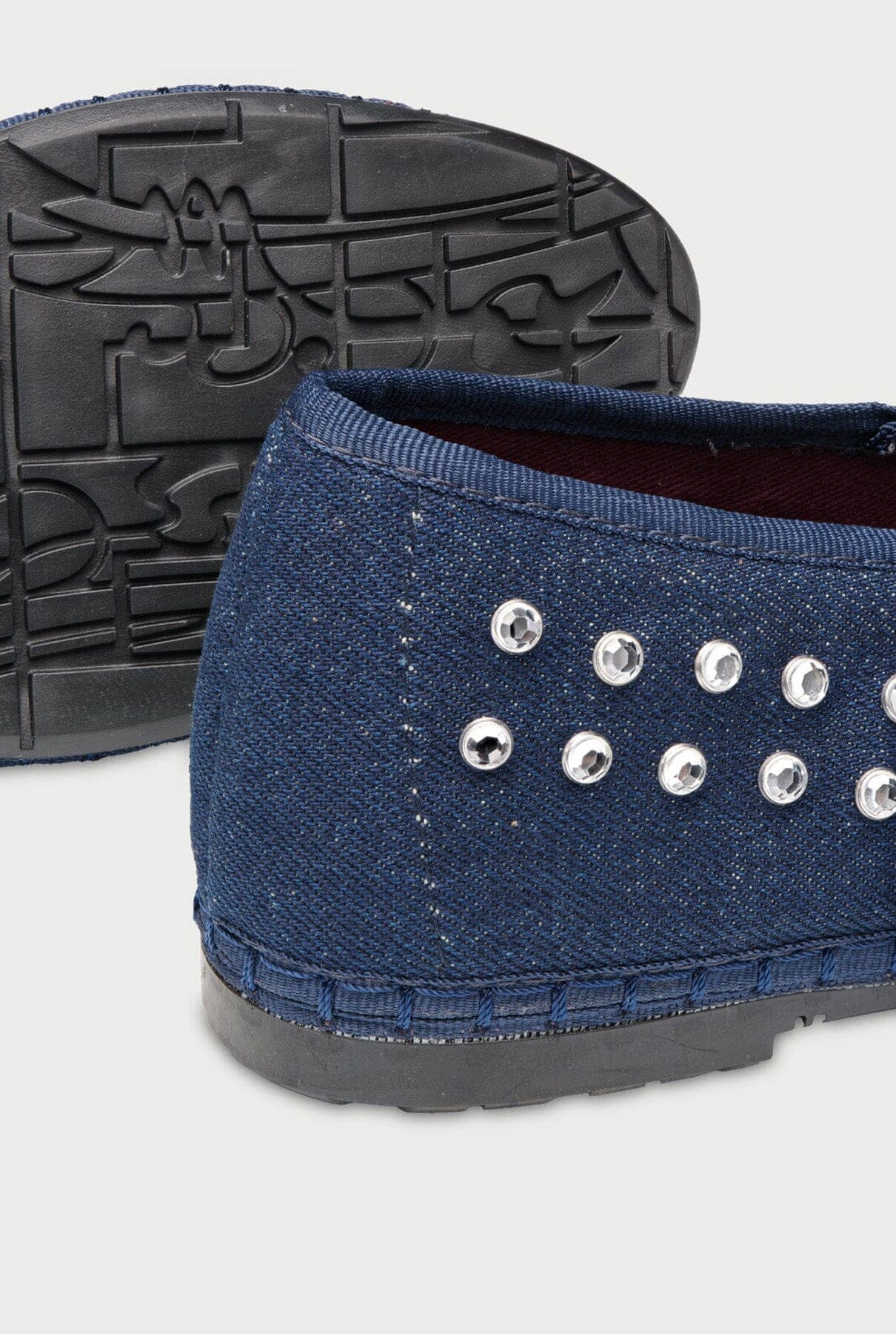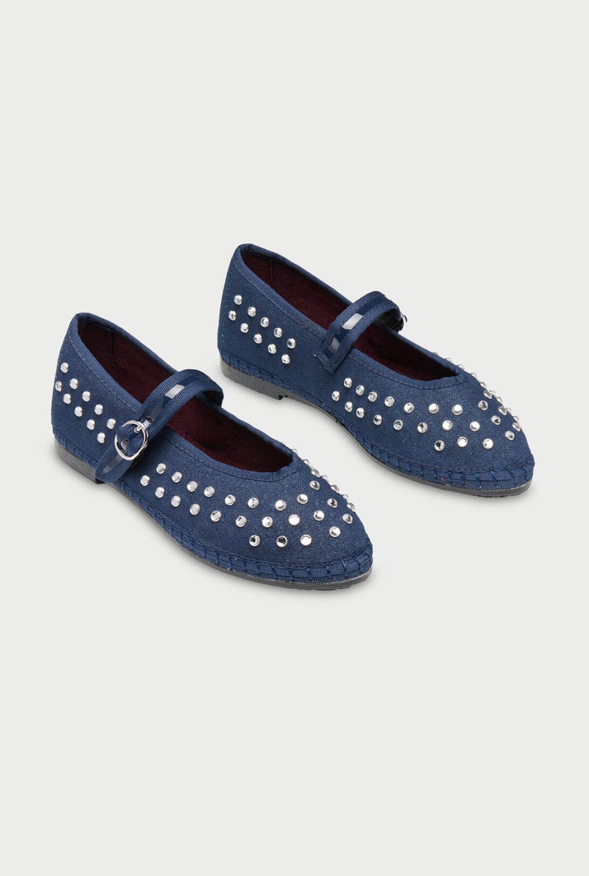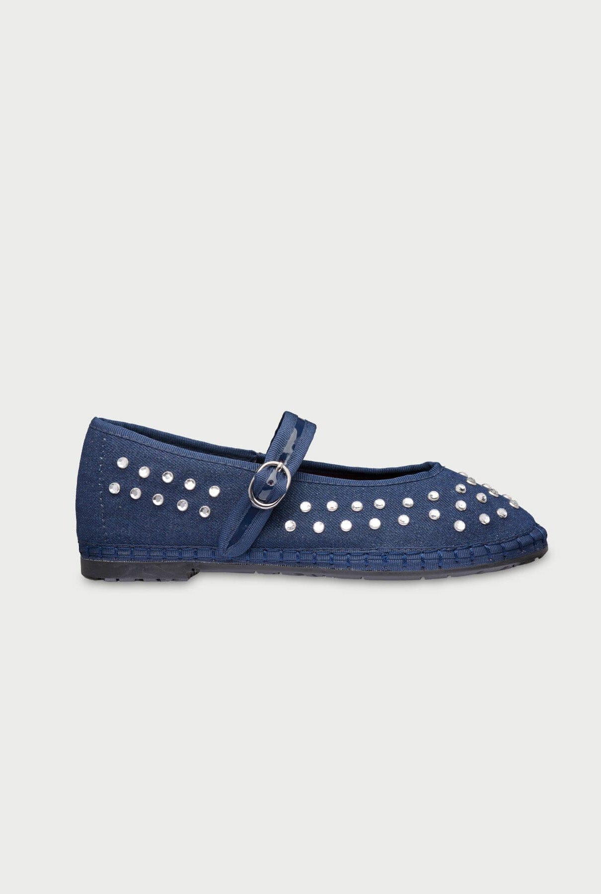 Bailarina vaquera con tacón de aguja en color azul oscuro con ribetes en azul oscuro y tachuelas de cristal. Cierre con correa de charol y hebilla.