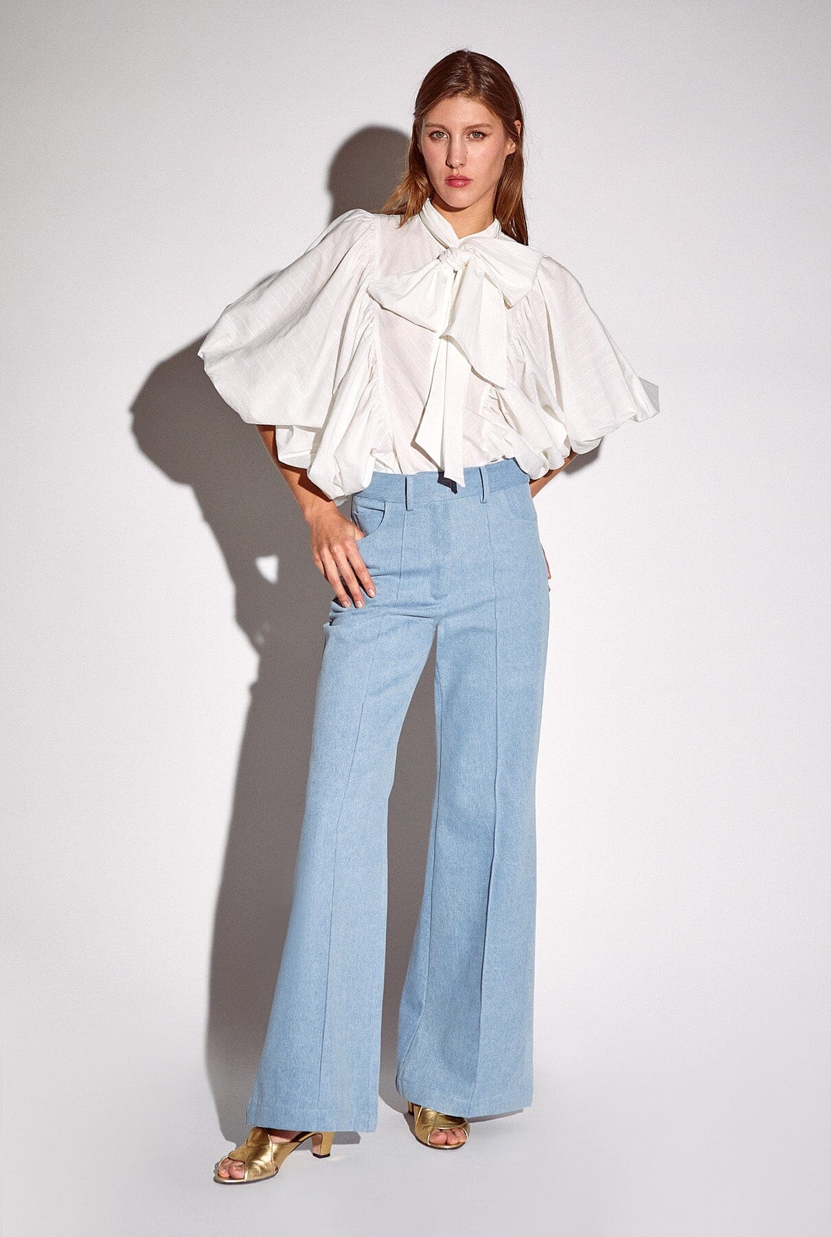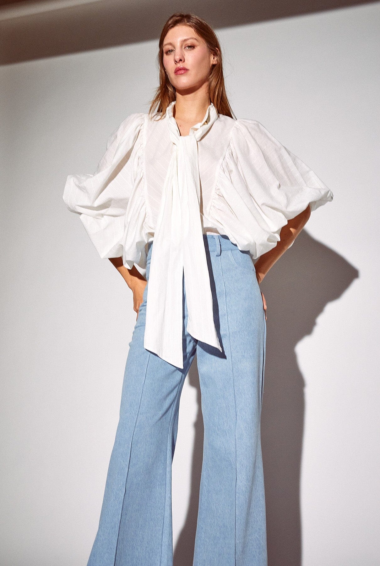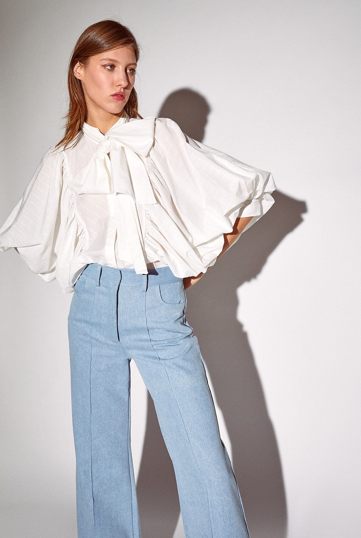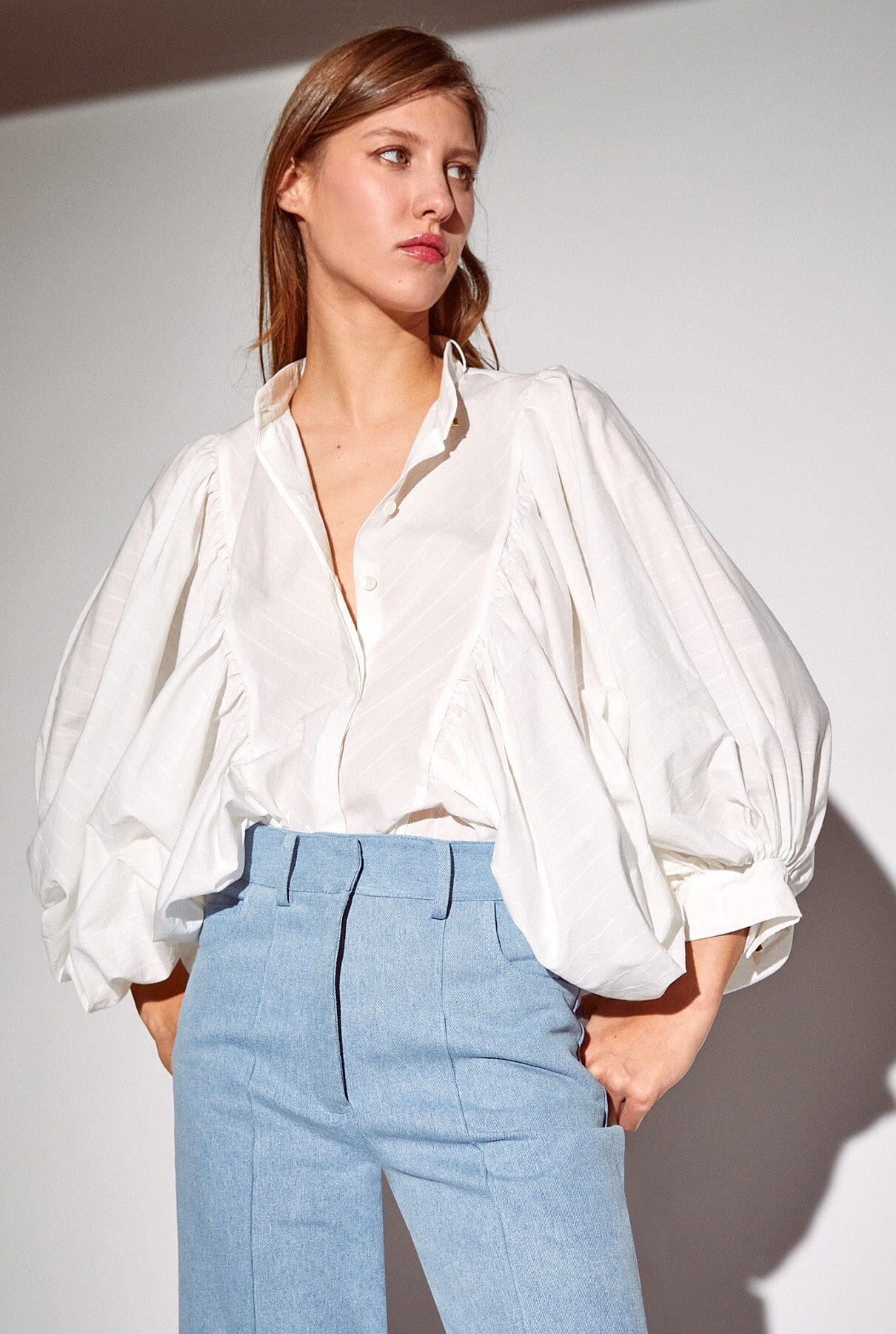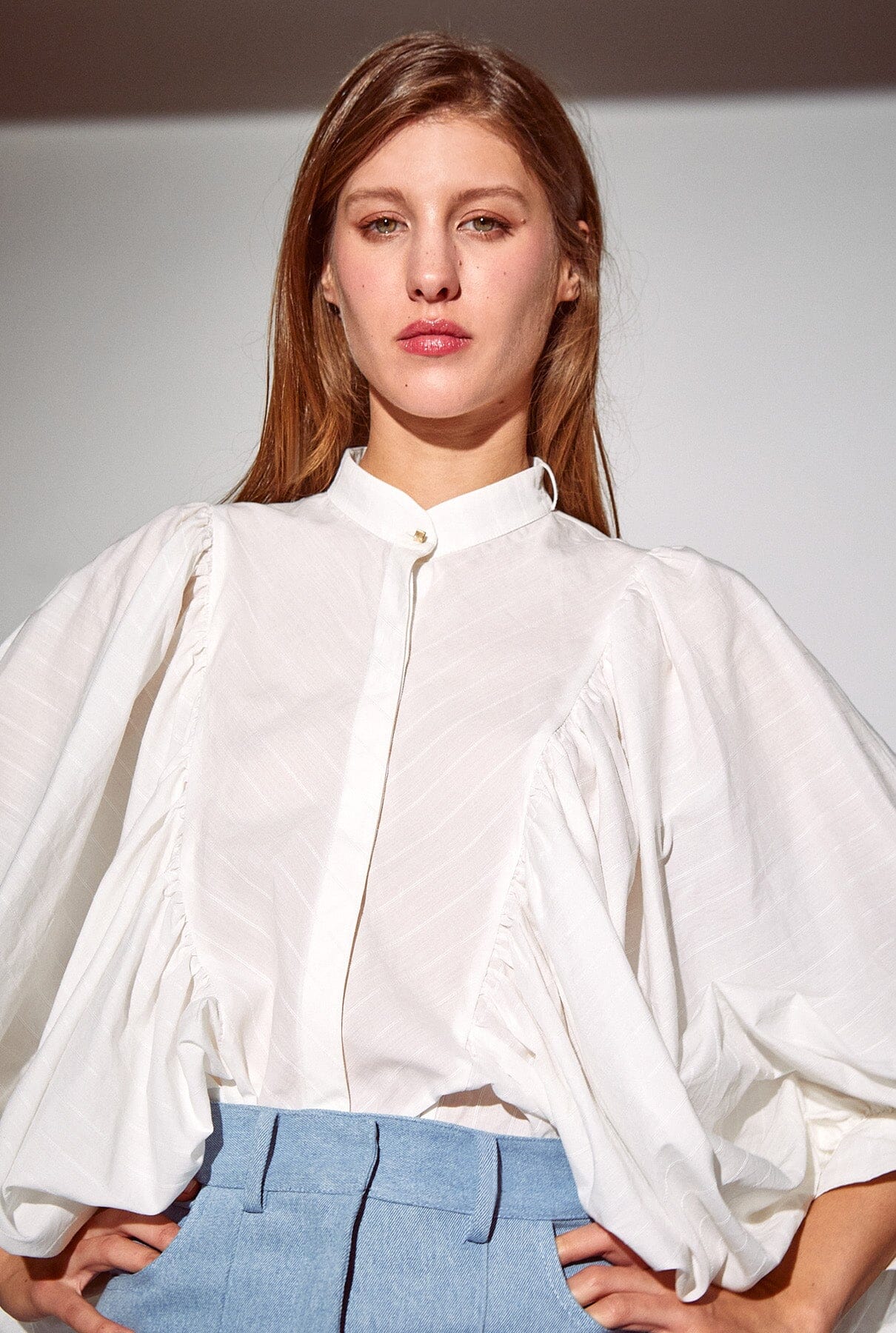 La blusa absoluta para un look elegante. Esta blusa con mangas drapeadas a media pierna está confeccionada en un delicado algodón texturizado de color blanco roto. Puedes usarlo con o sin un lazo romántico.