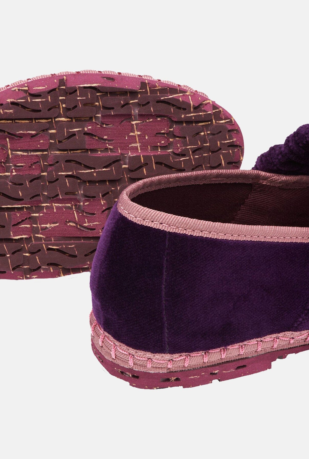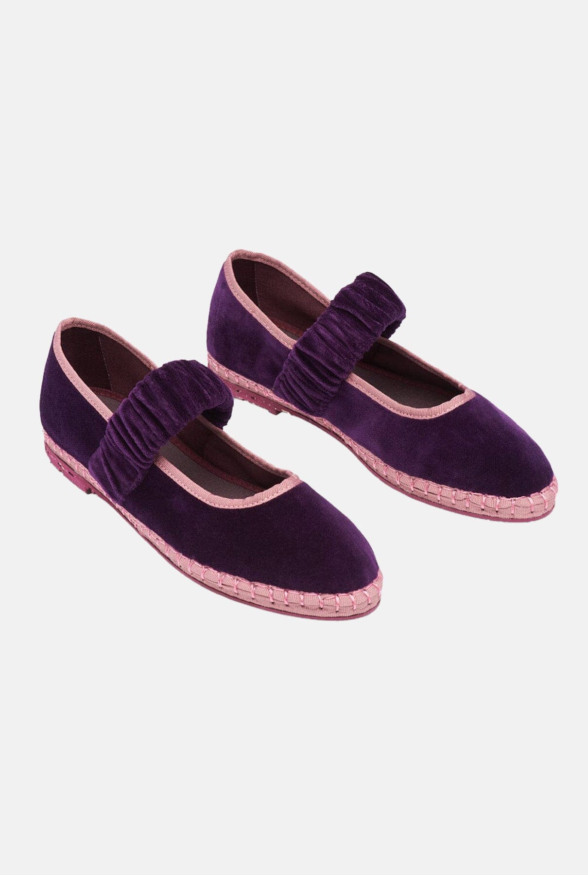 Mafalda de terciopelo en color morado con ribetes rosas y puntilla de terciopelo morado.