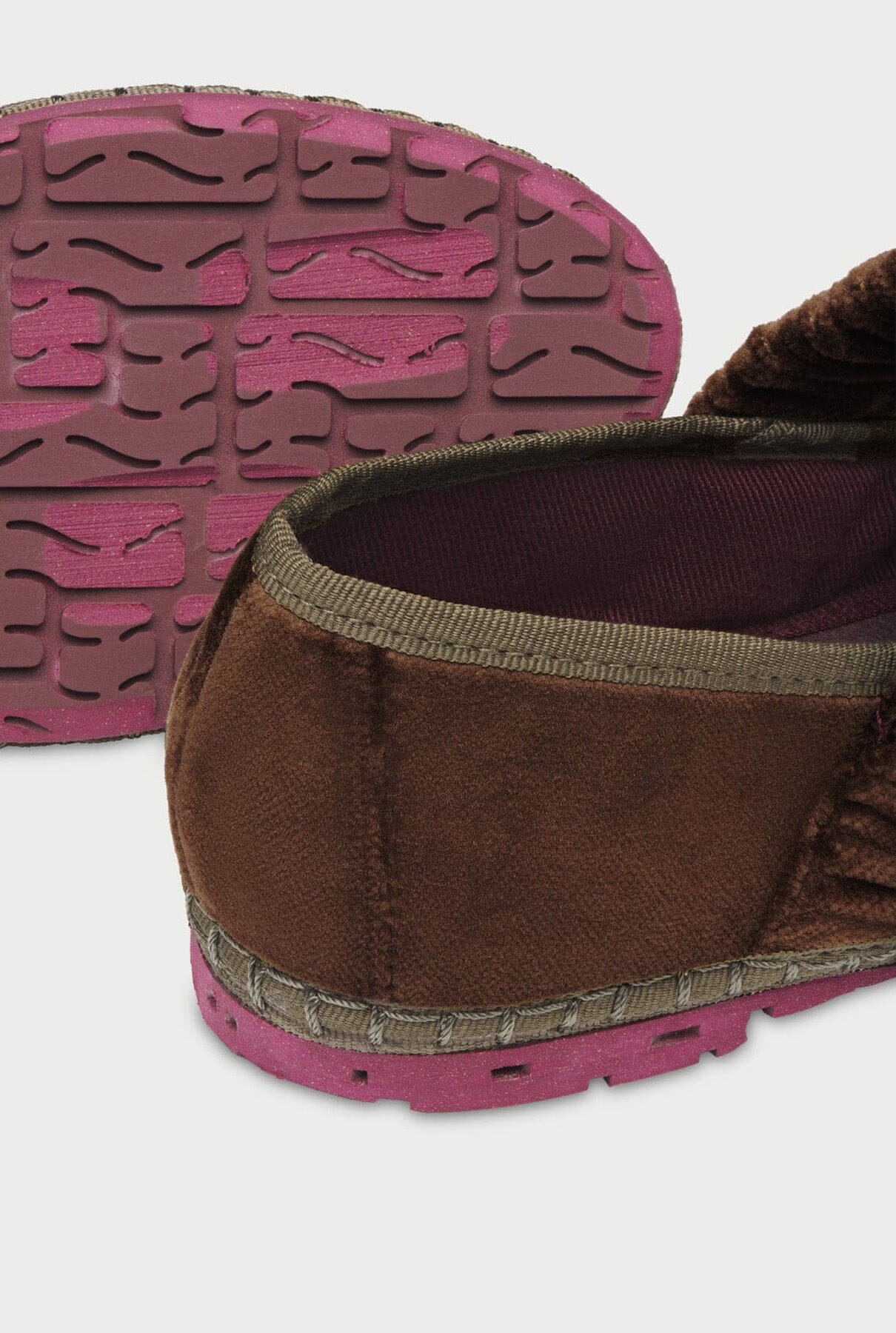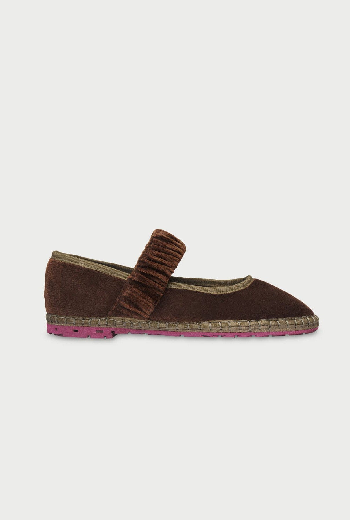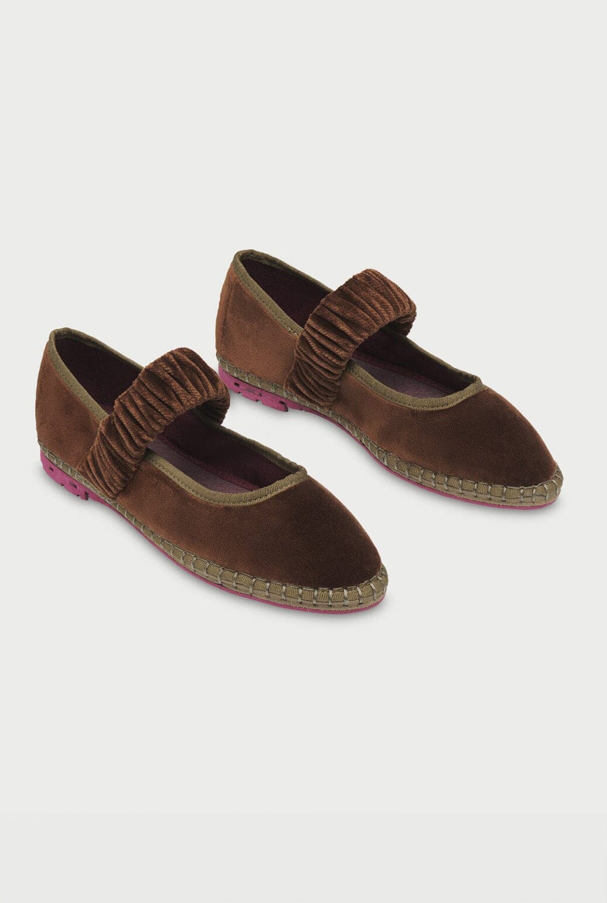 Mafalda de terciopelo en color marrón con ribete marrón claro y encaje de terciopelo marrón.