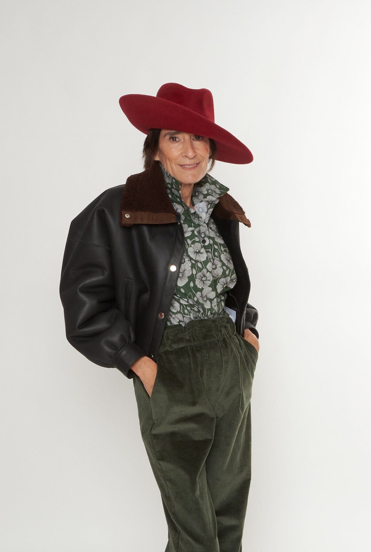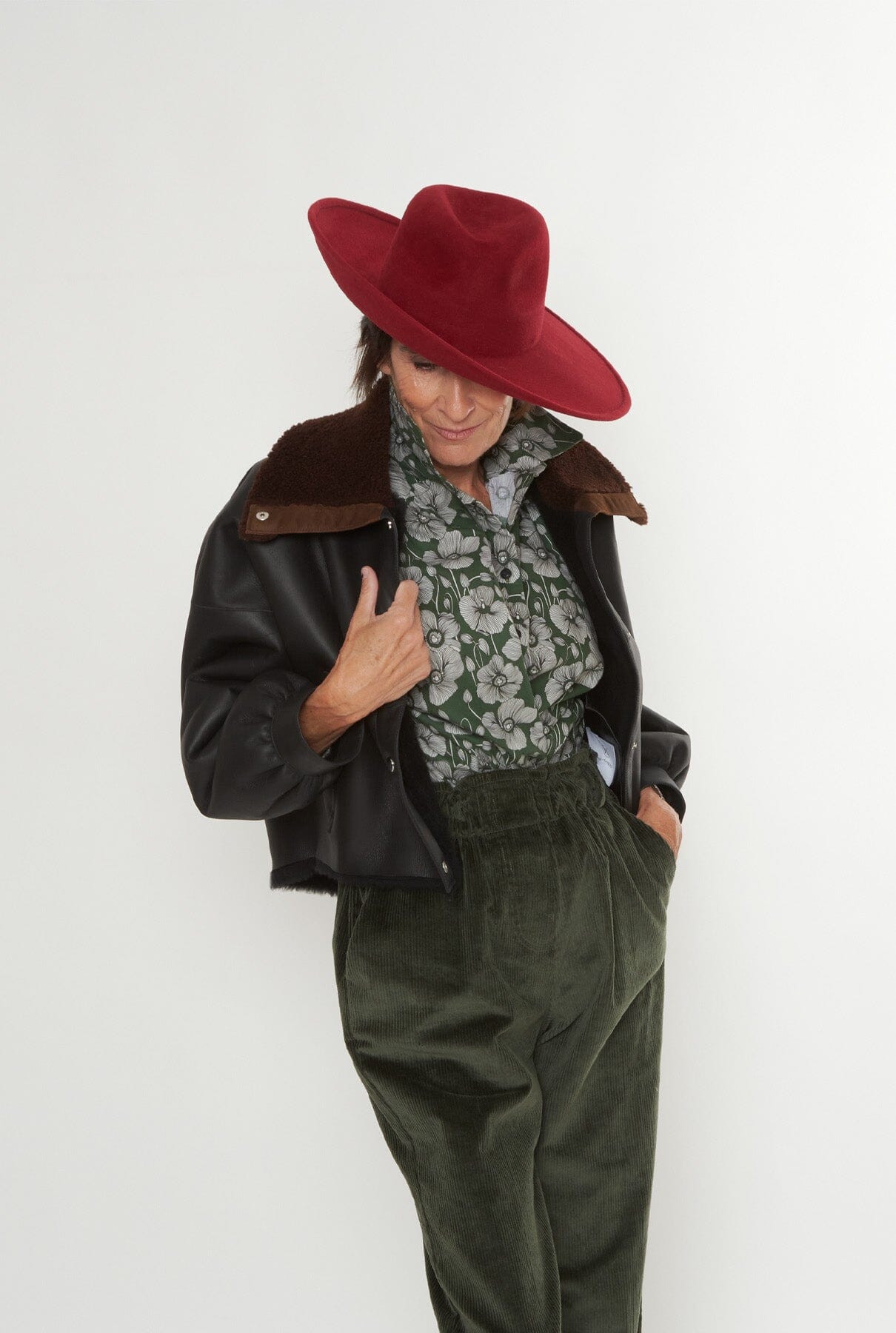 Sombrero fedora de fieltro de pelo con ala media vuelta que facilita la visibilidad y estiliza la figura generando un efecto visual diagonal. Sombrero fabricado a partir de horma de madera de forma artesanal.