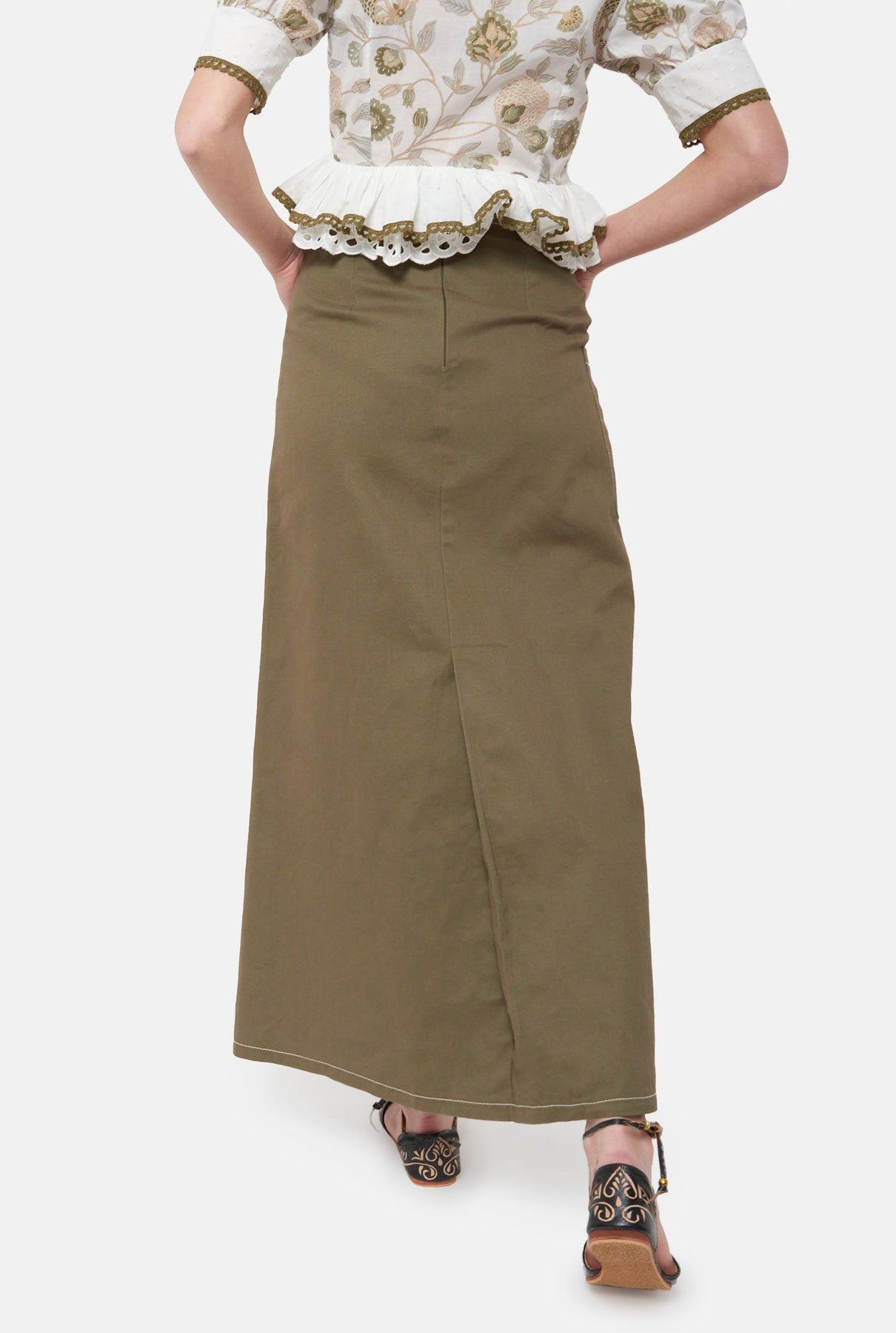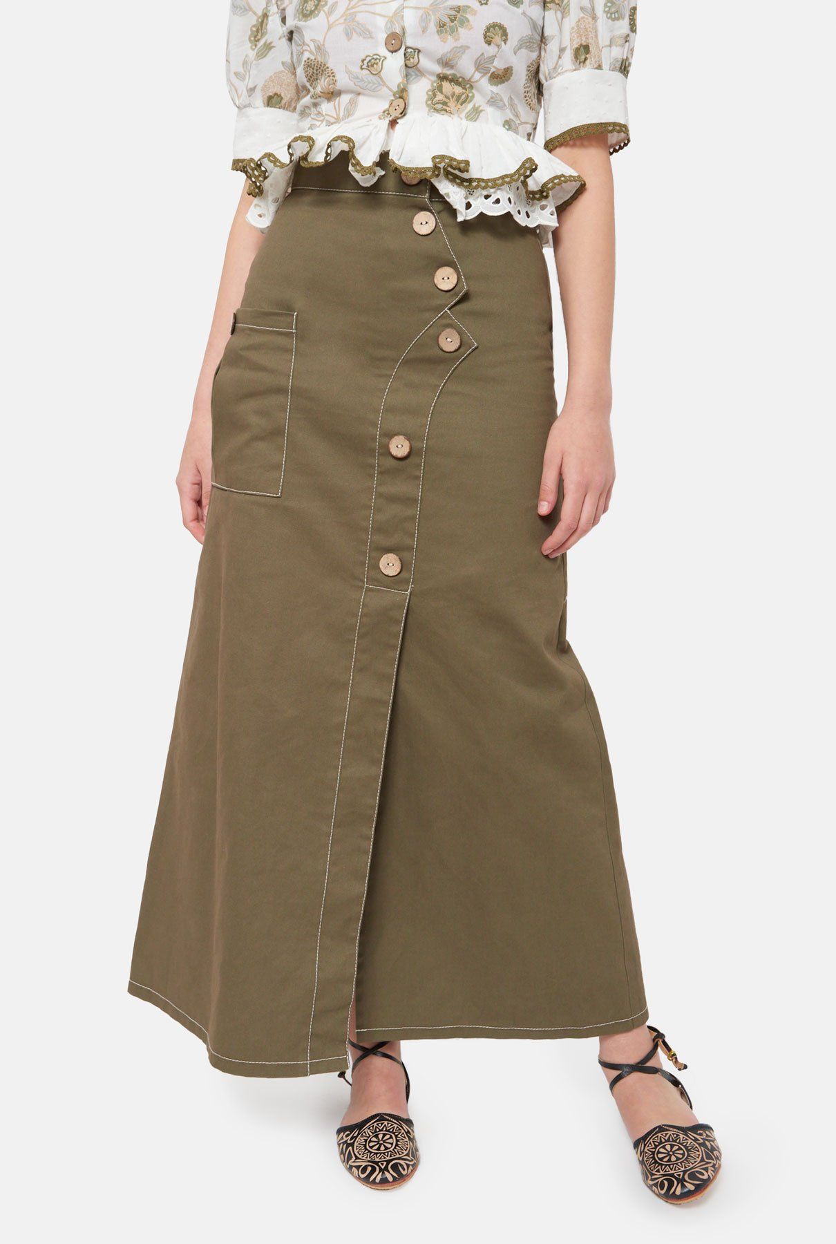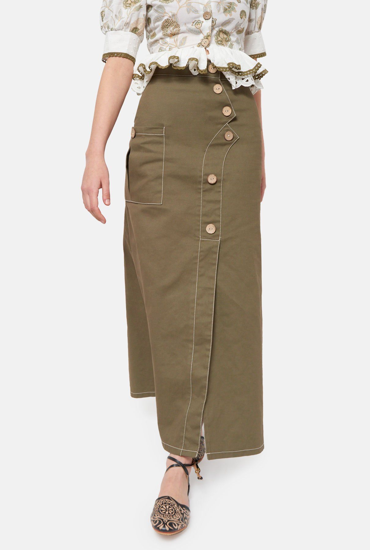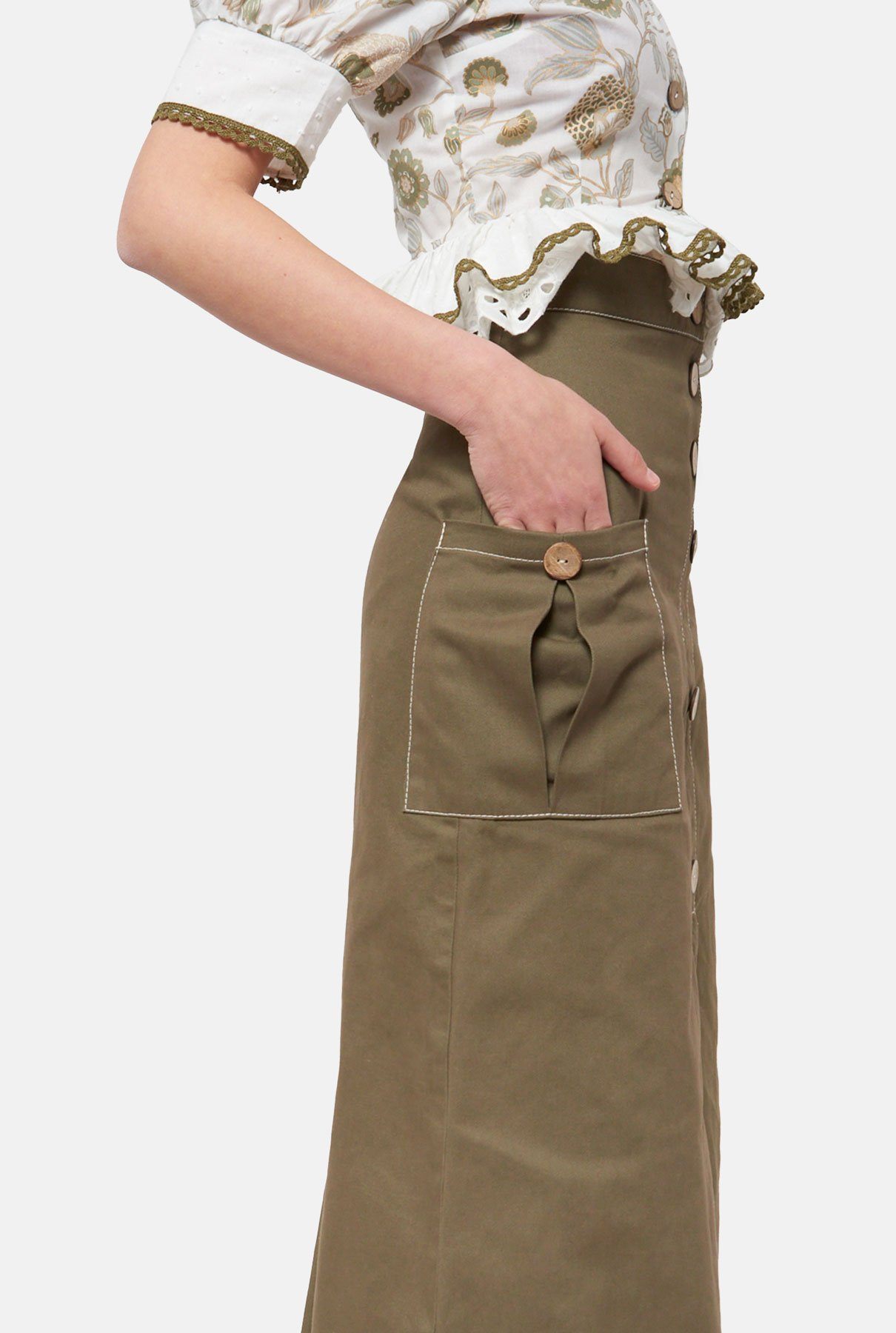 Falda de cintura alta. Bolsillo de parche delantero. Detalles de botones de coco. Apertura frontal. Cierre de cremallera invisible en espalda. Diseñado por Leyre Doueil