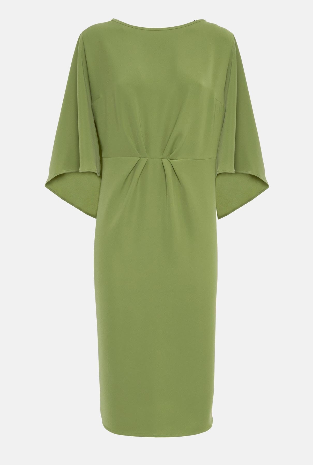 Vestido de crep con doble pliegue en delantero y manga tipo capa. Diseñado por Ulises Mérida.
