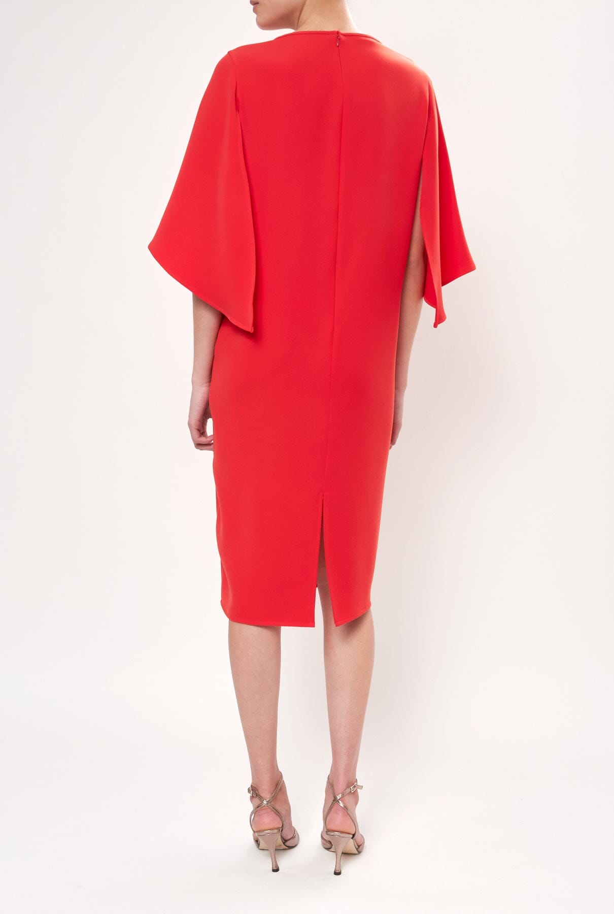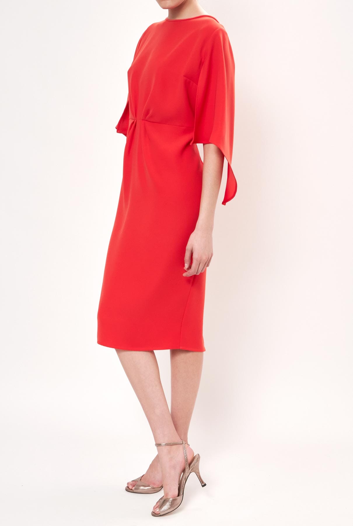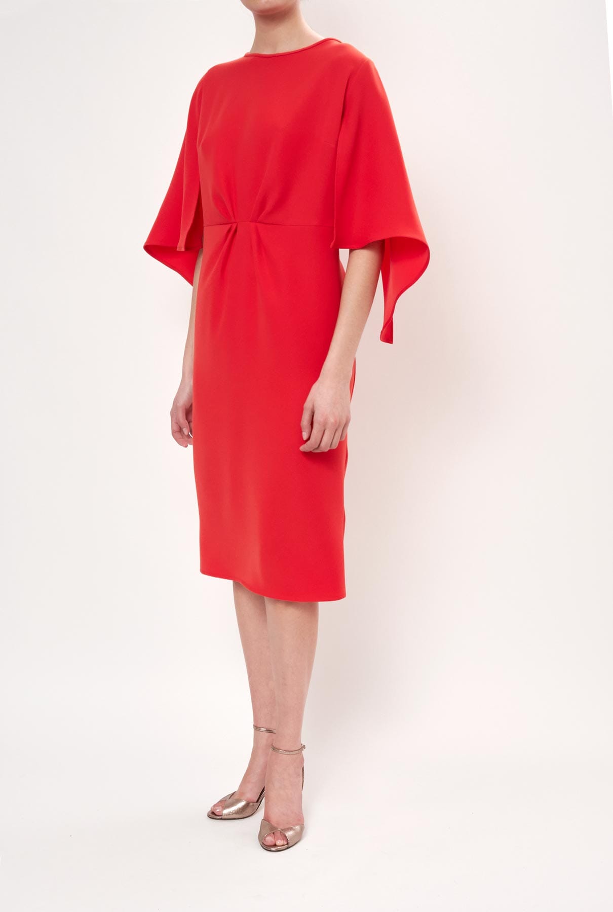 Vestido de crep con doble pliegue en delantero y manga tipo capa. Diseñado por Ulises Mérida.