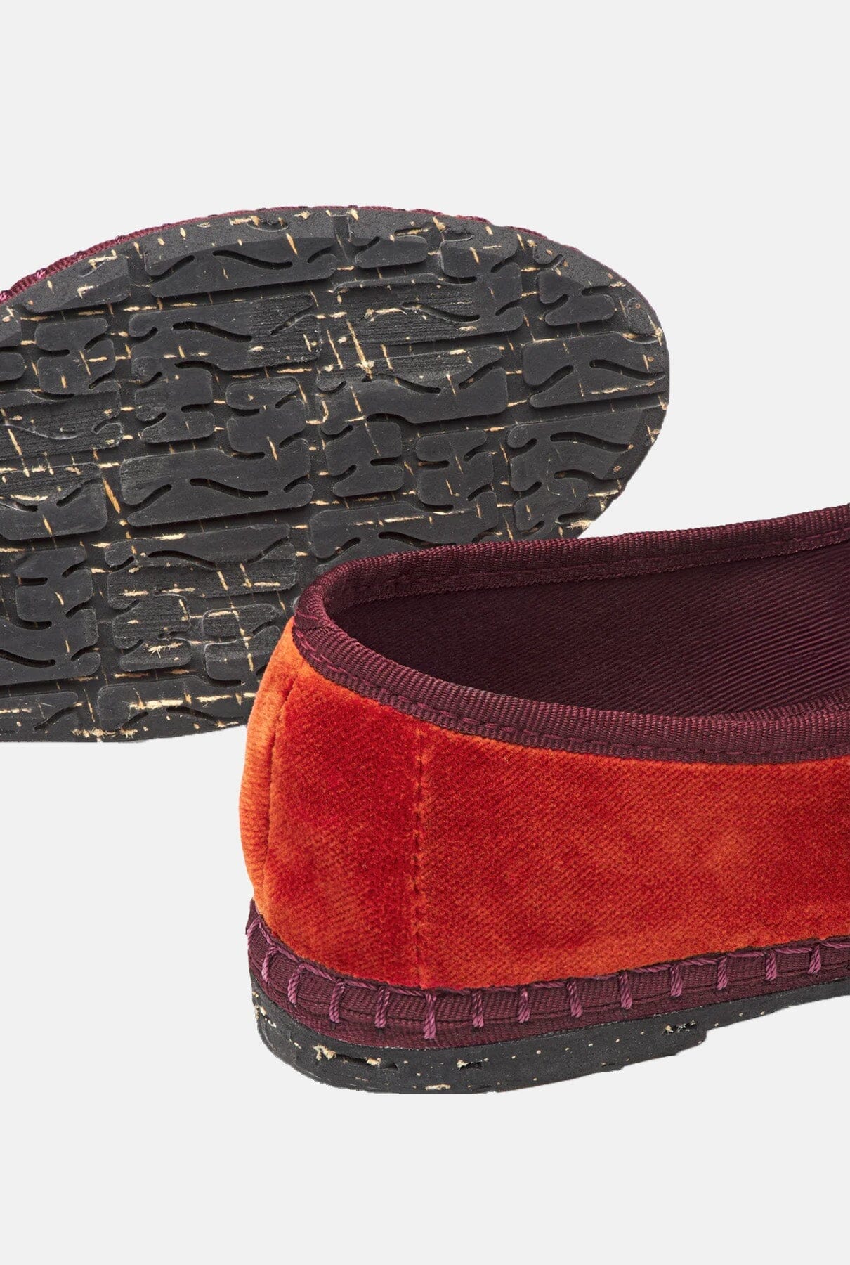 Mercedita de terciopelo en color naranja óxido con ribetes en color burdeos y cierre con hebilla. El exterior del zapato es 100% terciopelo de algodón, y el interior del zapato es 100% algodón ecológico con tratamiento antibacteriano. La suela está hecha de caucho procedente de neumáticos de bicicleta reciclados.