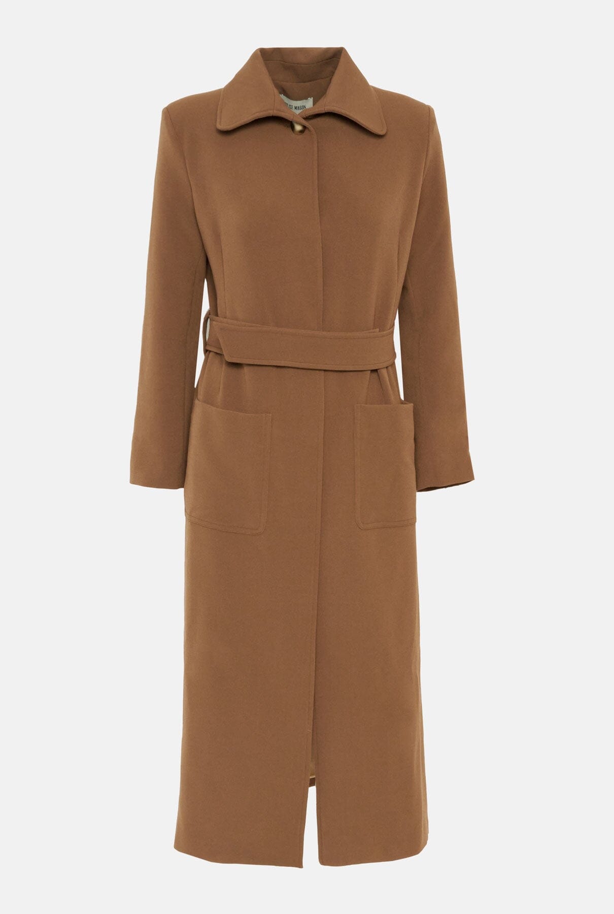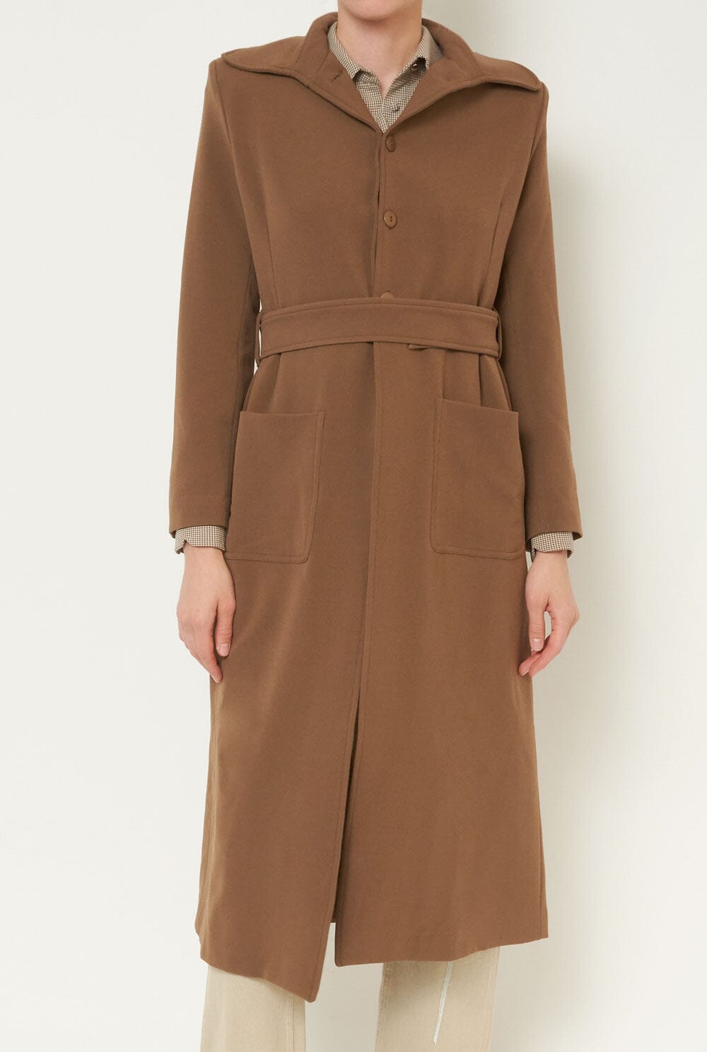 Abrigo largo confeccionado en tejido ligeramente elástico. Cuello redondeado, cierre de botones en el pie del cuello y botones ocultos en el cuerpo. Cinturón con corchetes ocultos para ajustar la cintura. Bolsillos de plastrón delanteros y bolsillo interior oculto.