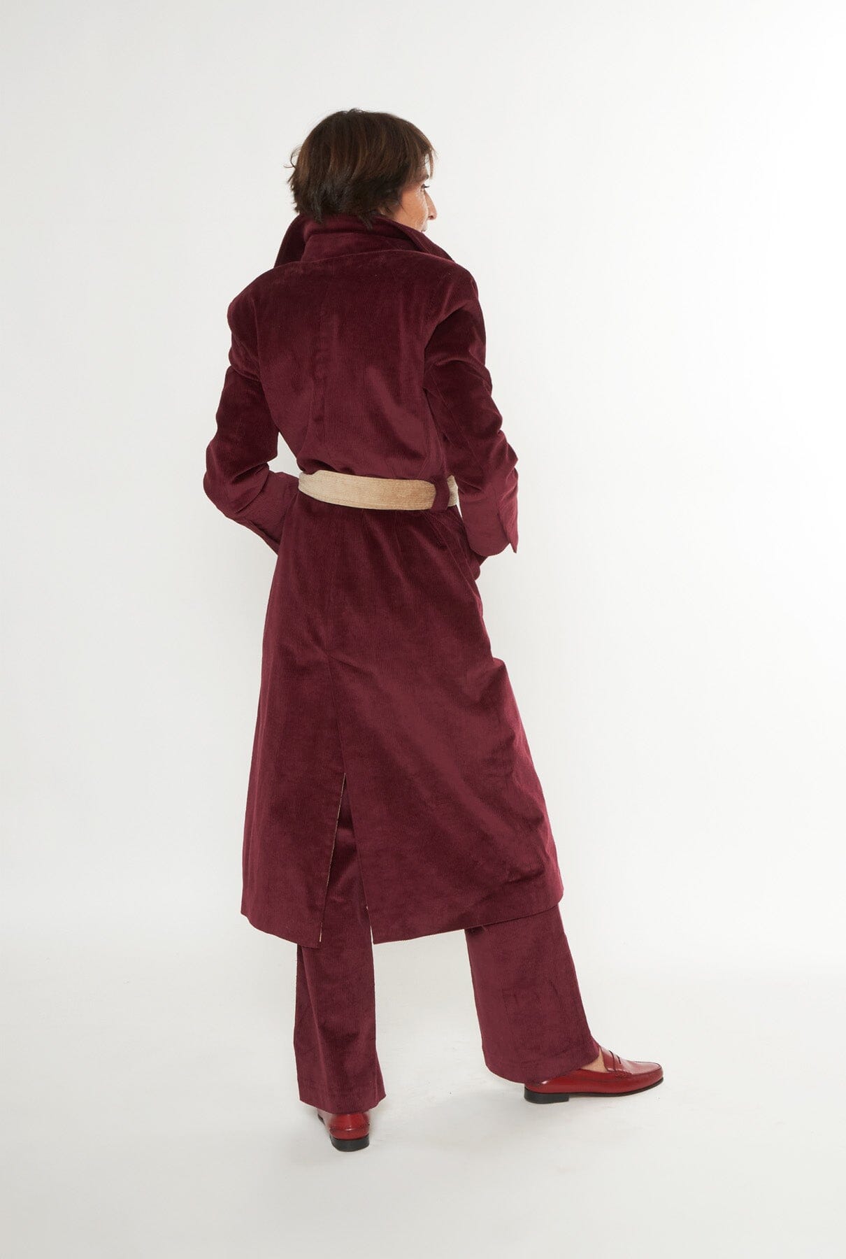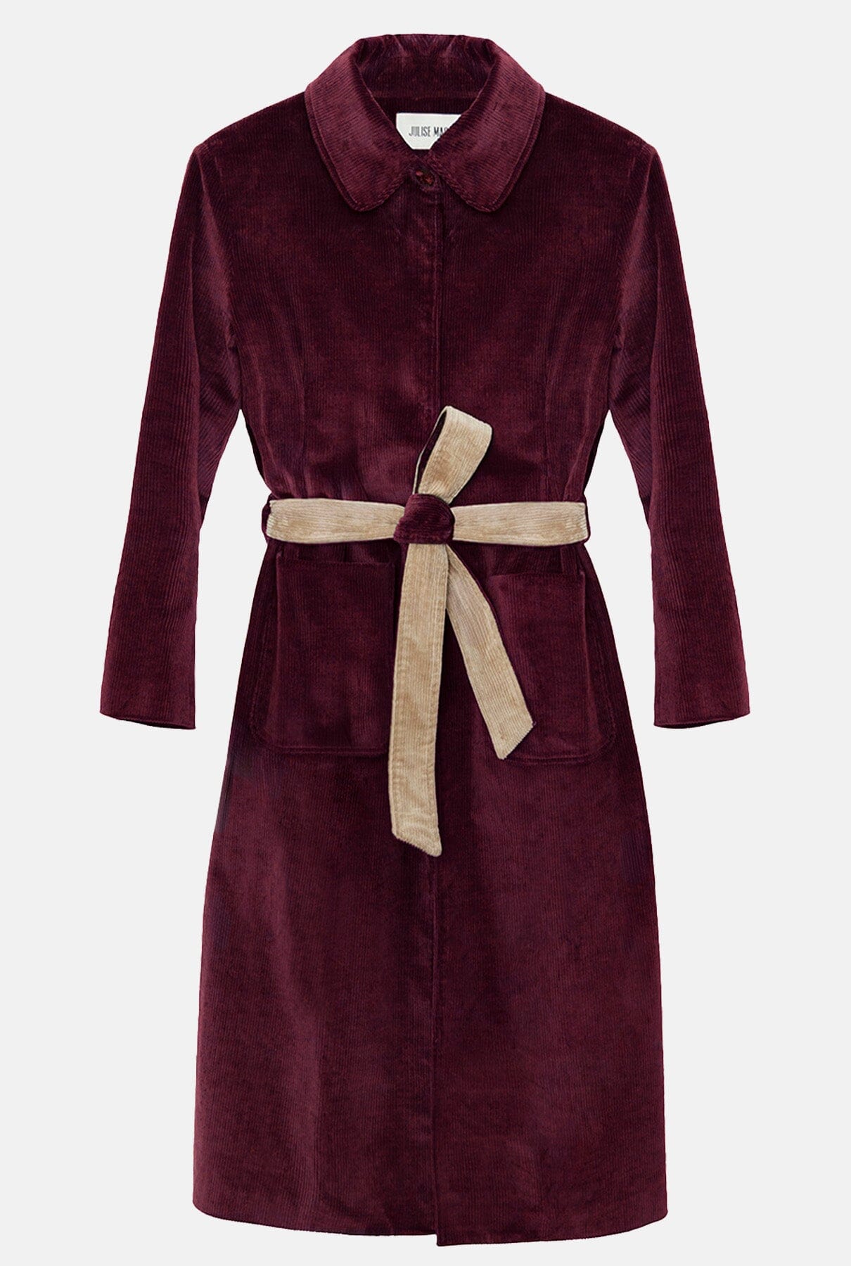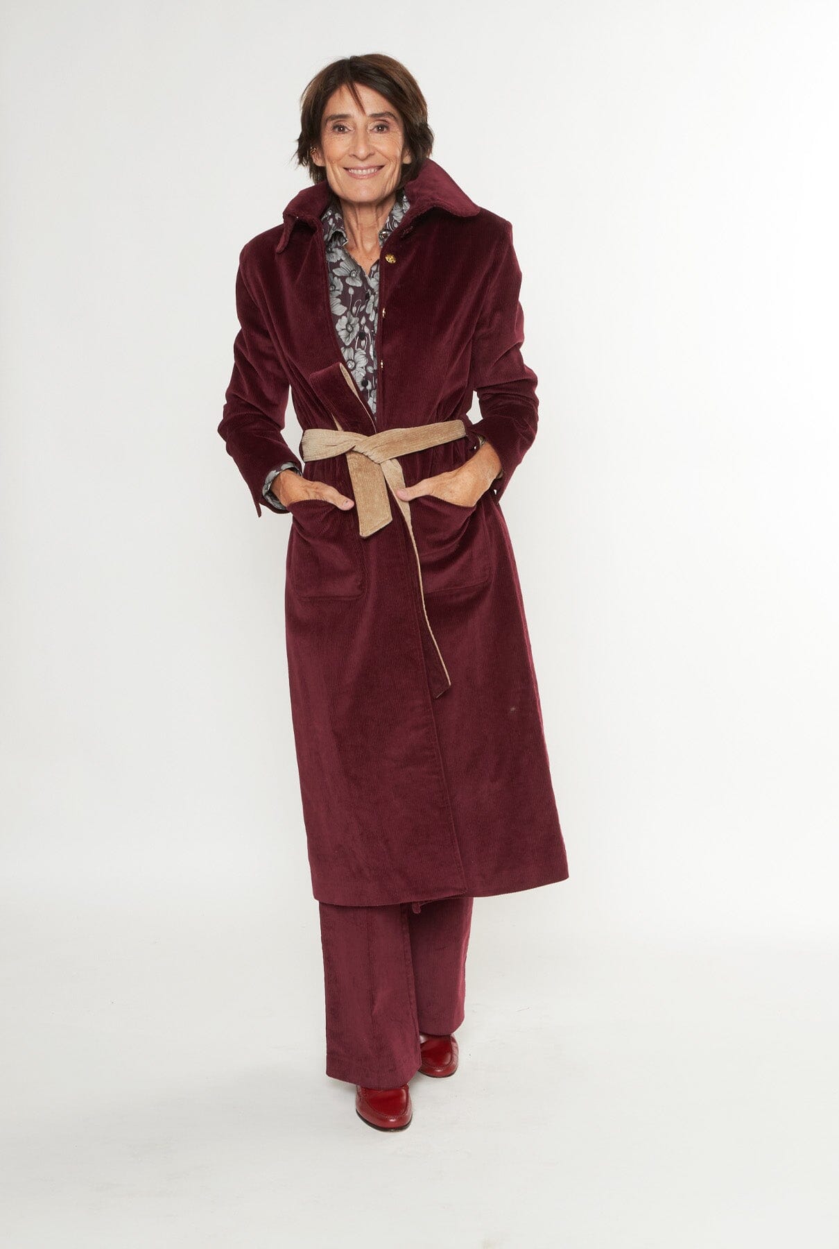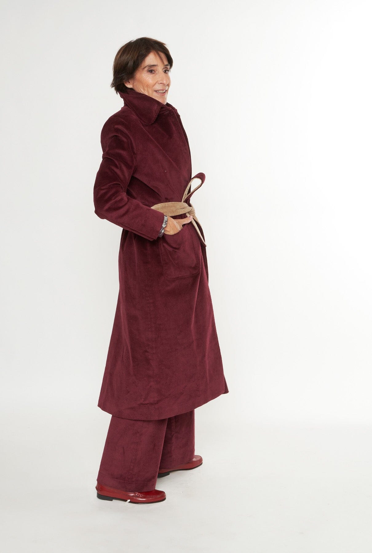 Abrigo largo confeccionado en tejido de pana ligeramente elástico. Cuellos redondeados, cierre con botón antiguo visto en el pie de cuello y botones ocultos en el cuerpo. Con cinturón de doble color a contraste para ajustar en cintura. Bolsillos de plastrón delanteros y bolsillo oculto interior.