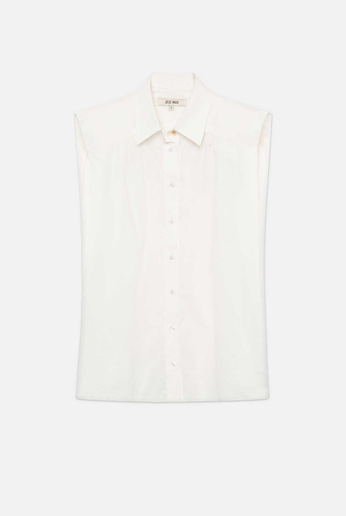 Versión de nuestra camiseta Marieta pero sin mangas y en color crudo. Con botones en la parte delantera. Detalle de volante en hombro y botón dorado en cuello y puños. Confeccionado en 100% algodón orgánico. Diseñado por Julise Magon.