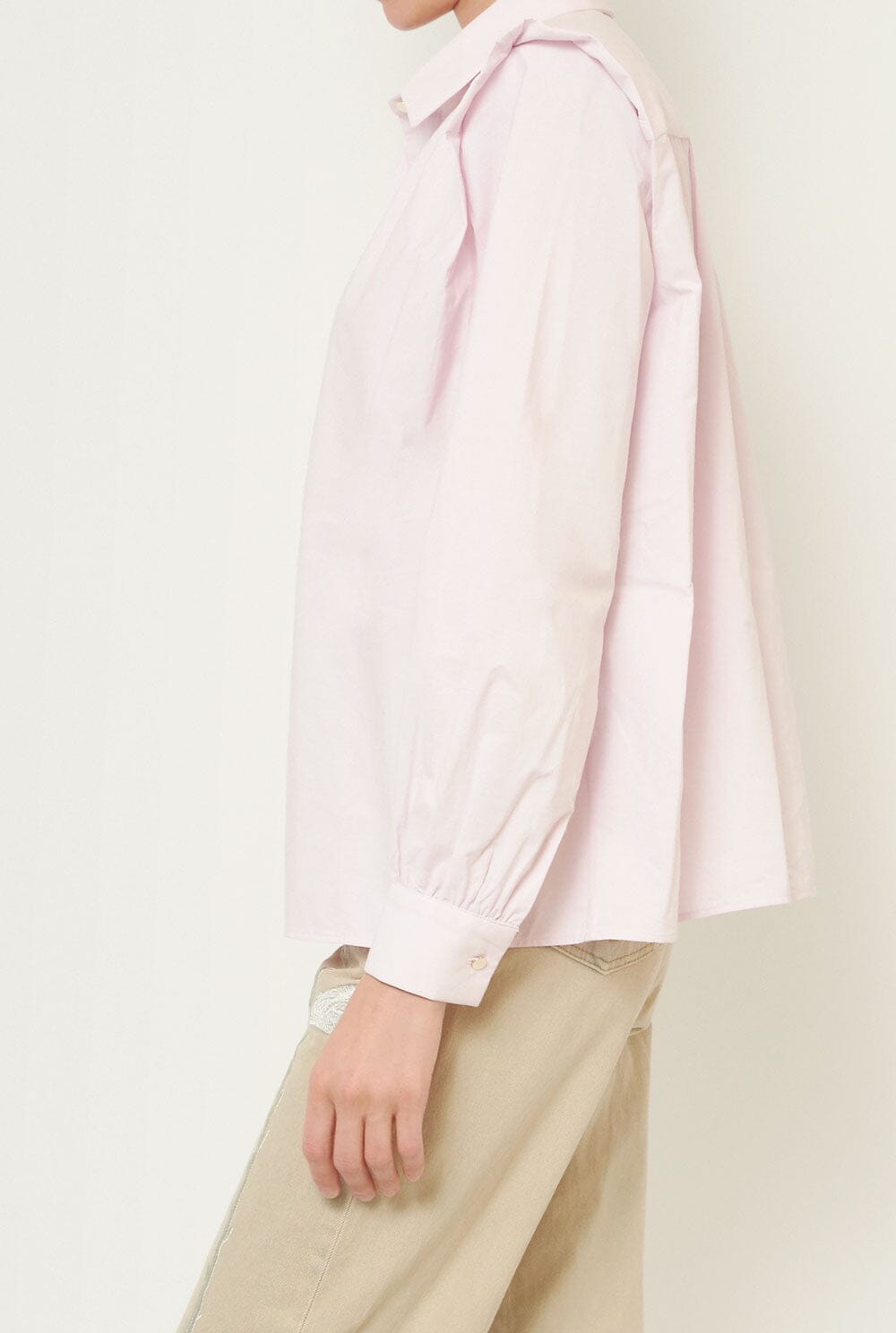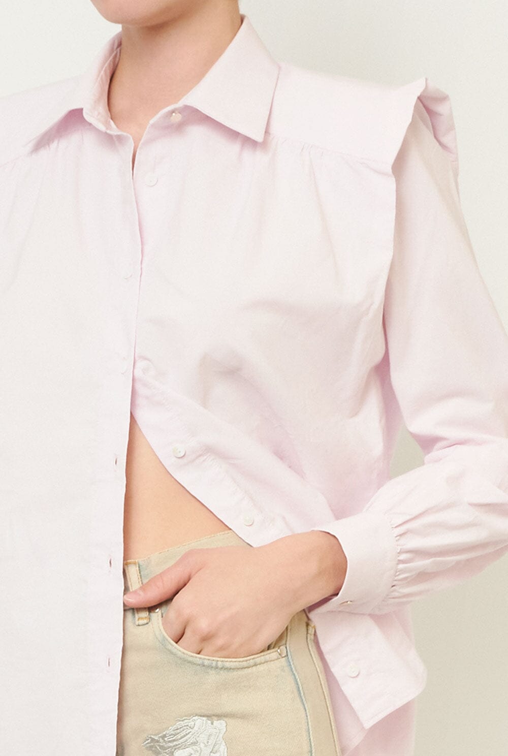 Camisa de manga larga en color rosa suave. Abotonada en la parte delantera. Detalle de volante en hombro y botón dorado en cuello y puños.