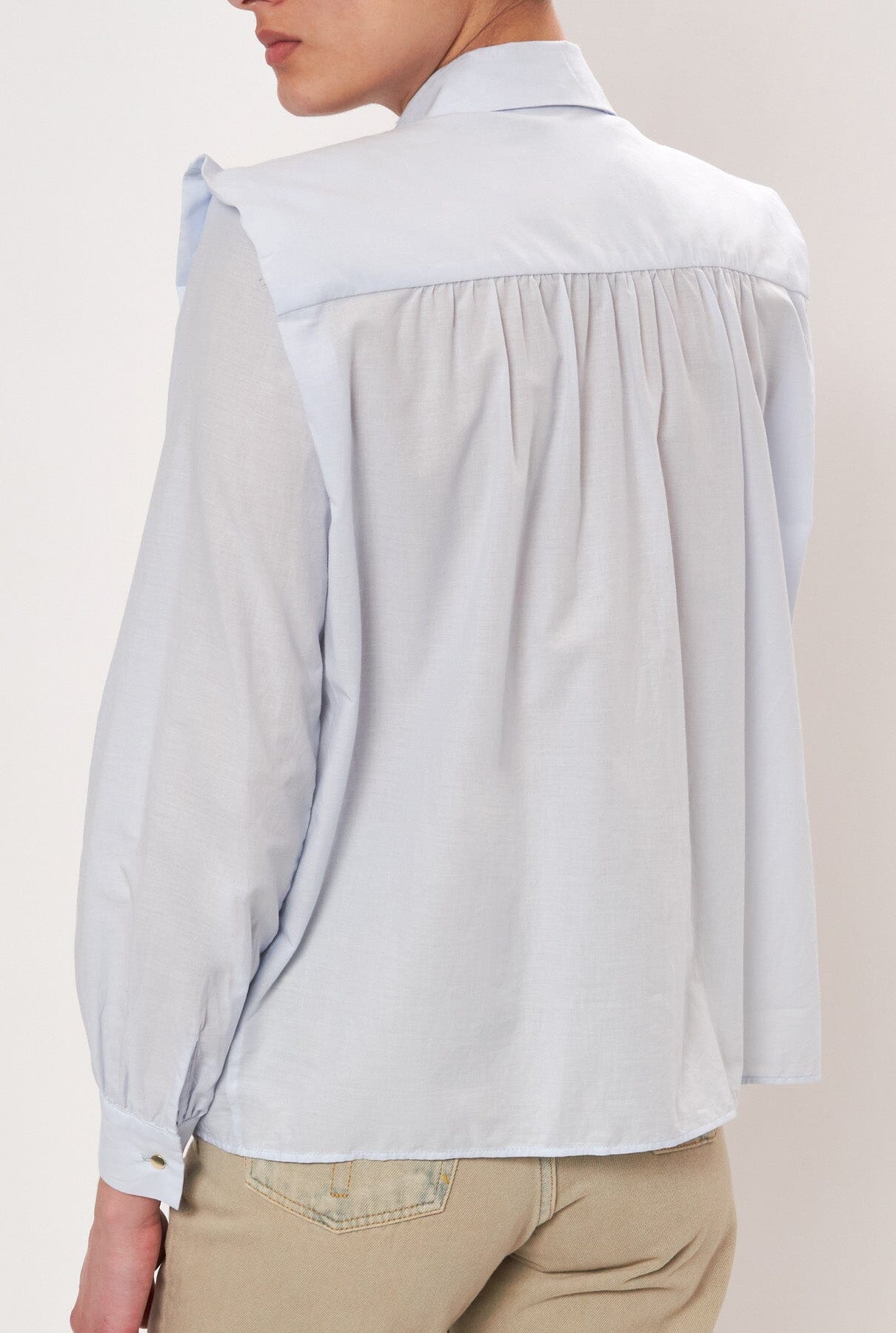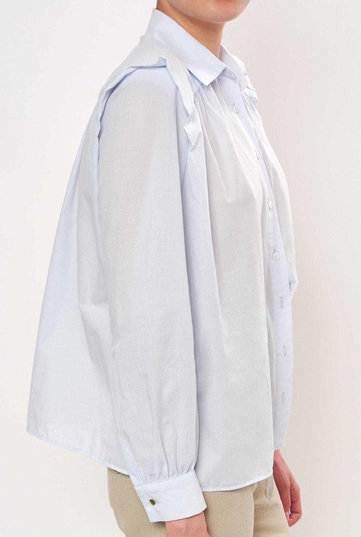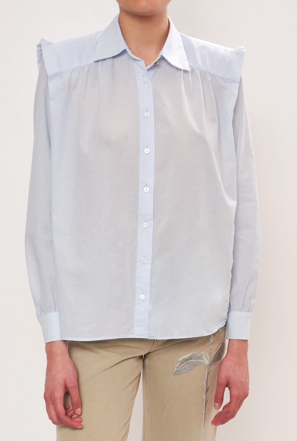 Nuestra icónica camisa de manga larga en tejido voile azul. Abotonado en la parte delantera. Detalle de volante en el hombro, con hombreras y botón dorado en cuello y puños. Para un look completo se puede combinar con jeans Alba, pantalones Adela, Coro, Sofia...