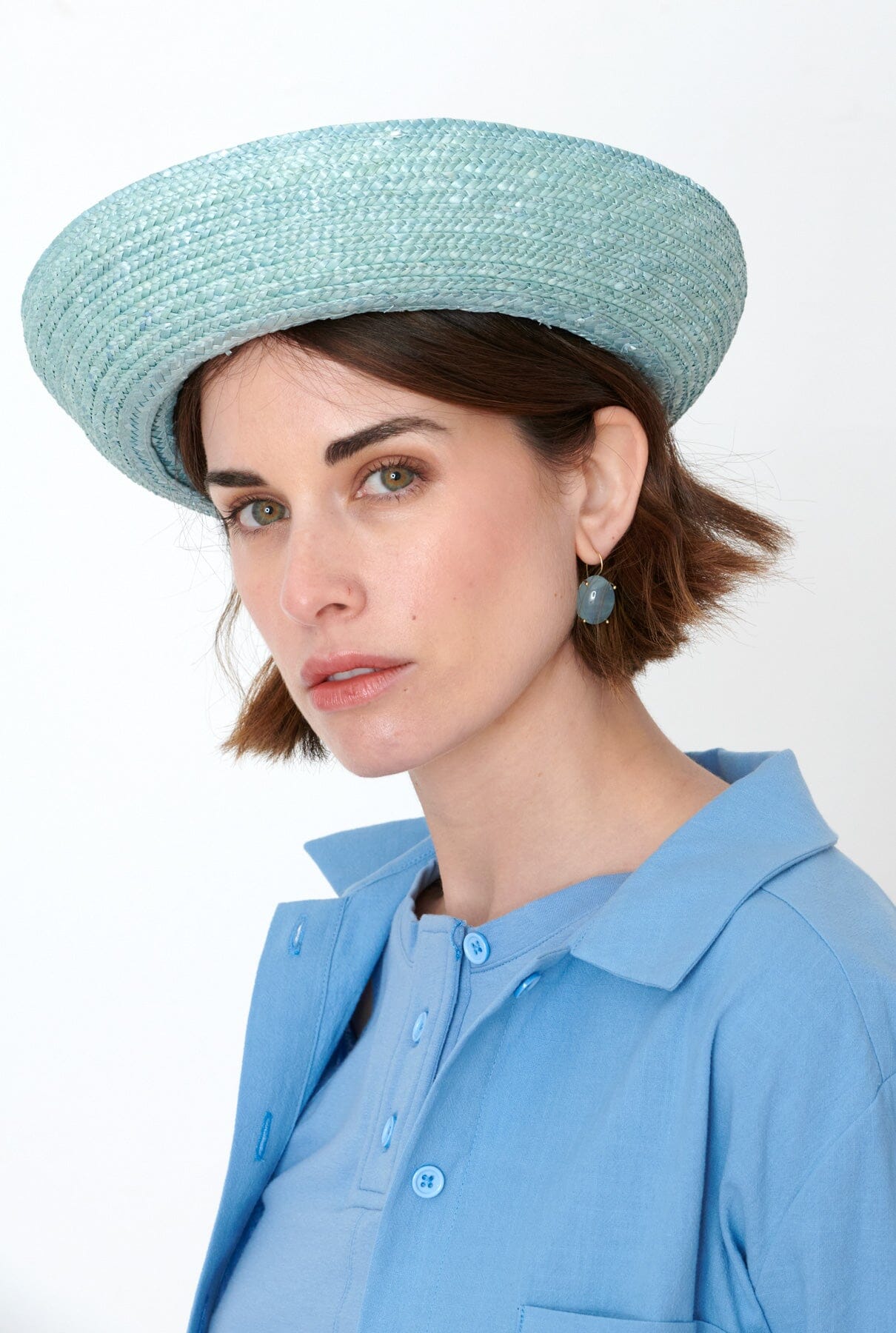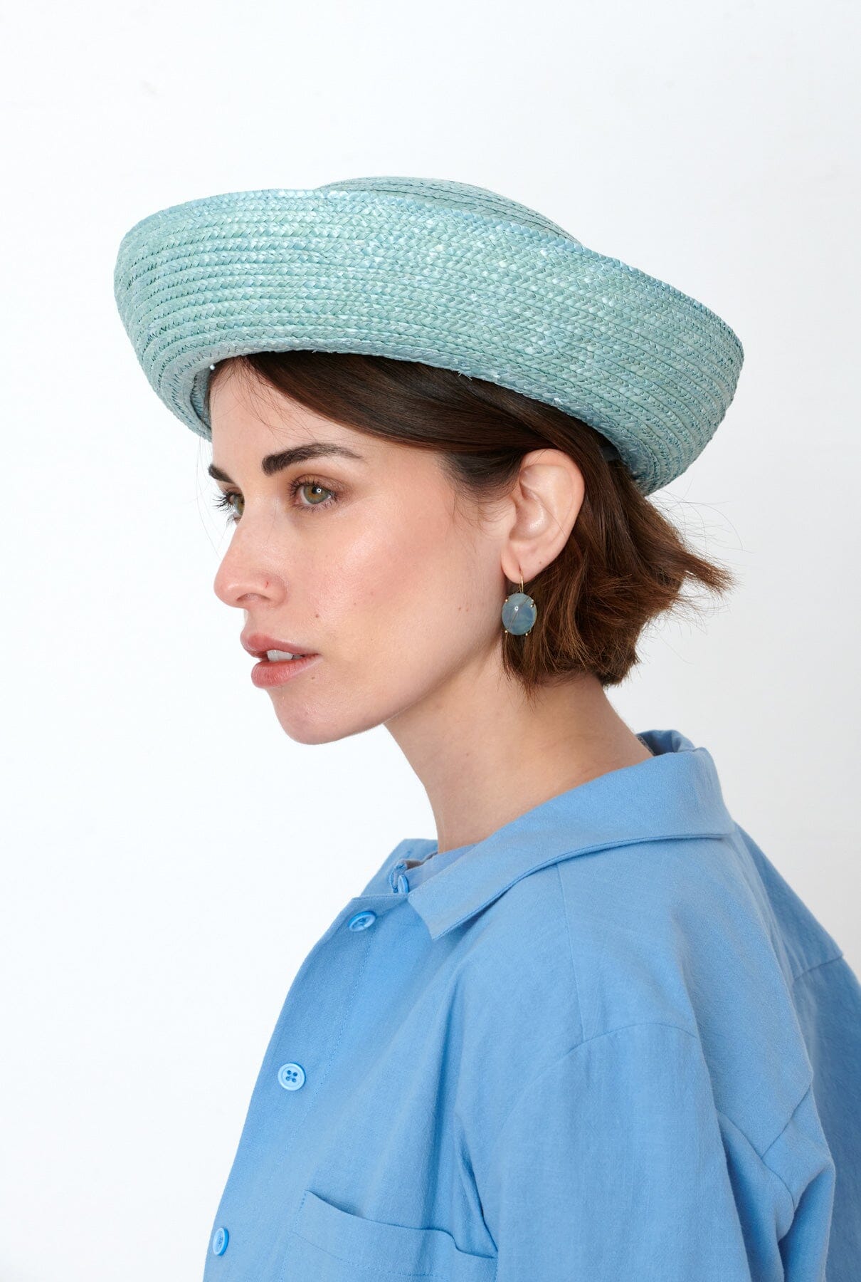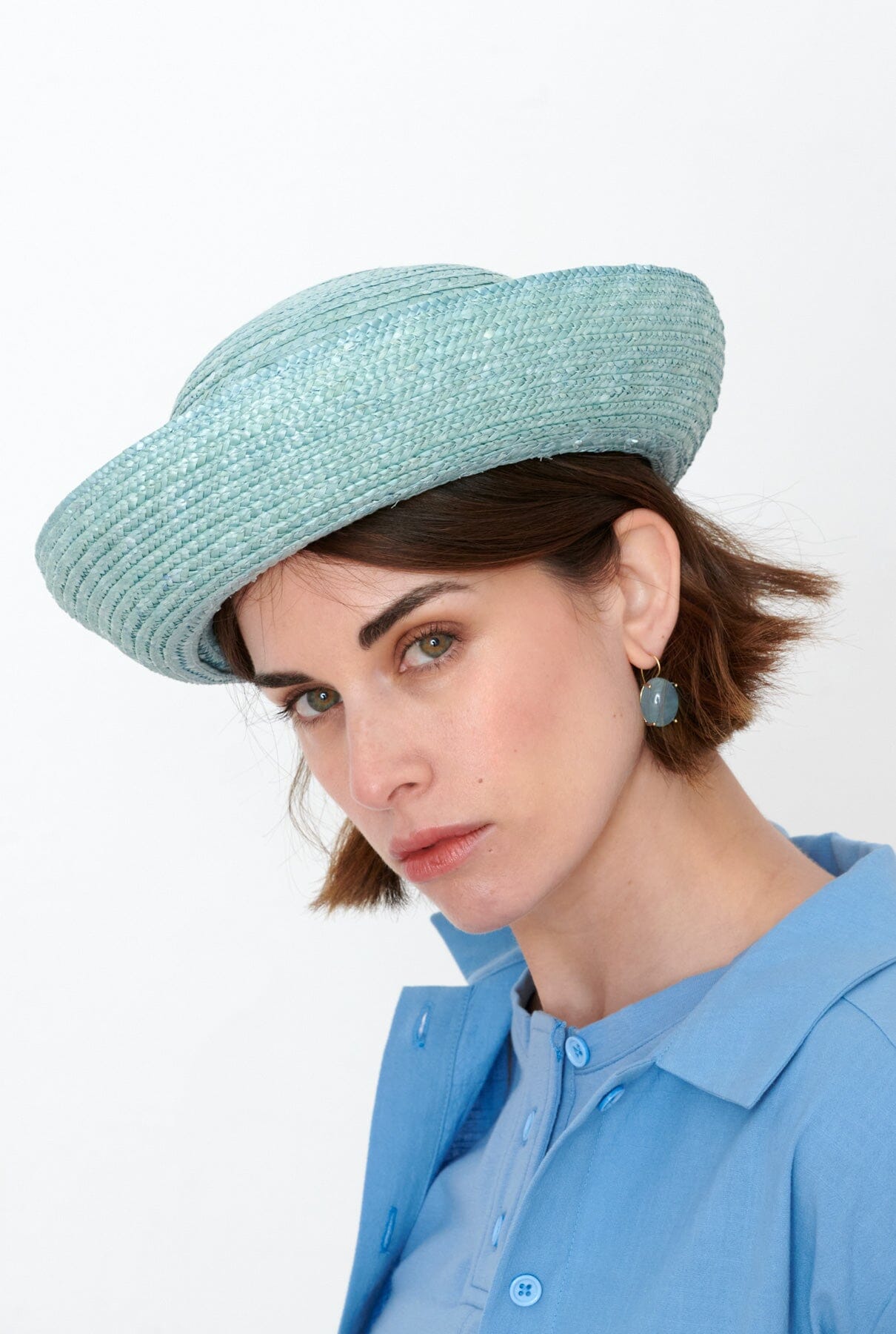Sombrero inspirado en el clásico sombrero marinero. Hecho de paja de trigo teñida en azul claro, es el accesorio perfecto para añadir un toque de estilo a tu look.