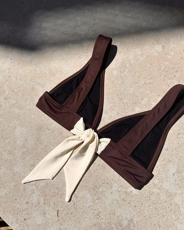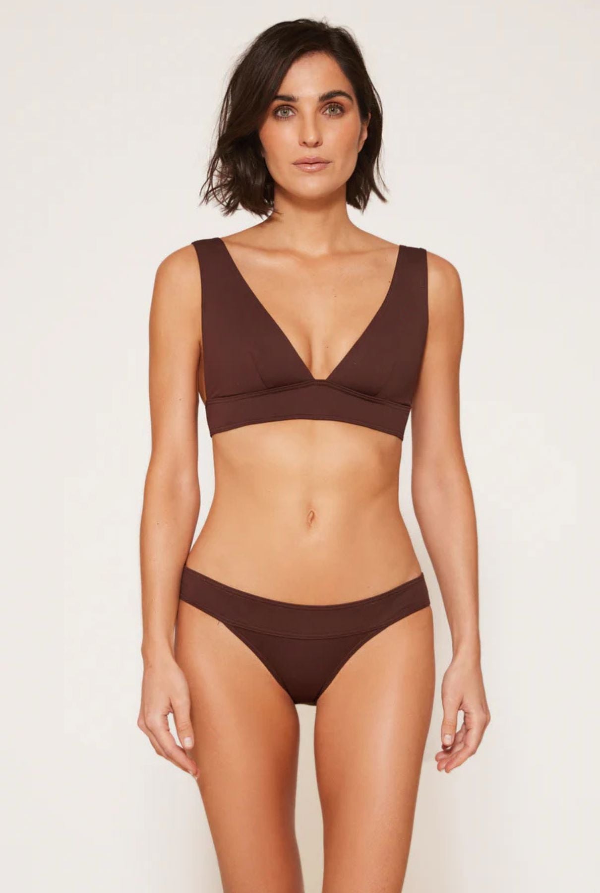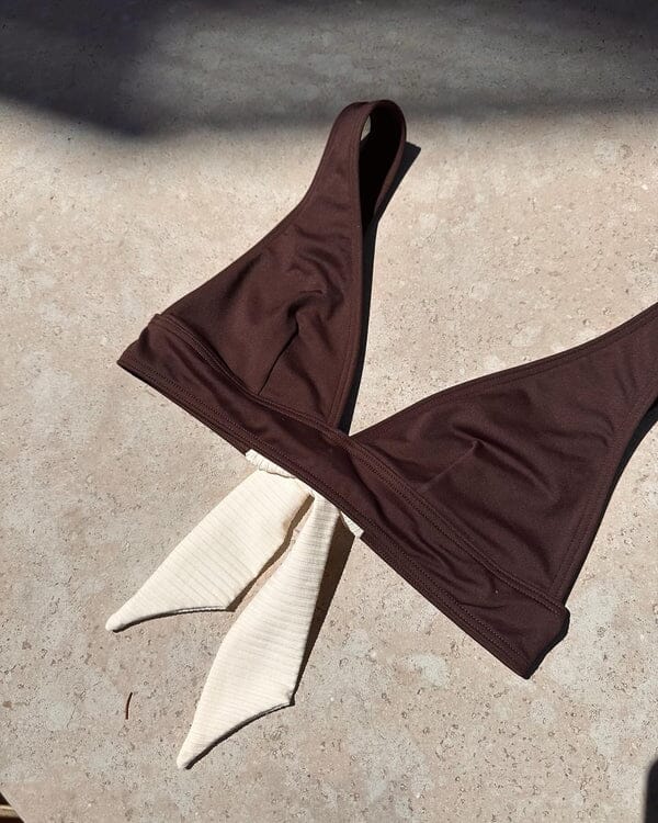Bikini triángulo cruzado, tirantes anchos y rectos con hombros fijos, banda ancha en pecho.
