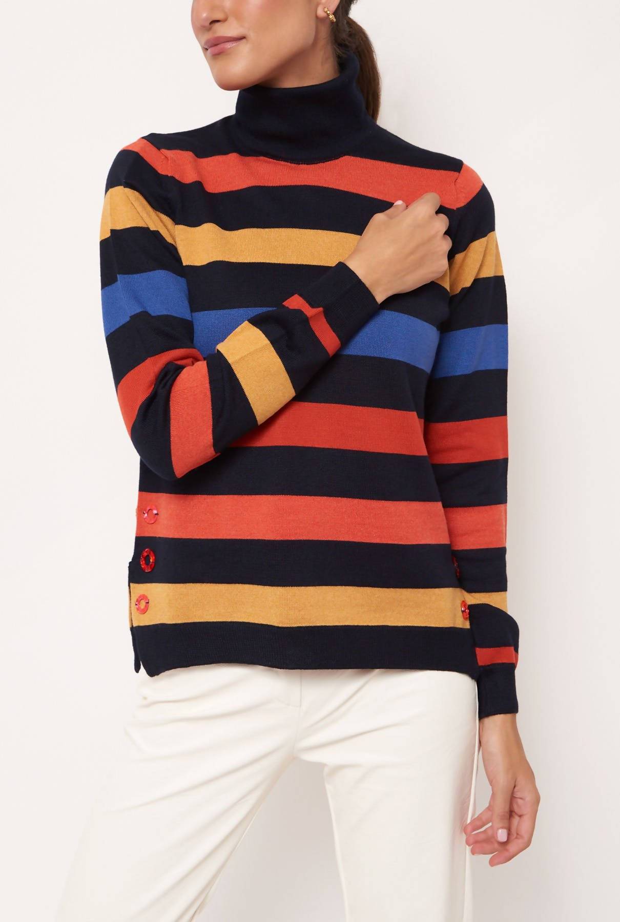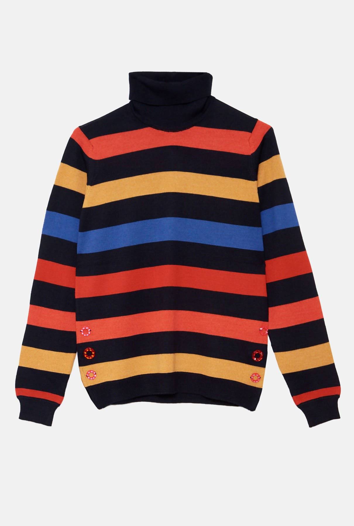 El suéter de cuello alto de Mariona es perfecto para la transición durante el día: te mantendrá abrigado en los días frescos de otoño, mientras que su ajuste y colores llamativos son perfectos para salir por la noche. También tiene unos apliques de colores bordados en el lateral. Los apliques son vintage y los encuentra Laia en tiendas Vintage que hacen que cada pieza sea única. Diseñado por Laia Alen
