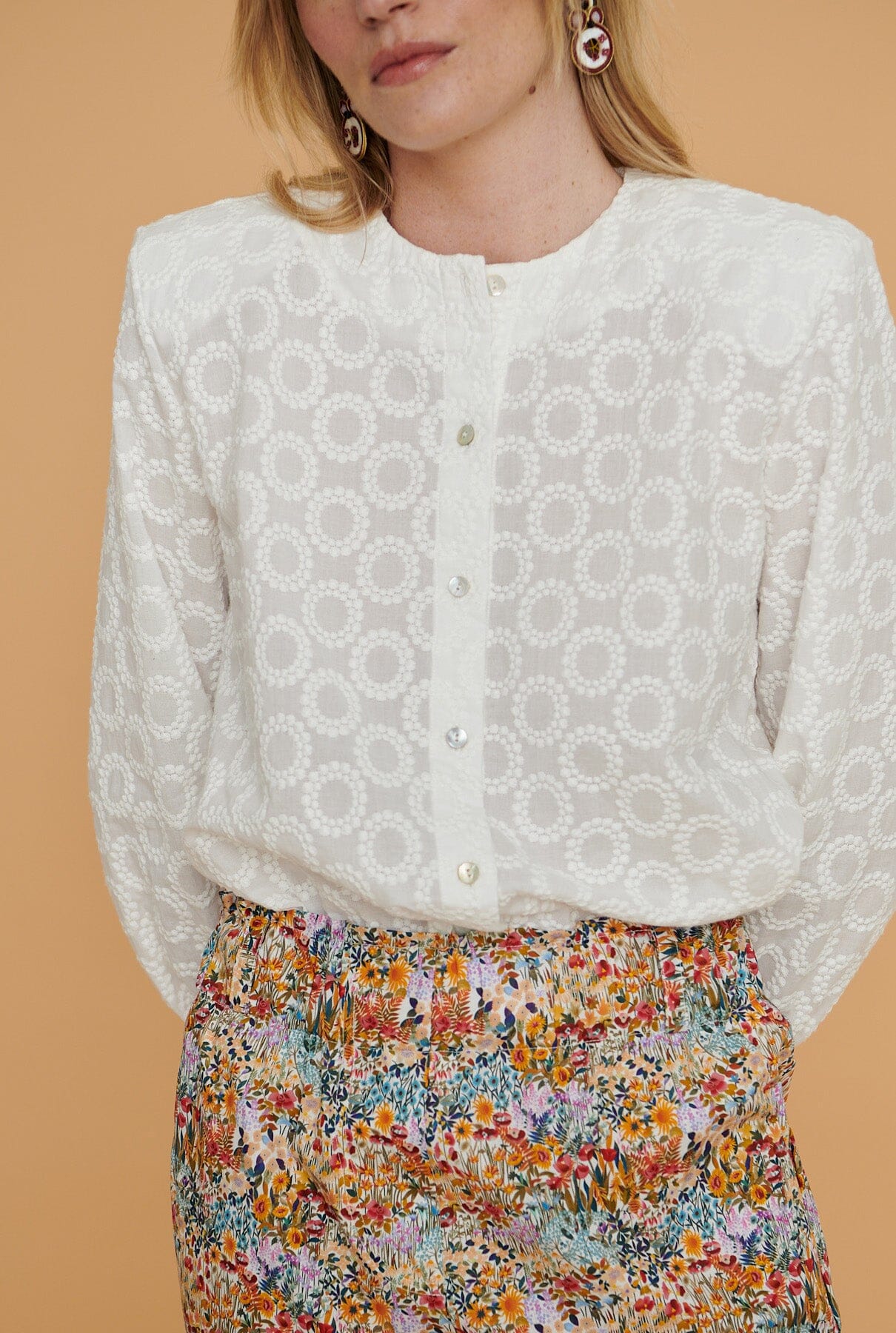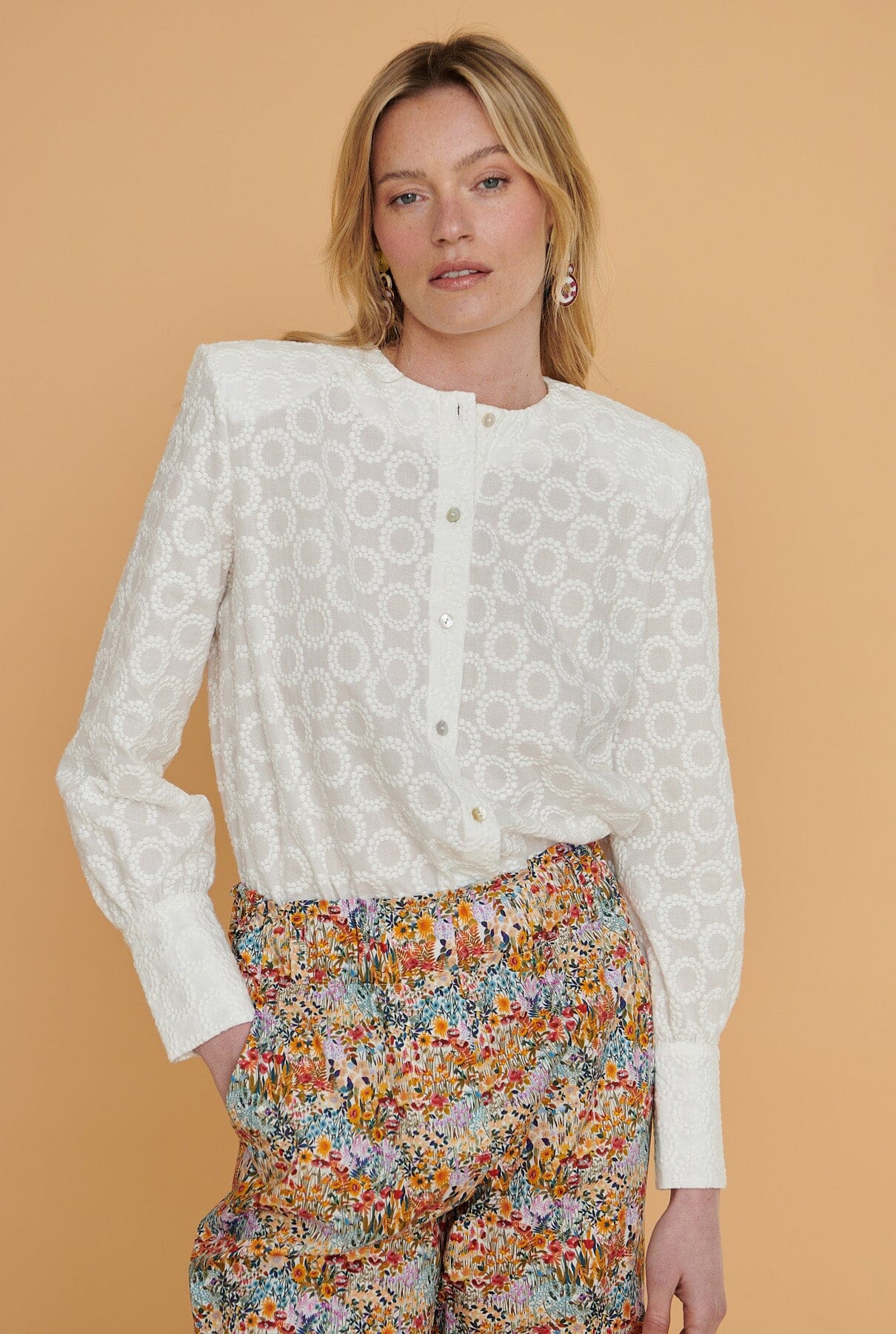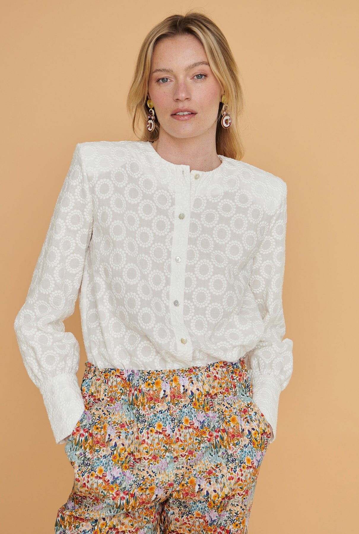 Camisa de manga larga en tejido de algodón blanco bordado. Cierre frontal con botones de nácar. Para un look completo se puede combinar con infinidad de pantalones, es una camisa de fondo de armario muy versátil.