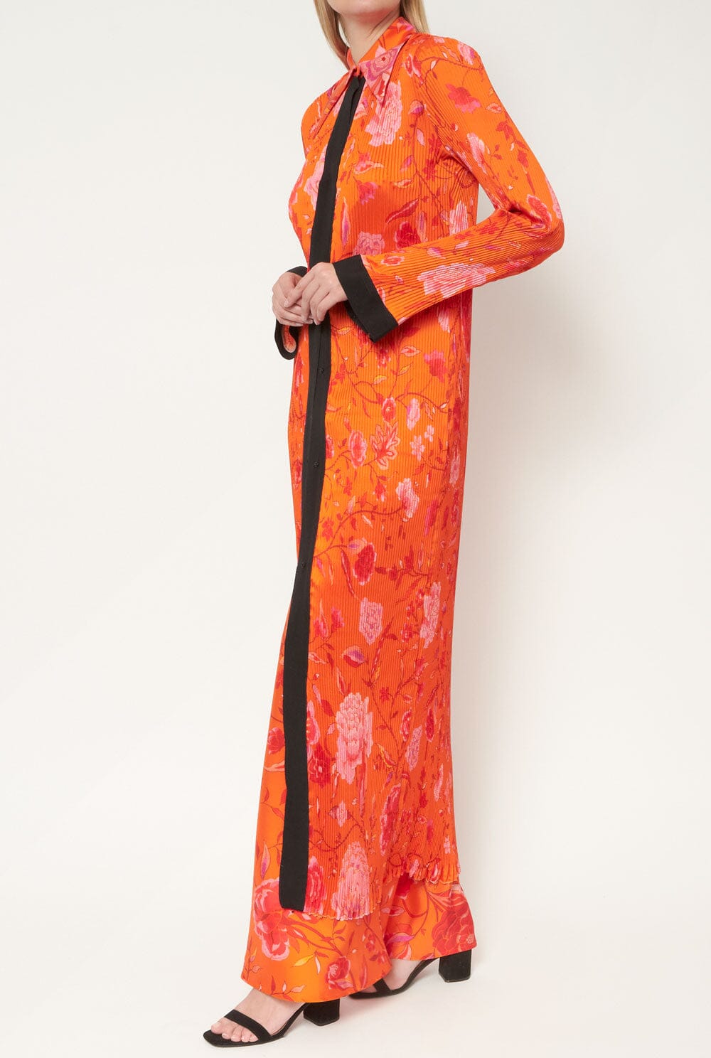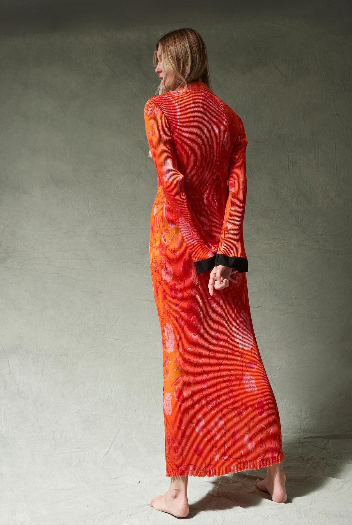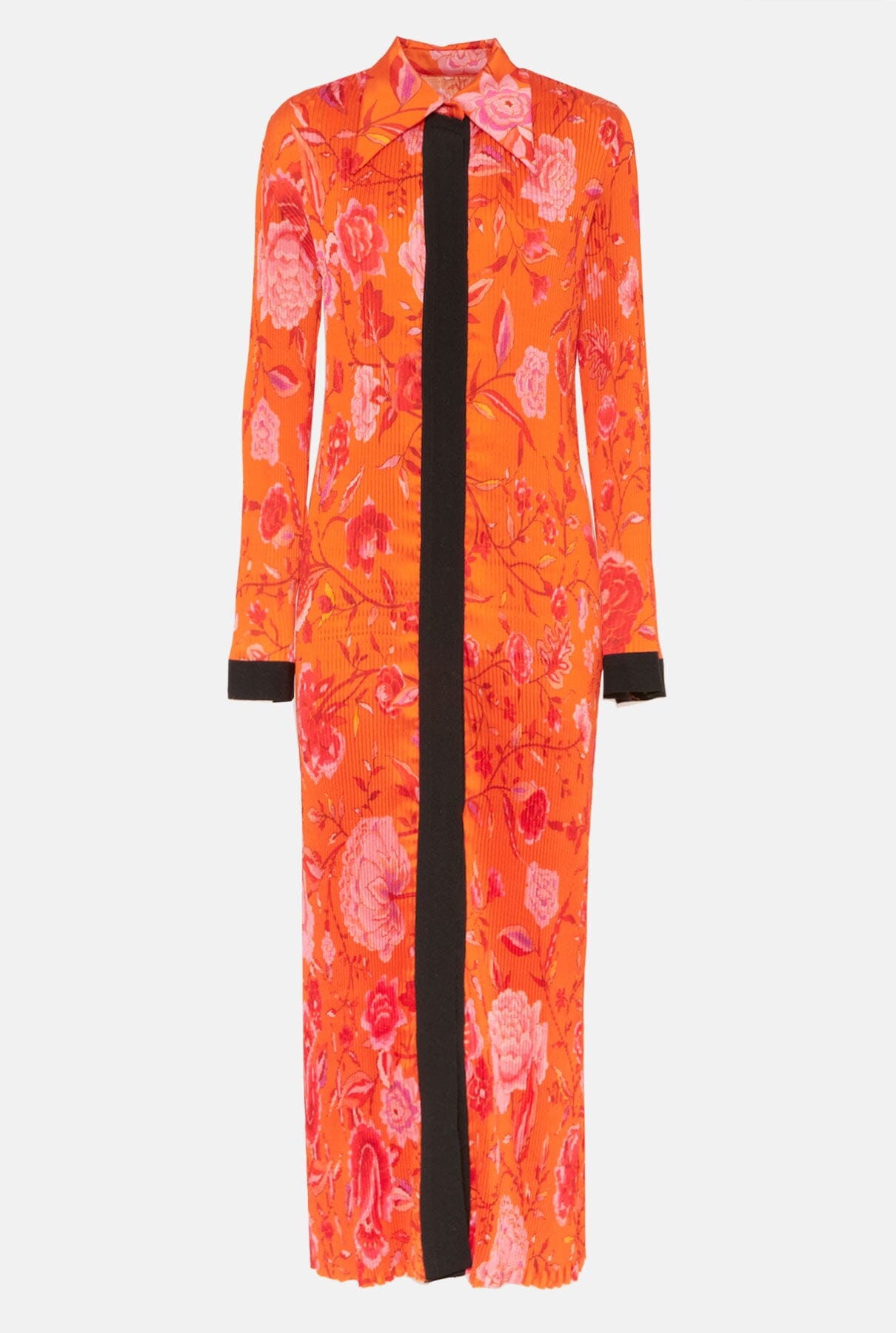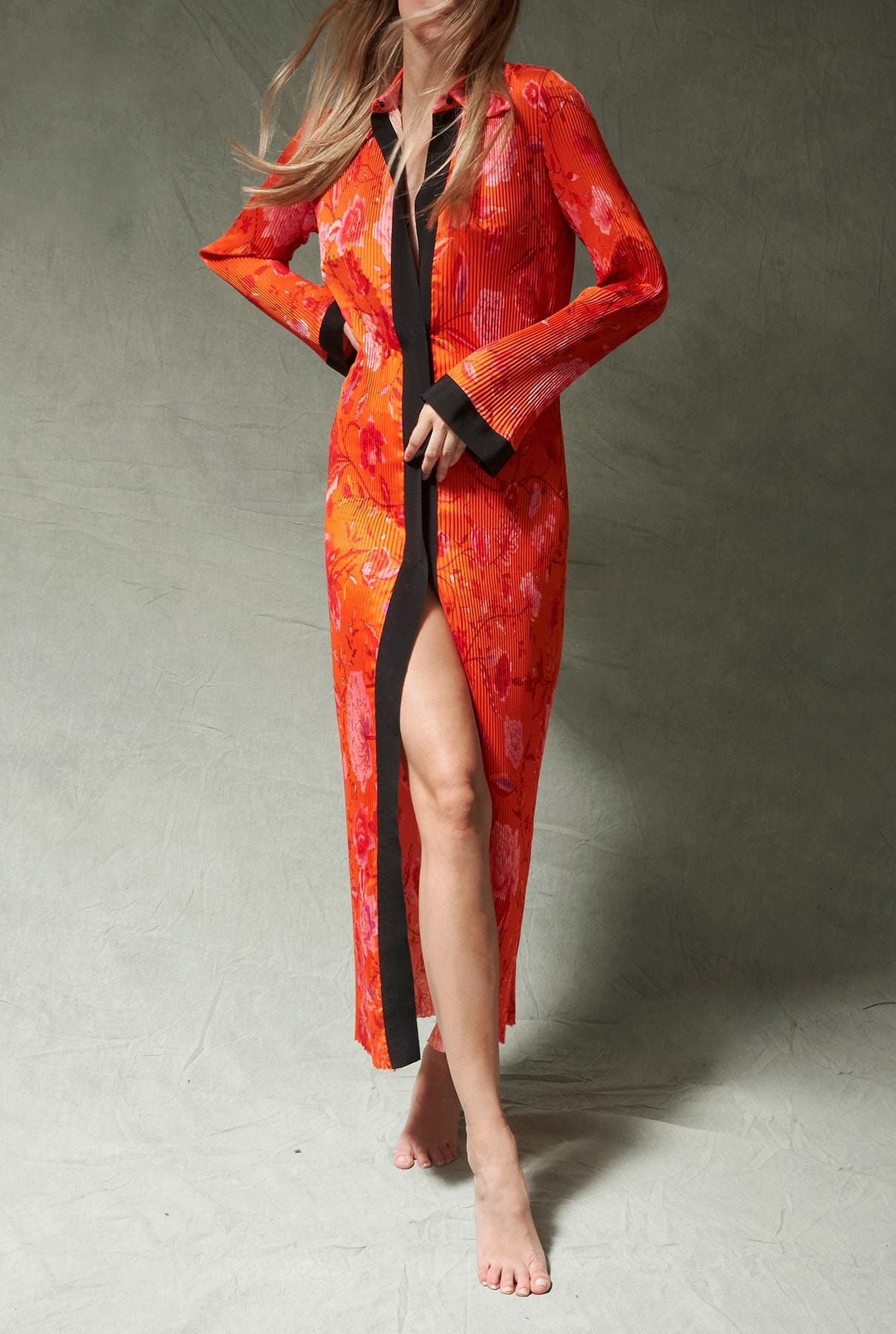 Vestido camisero largo o camisero plisado con cuello retro y tira de grosgrain en contraste en tapeta y puños. Se cierra con botones de presión de metal negro. Diseñado por Juan Vidal.