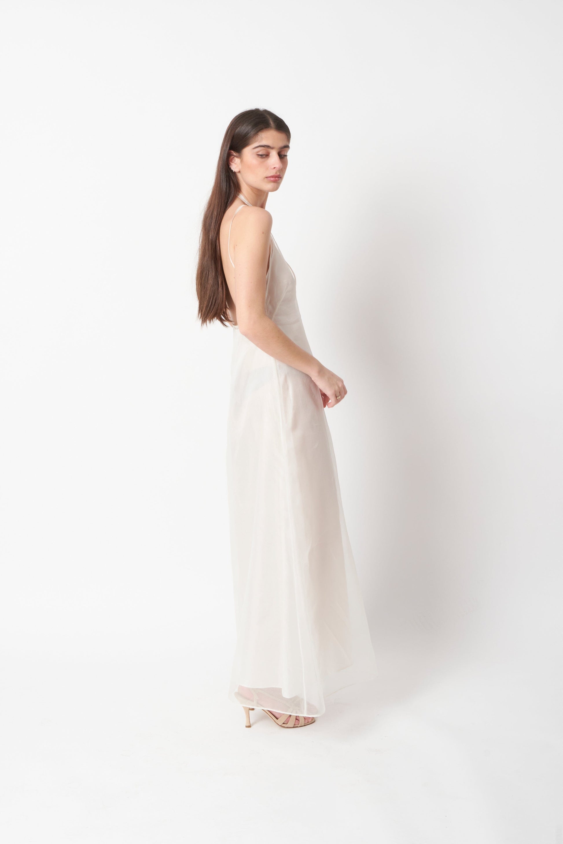 MAXI VESTIDO CON CAPELINA EN ORGANZA DE SEDA