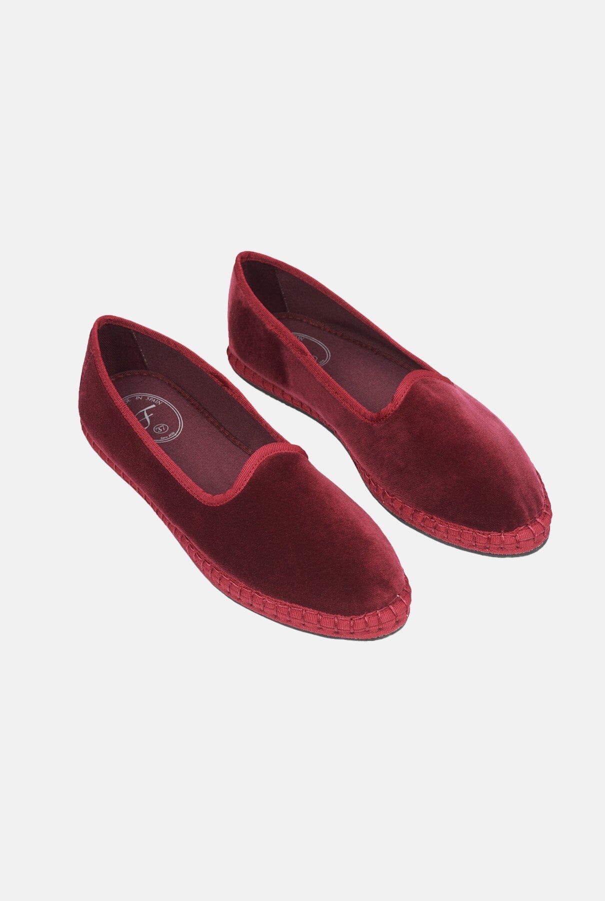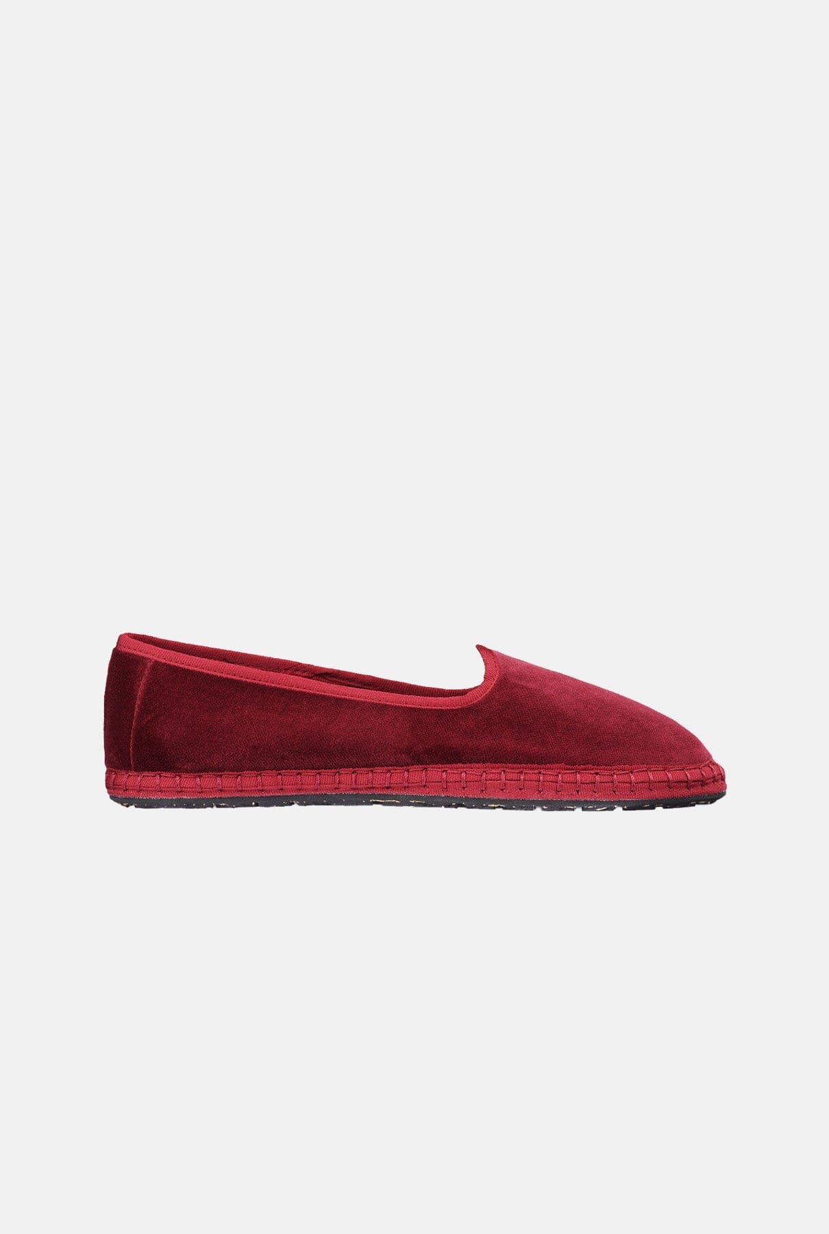 Zapatilla de terciopelo burdeos con ribetes burdeos. El exterior del zapato es 100% terciopelo de algodón, y el interior del zapato es 100% algodón ecológico con tratamiento antibacteriano. La suela está hecha de caucho procedente de neumáticos de bicicleta reciclados.
