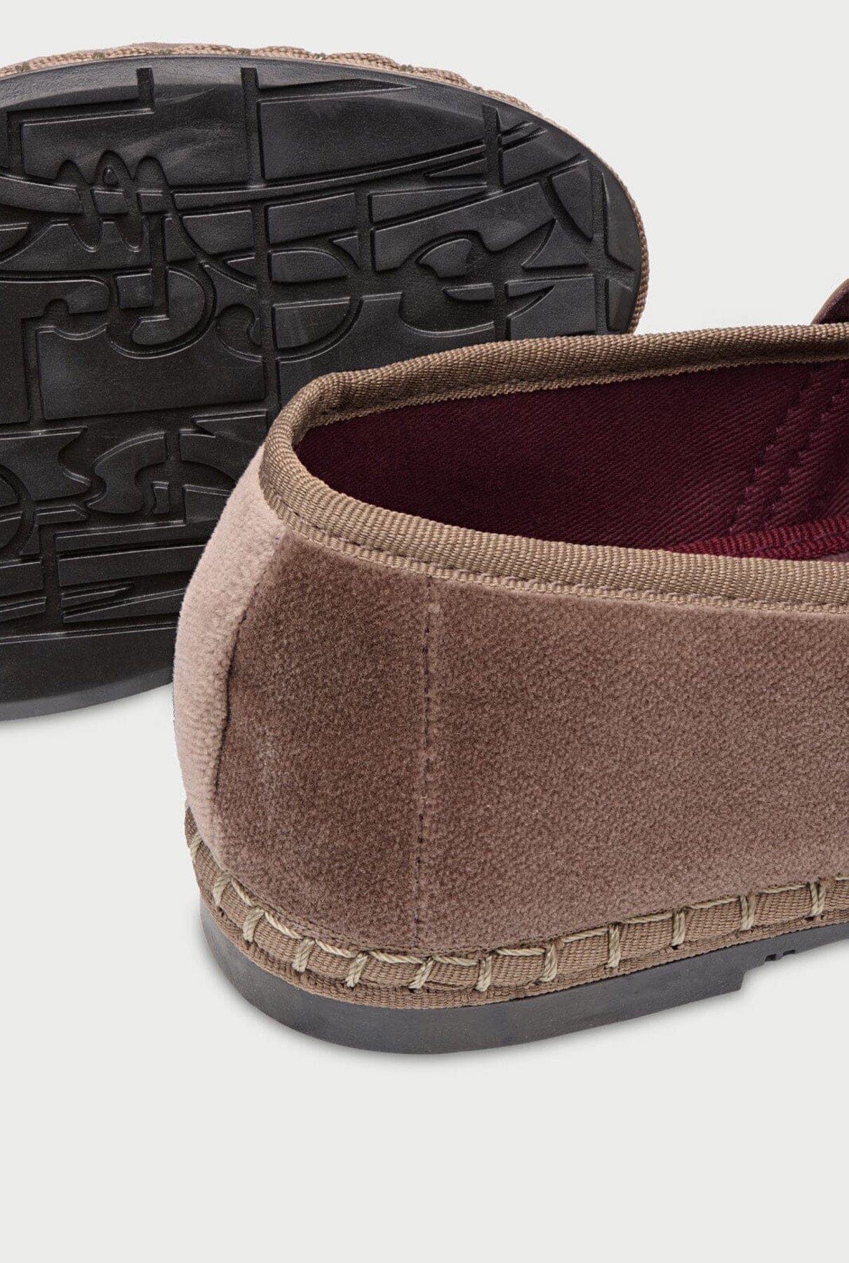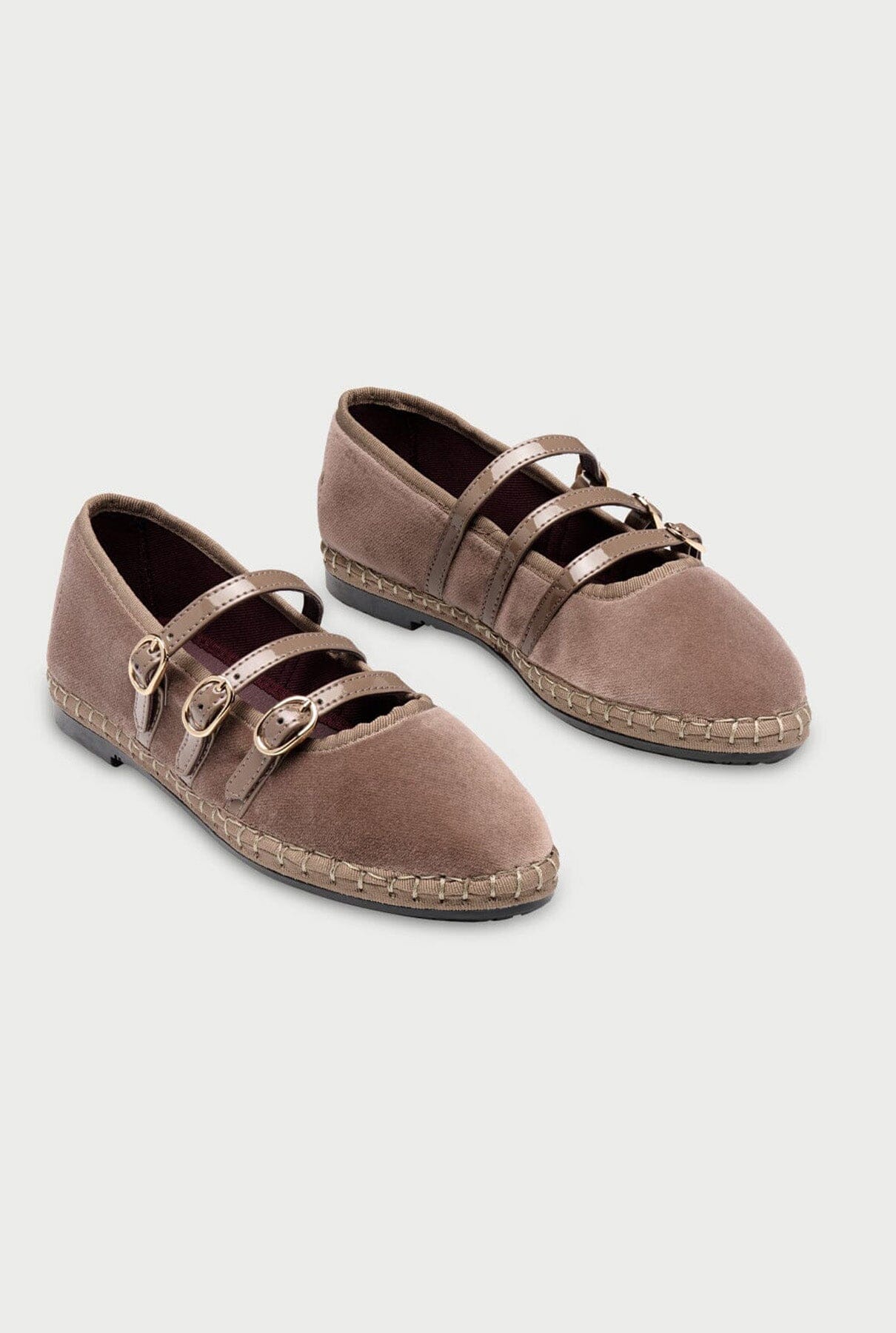 Mary Jane de triple tira de terciopelo en color marrón con ribete marrón y cierre de hebilla.