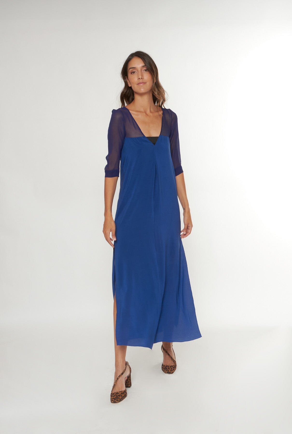 Vestido de manga larga confeccionado en georgette transparente 100% seda, parte colocada en el hombro y la espalda del vestido. La parte delantera es de escote en V y la parte inferior es de sarga de seda.