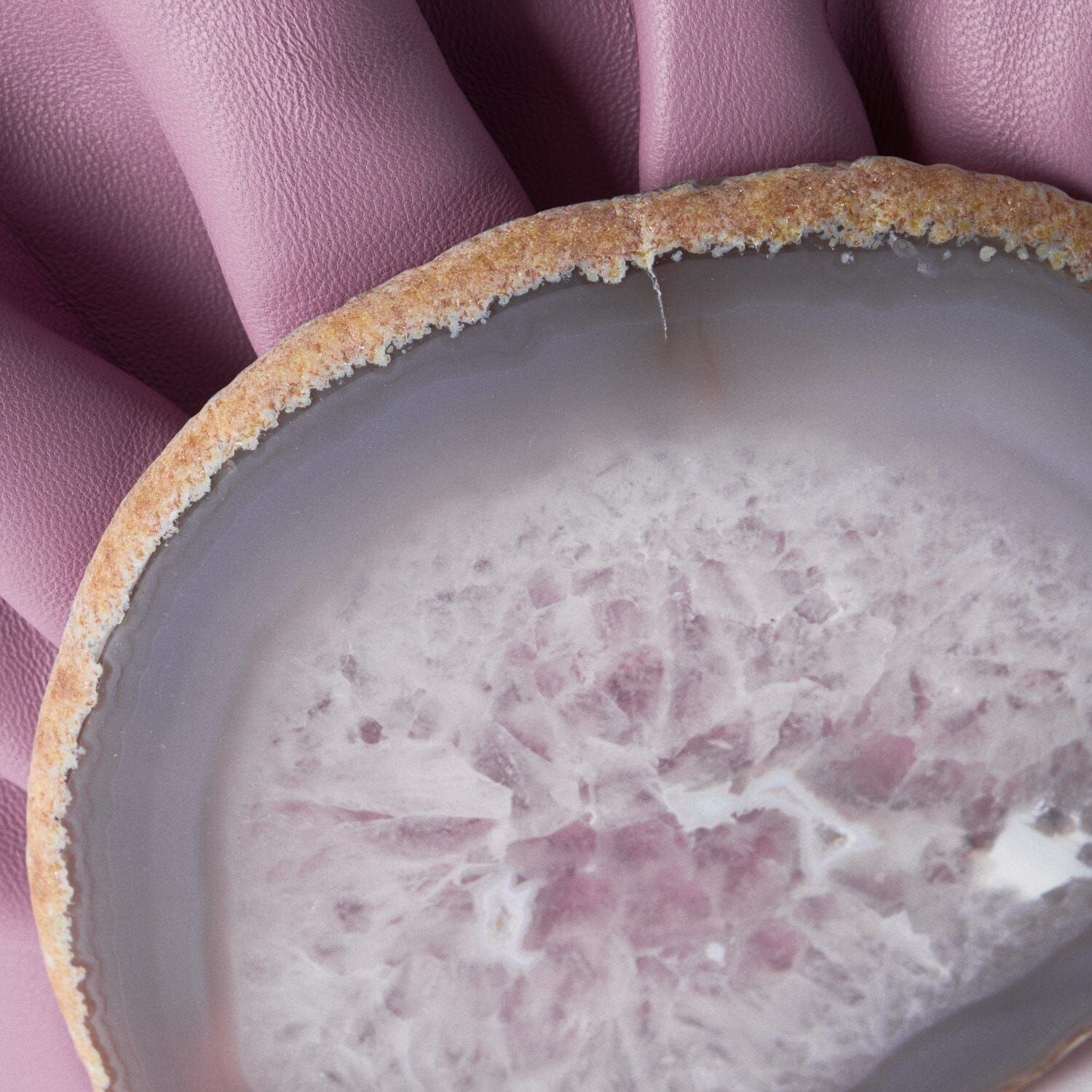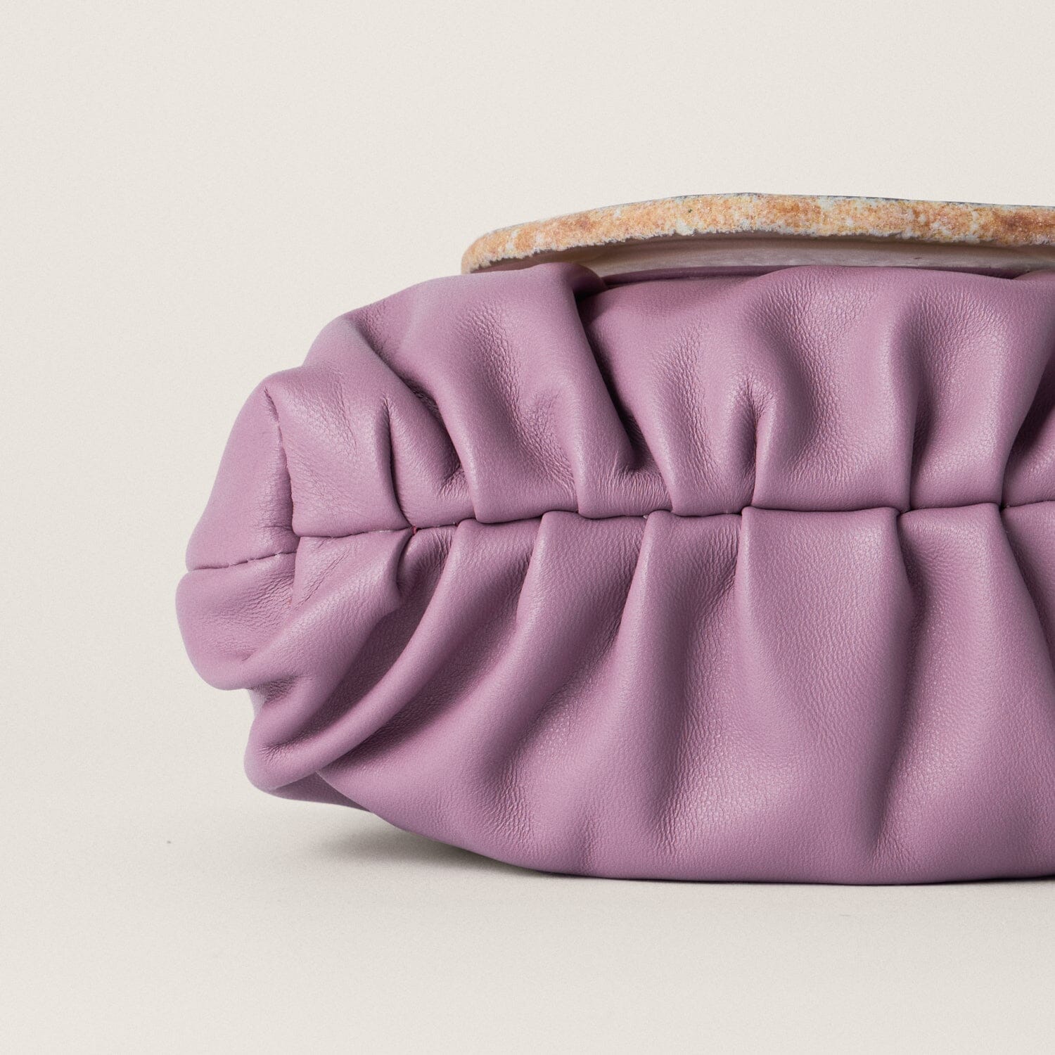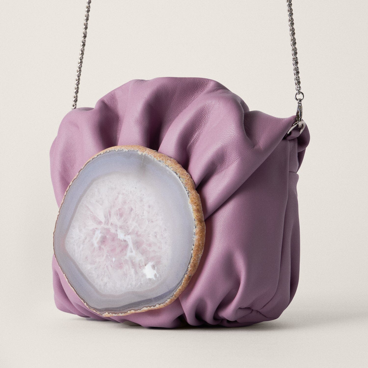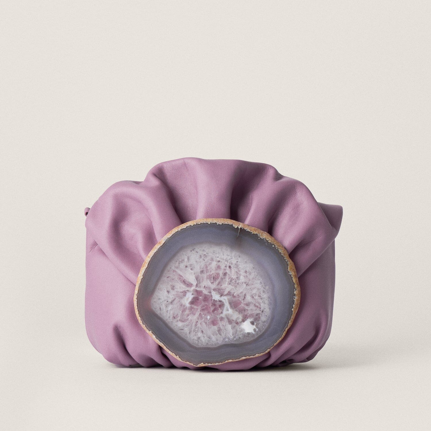 Clutch mediano con estructura fruncida, elaborado en napa de cordero española extremadamente suave y agradable. En su cierre incorpora una pieza de ágata natural, única y exclusiva para cada bolso, seleccionada por nuestro equipo de diseño, por lo que difiere de las que aparecen en las imágenes de nuestra web.