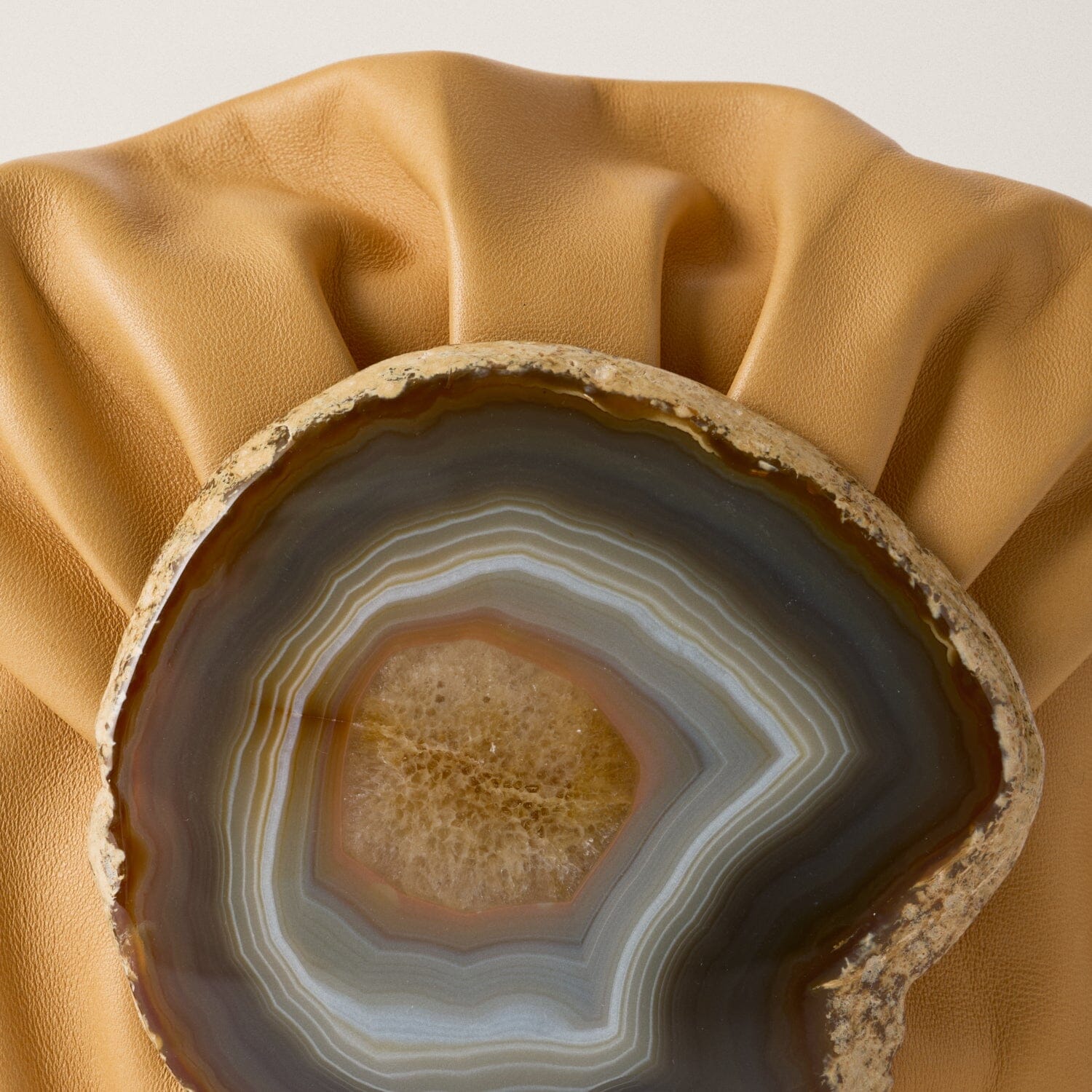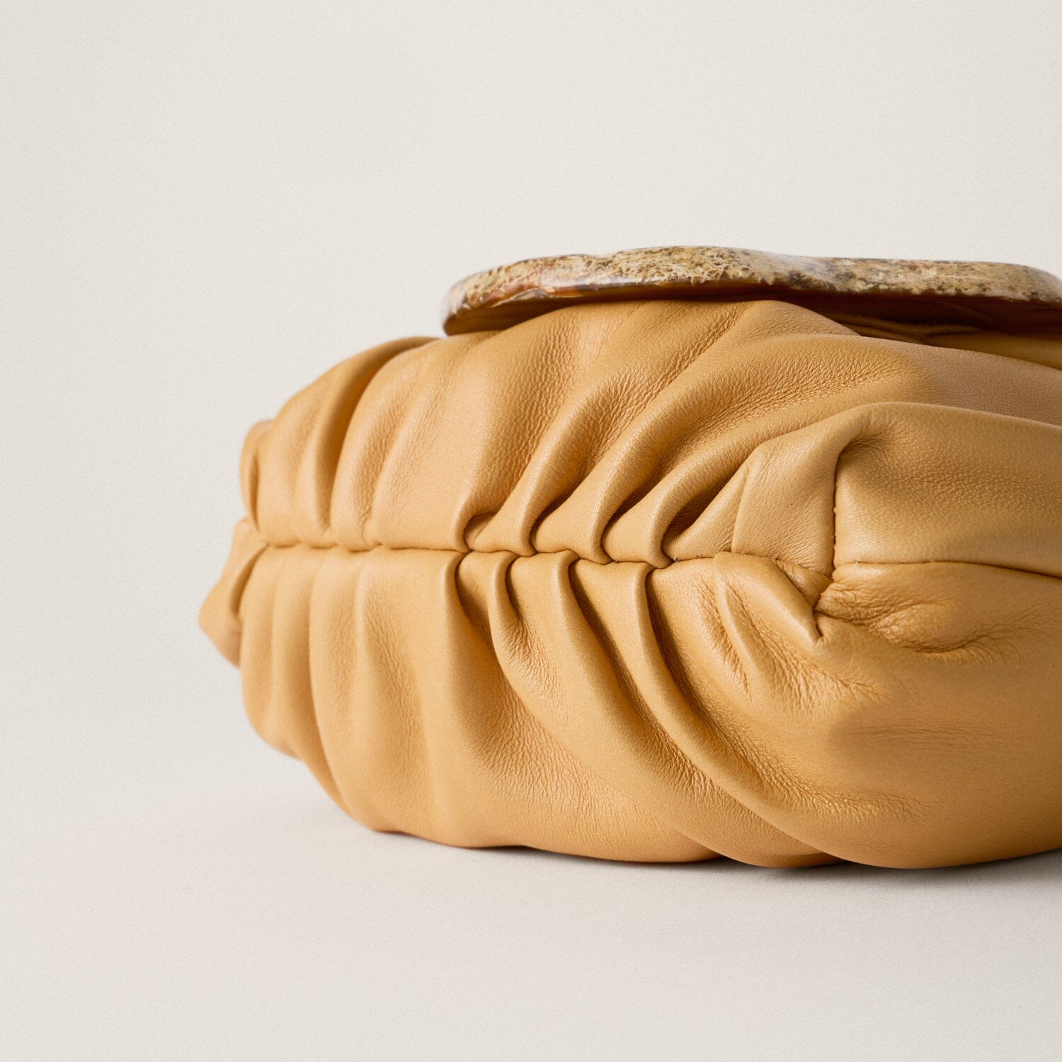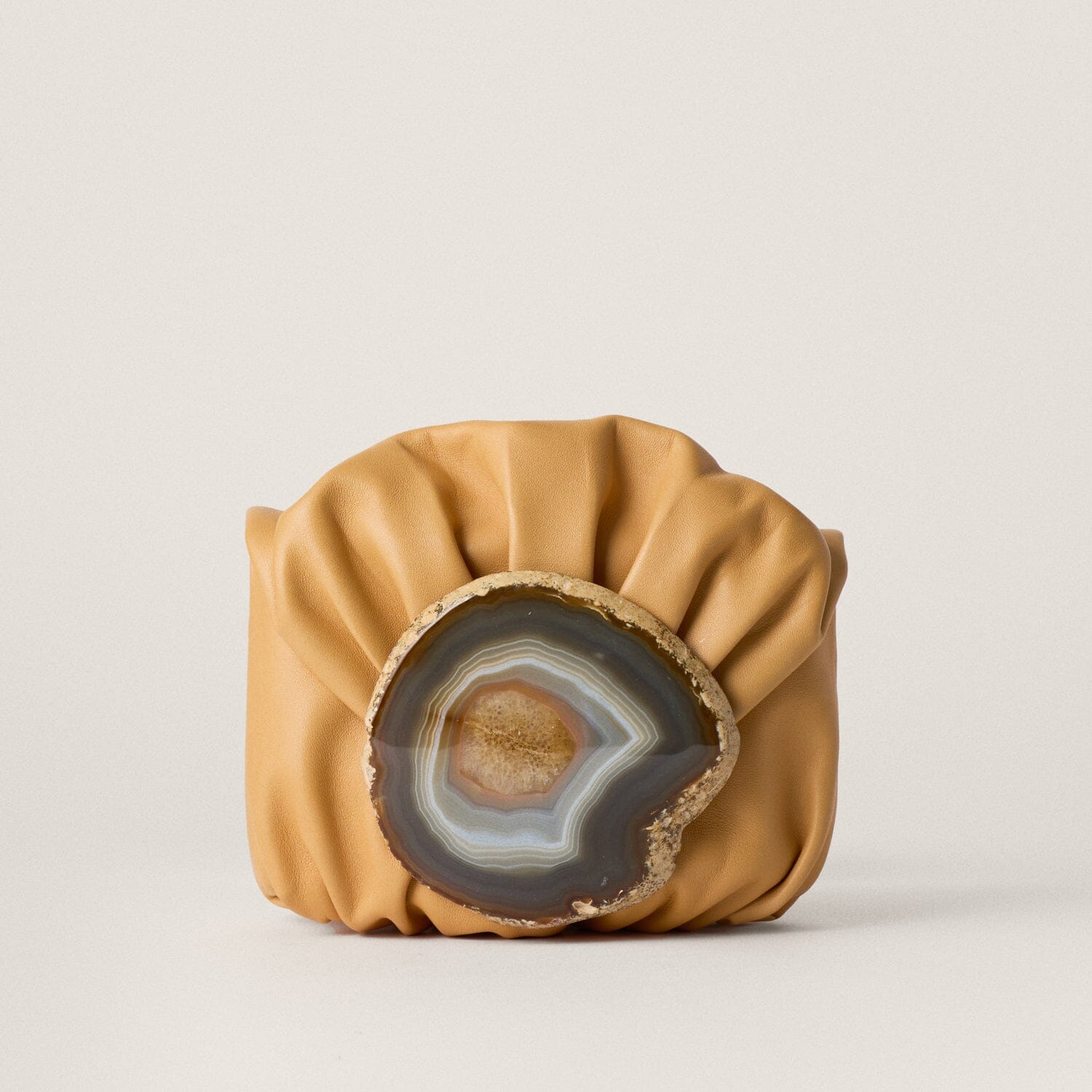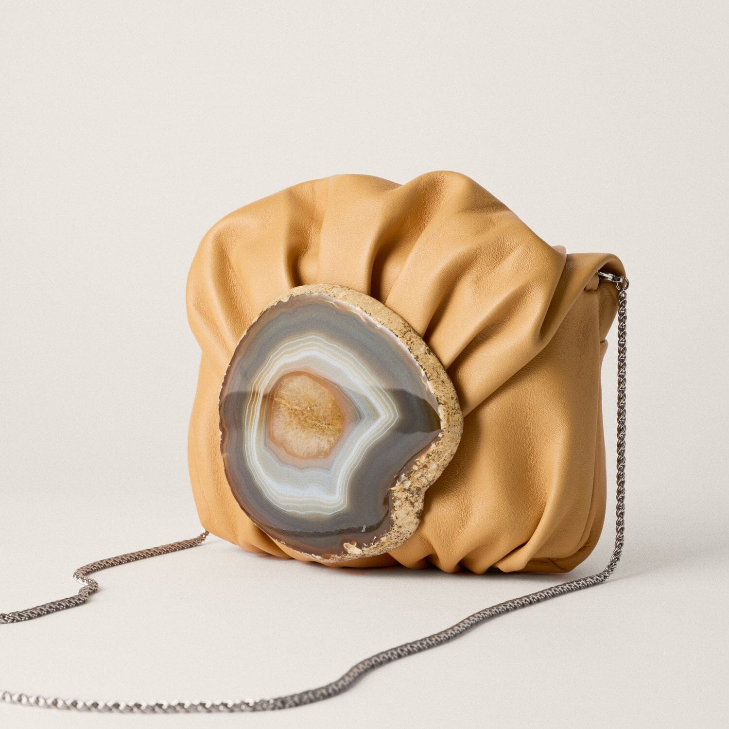 Clutch mediano con estructura fruncida, elaborado en napa de cordero española extremadamente suave y agradable. Su cierre incorpora una pieza de ágata natural, única y exclusiva para cada bolso, seleccionada por nuestro equipo de diseño, por lo que difiere de las que aparecen en las imágenes de nuestra web. Si lo desea, podemos proporcionarle una foto previa antes de comprar online. El cierre es magnético y tiene un pequeño bolsillo interior.