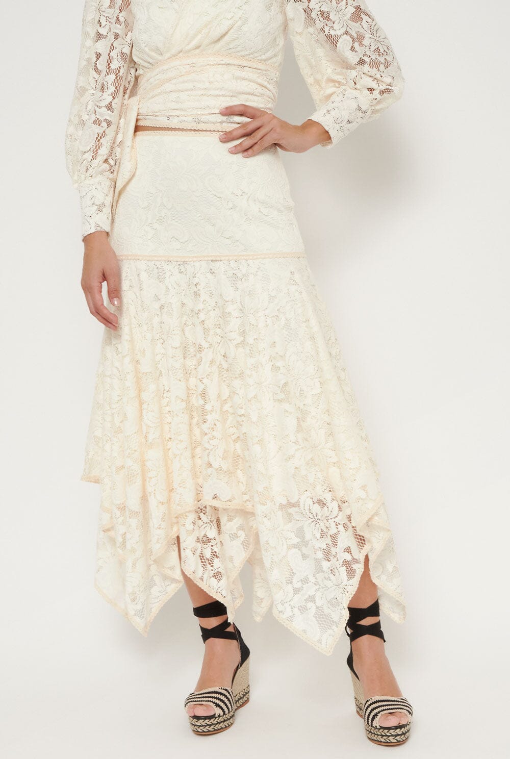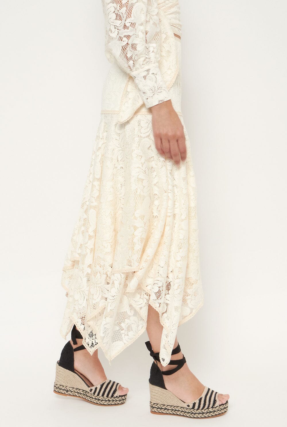 La falda Mira está confeccionada con encaje floral en un diseño de largo midi rematado con picos. Corte a la cadera y cierre de cremallera oculta en la espalda. Detalles de pasamanería tono sobre tono. Revestimiento interior.