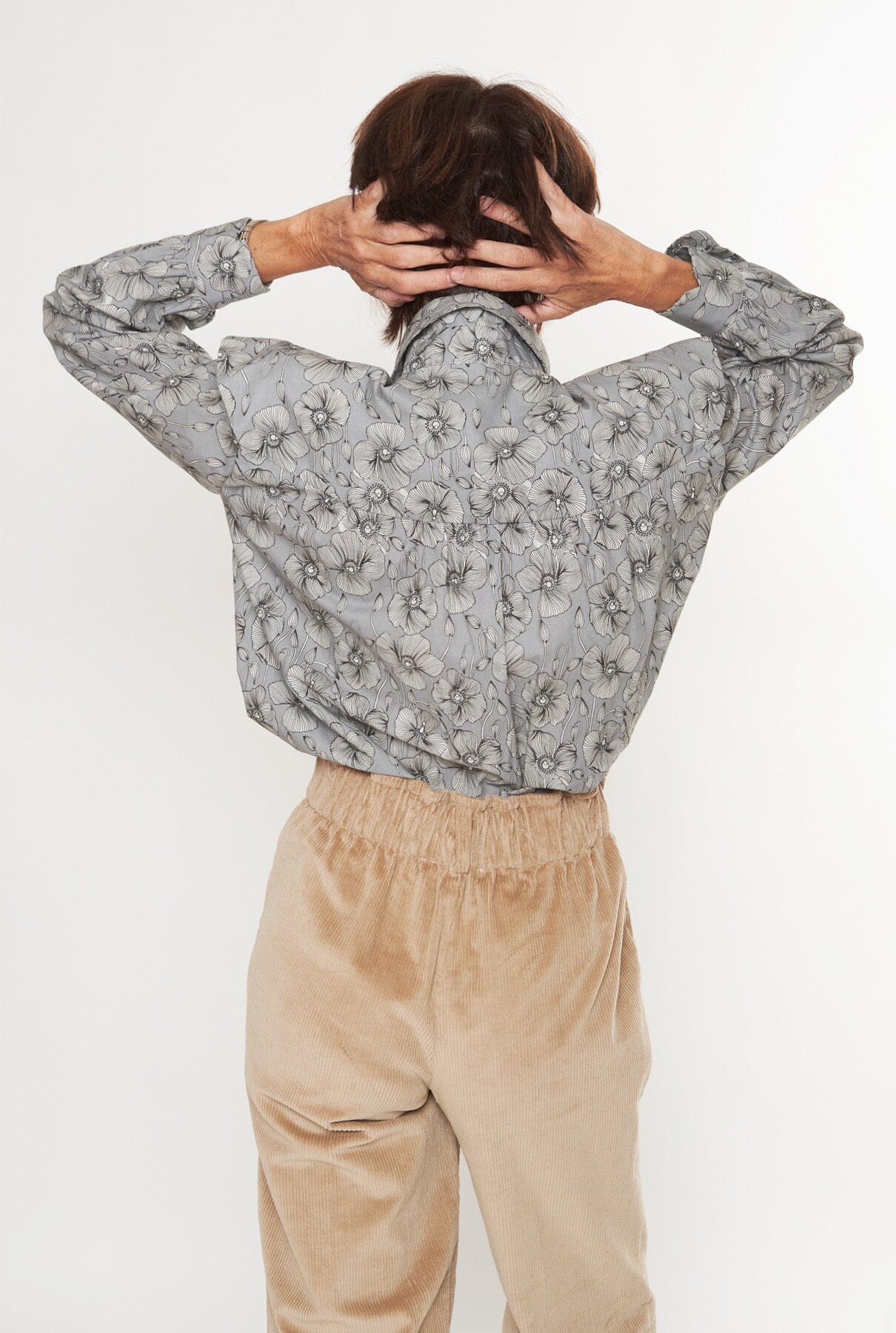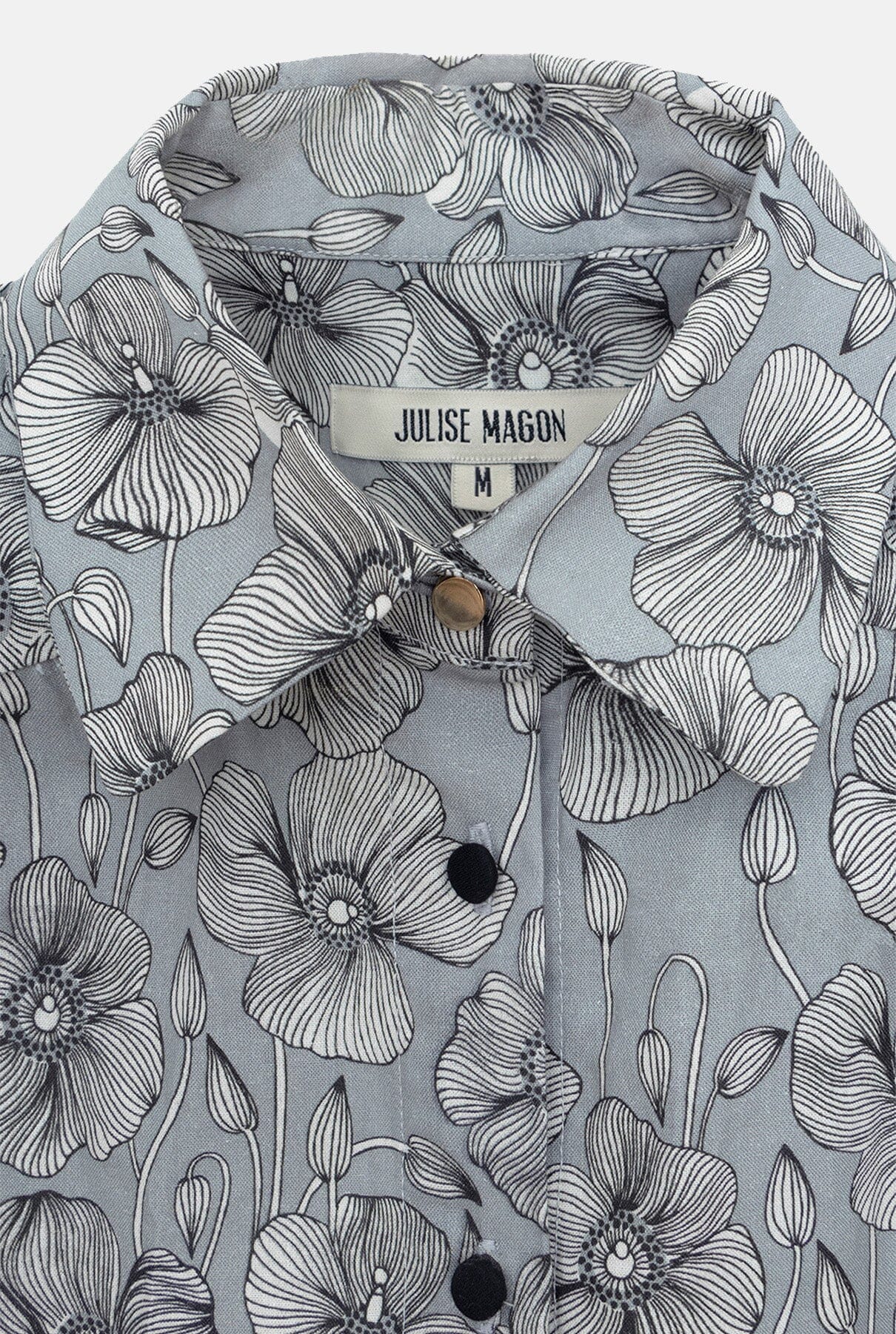 Camisa de manga larga de algódón con estampado de flores. Botones forrados en negro a contraste. Inspirada en nuestra icónica camisa Marieta, cuenta con detalle de volado redondeado en el hombro y puños con acabado en ondas. Detalle de botón dorado en cuello.