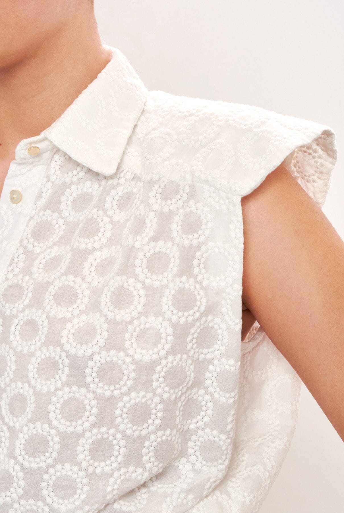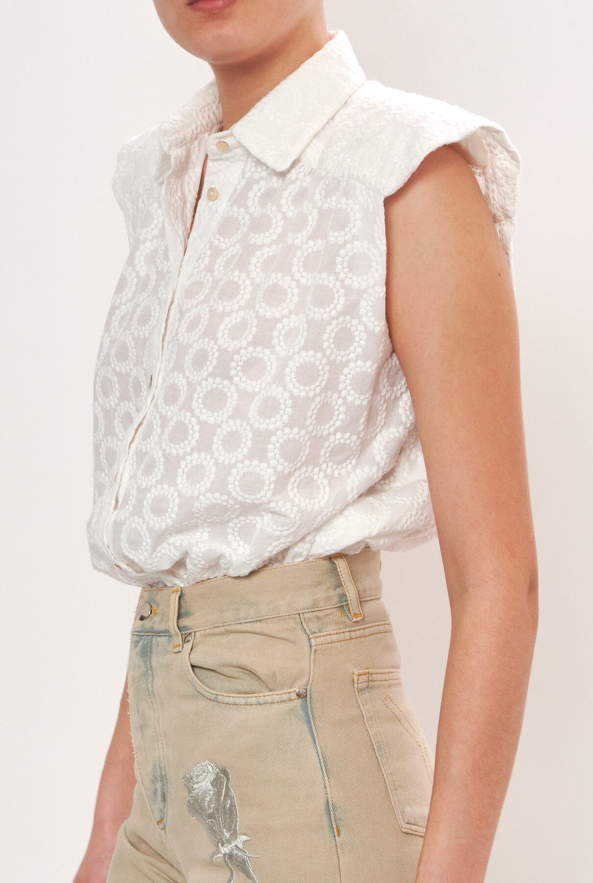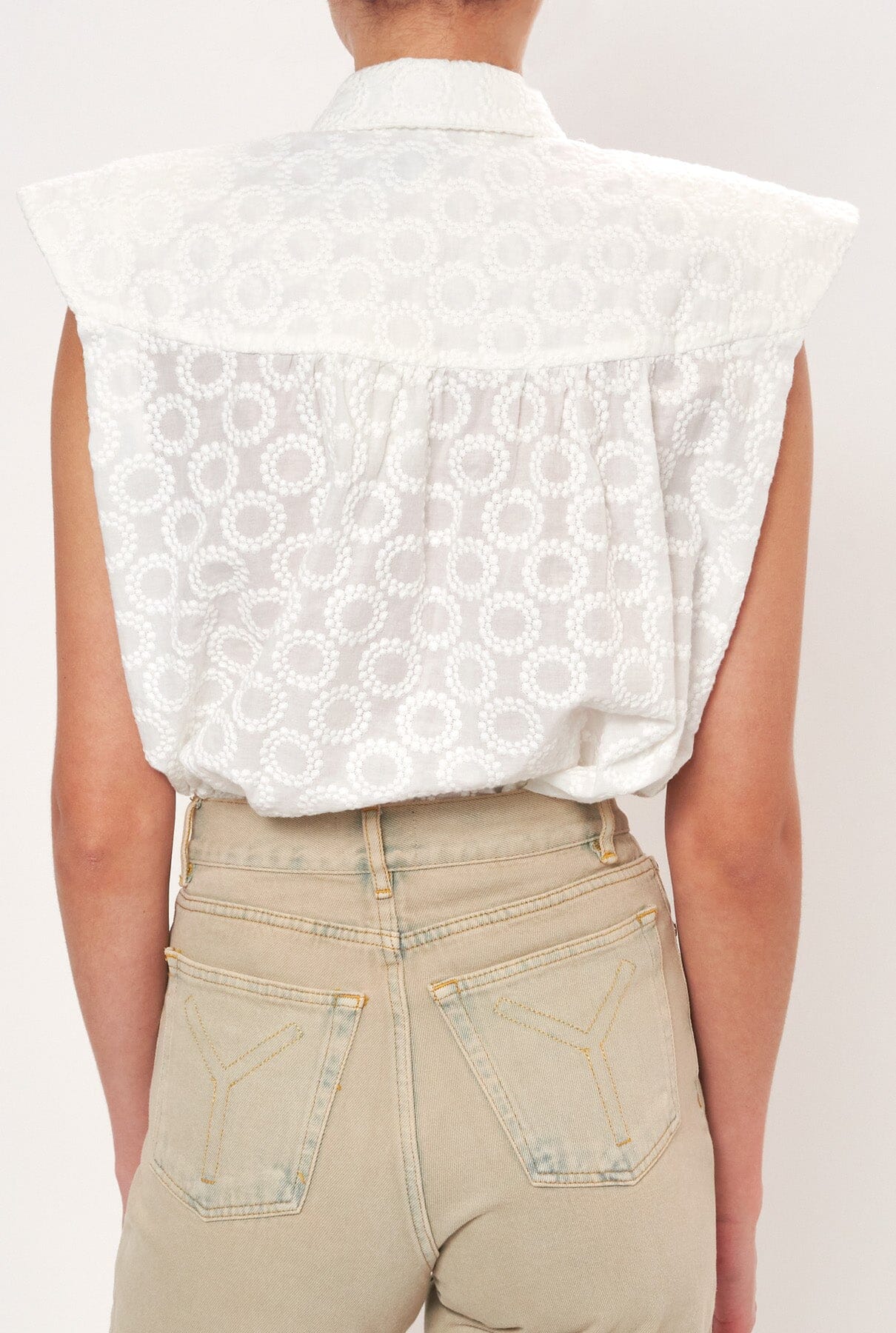 Versión sin mangas de nuestra camisa Miru en tejido de algodón bordado en color blanco. Con botones de nácar en la parte delantera y botones dorados en el cuello. Con hombreras. Para un look completo se puede combinar con infinidad de pantalones, es una camisa de fondo de armario muy versátil.