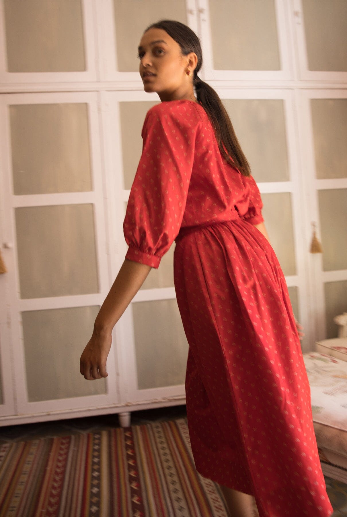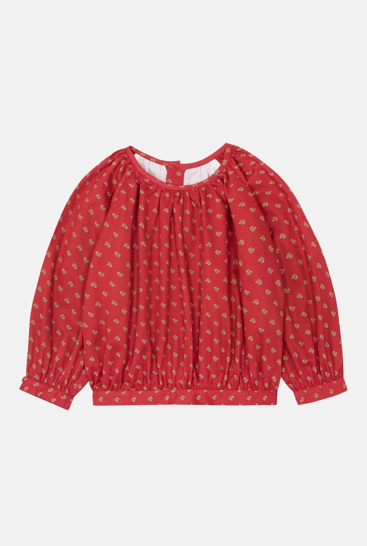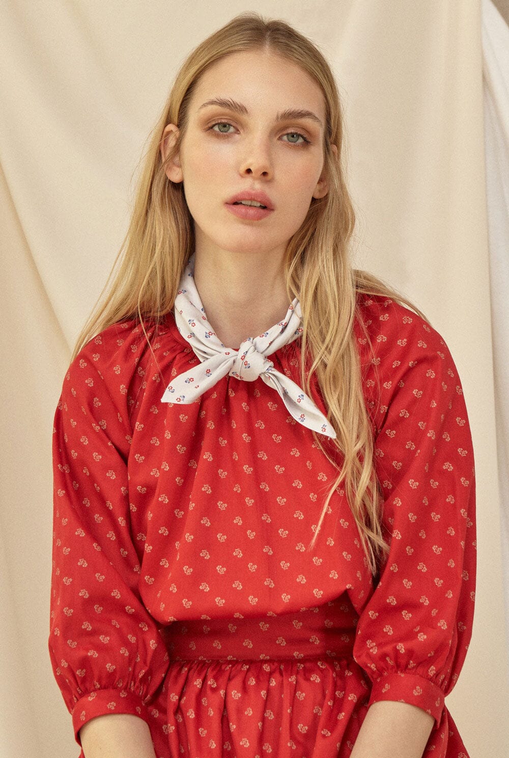 Blusa roja de popelina de algodón con estampado de flores y manga francesa.