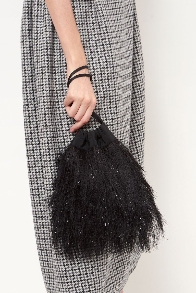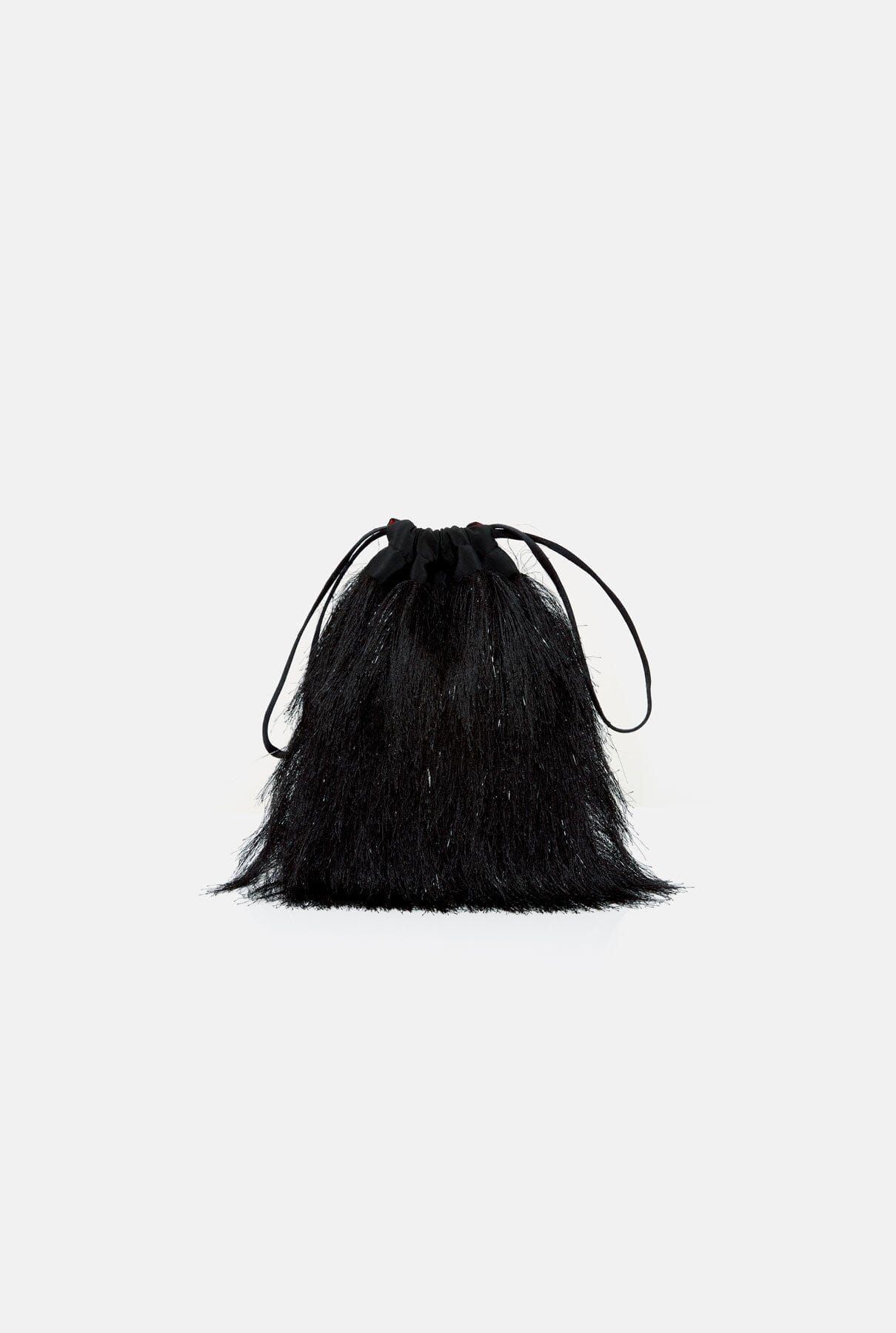 Este bolsito adornado con una delicada tela negra con flecos tiene un tacto suave y una forma sencilla con cierre de cordón para un cierre fácil. Es el toque perfecto para tus eventos de noche. Diseñado por Laia Alen.